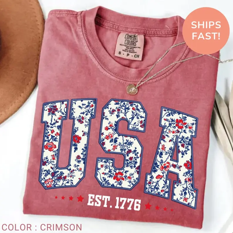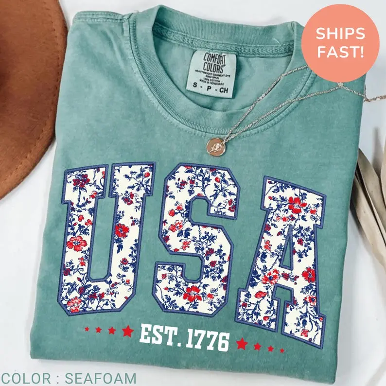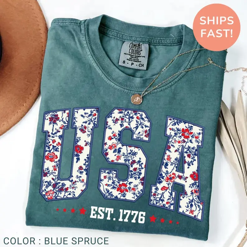 5. Comfort Colors Floral USA Shirt, American Girl Shirt, USA Est 1776 Shirt, Girly 4th of July Shirt, Patriotic Women Shirt, Flower USA Shirt