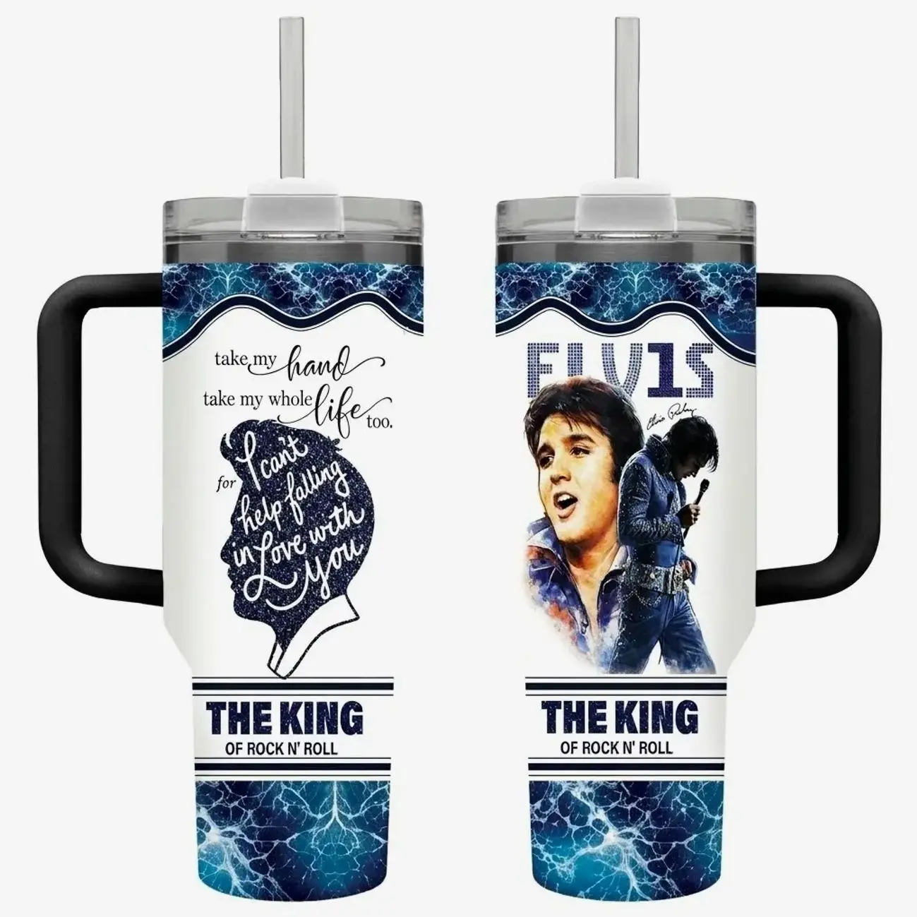 Vintage Elvi P Blue 20oz 40oz Tumbler With Handle, Rock And Roll Tumbler 40oz Large Handle Mug, Hot & Cold Insulated Cup