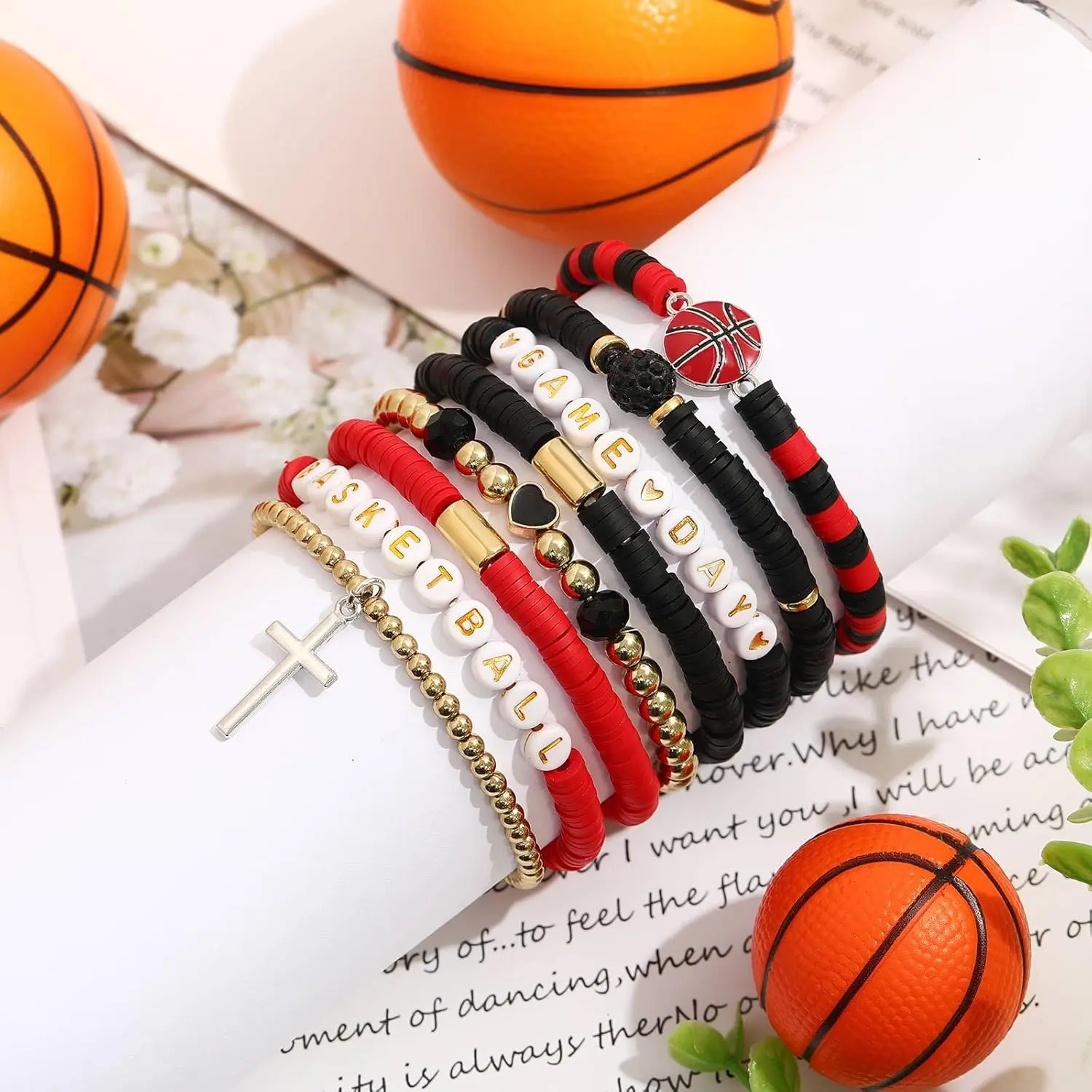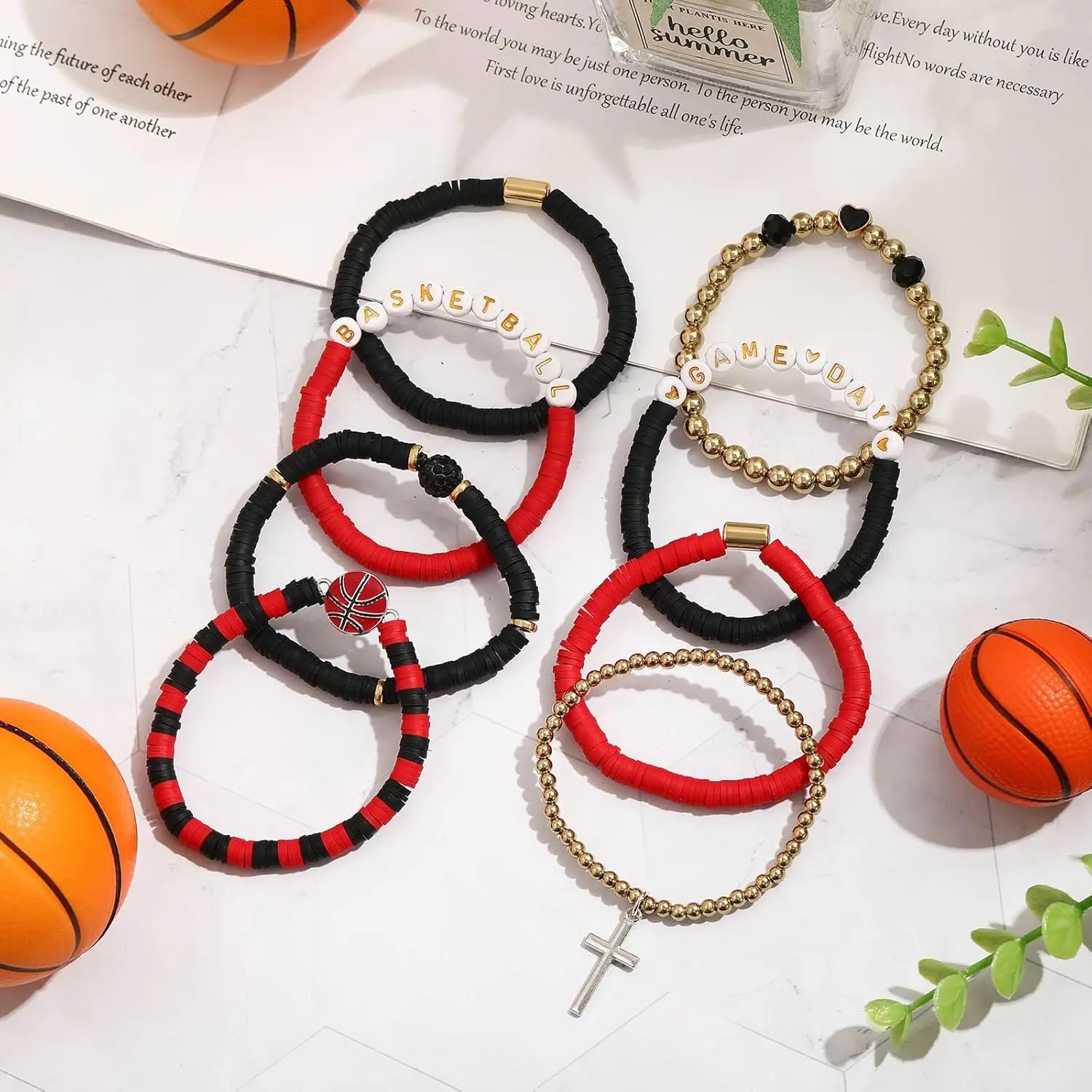 ✨ Perfect for Basketball Fans! This set includes 8 pcs of Heishi Clay Beaded Stretch Bracelets. Ideal for basketball moms and fans, these bracelets are great accessories and gifts. Each bracelet features unique designs like "GAME DAY" and "BASKETBALL" beads. Perfect for game day celebrations.