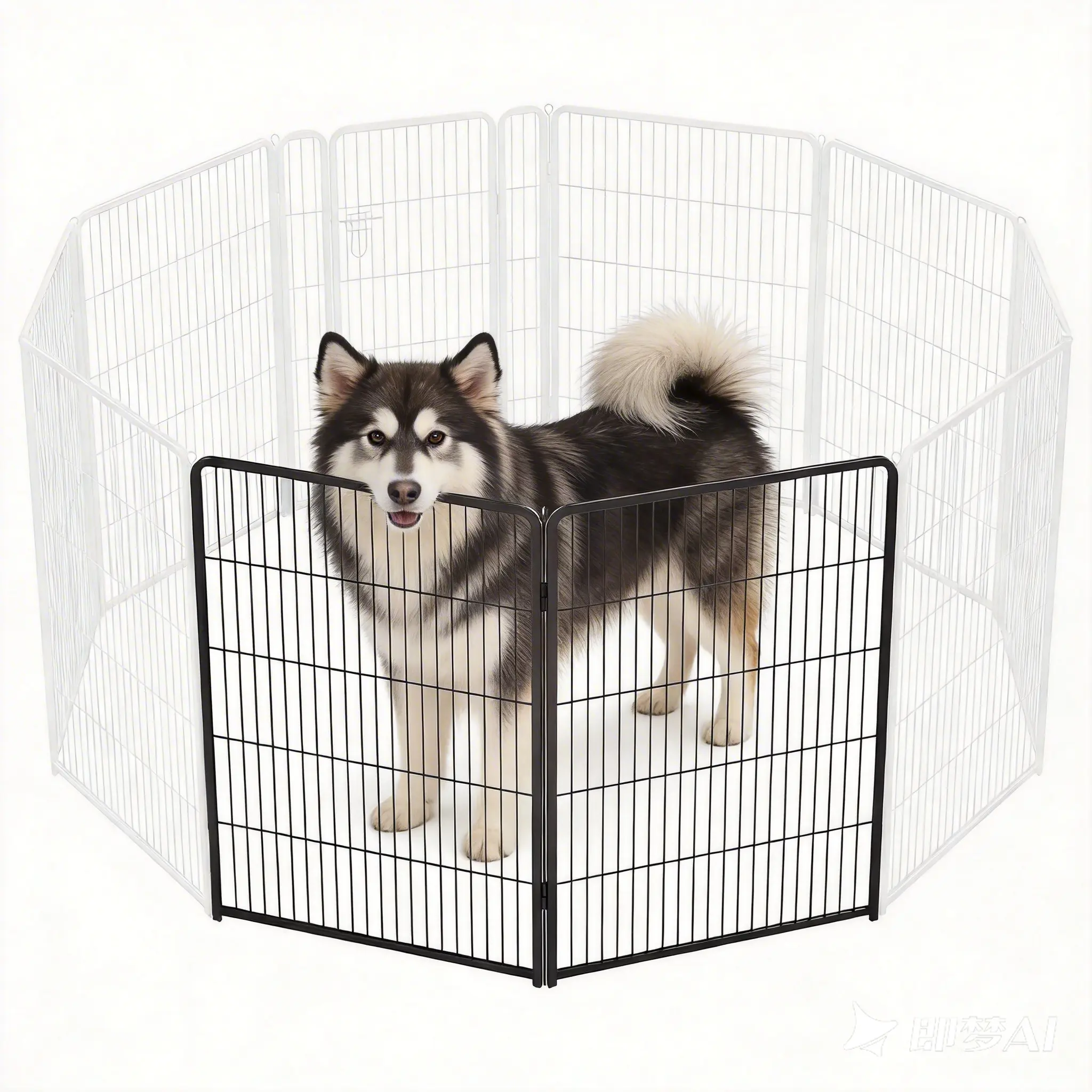 The kennel is made of durable metal, coated for corrosion and wear resistance. It's suitable for indoor and outdoor use, ideal for camping, RV travel, and family backyards. Equipped with a lockable door, it balances safety and convenience. The fence panels are connected by sturdy hinges, ensuring a stable structure that withstands daily pet activities.