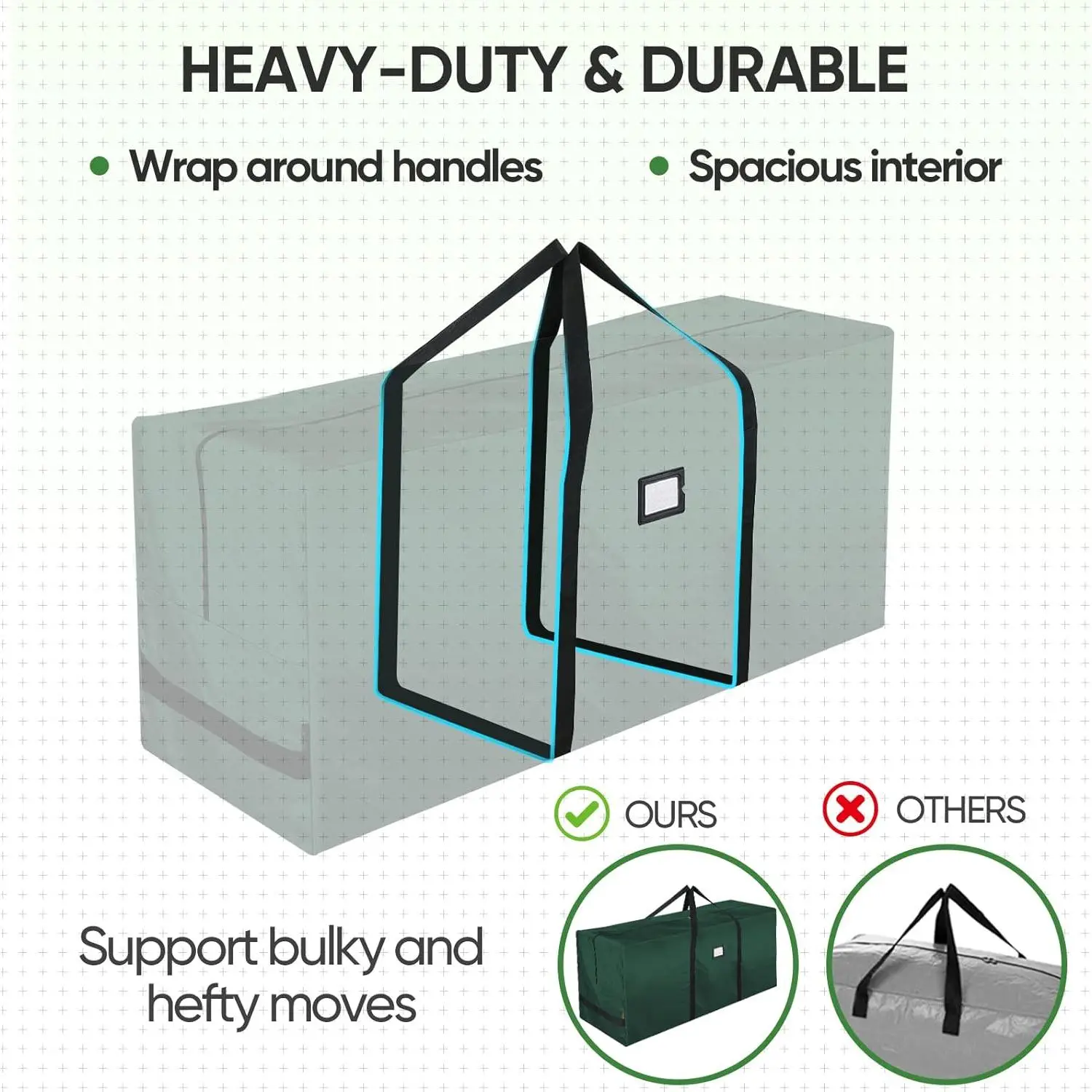 ● [HEAVY-DUTY & PREMIUM MATERIAL] The tree bag are made of durable material that is strong and tear resistant.The carrying handles are designed to support the bag and tree, provide the tote much more strength to hold extra load than stitched handles.The Xmas tree storage bag allows the tree to be easily hauled around your house and next season.