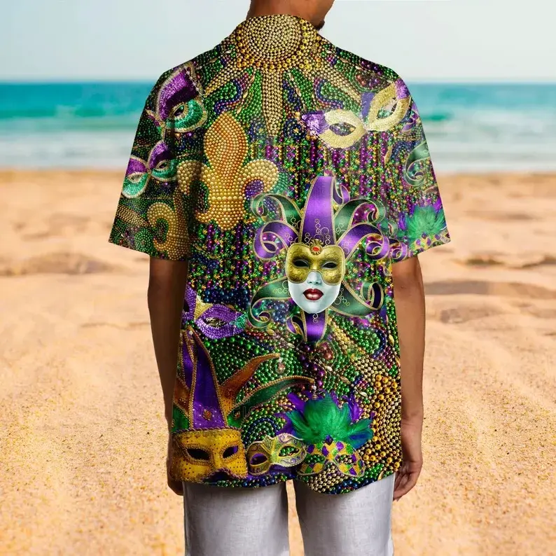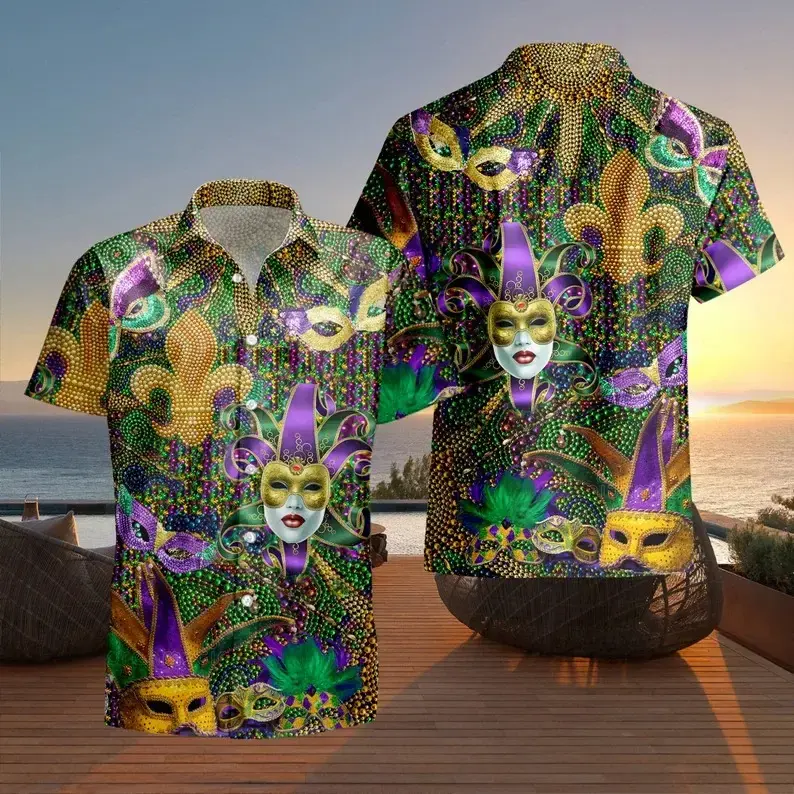 5. Mardi Gras Hawaiian Shirt Men Women Mask Beads Print Purple Gold Green Summer Beach Casual Streetwear Festival Party Vacation Sport Fan Gift Loose Fit Comfortable Cool
