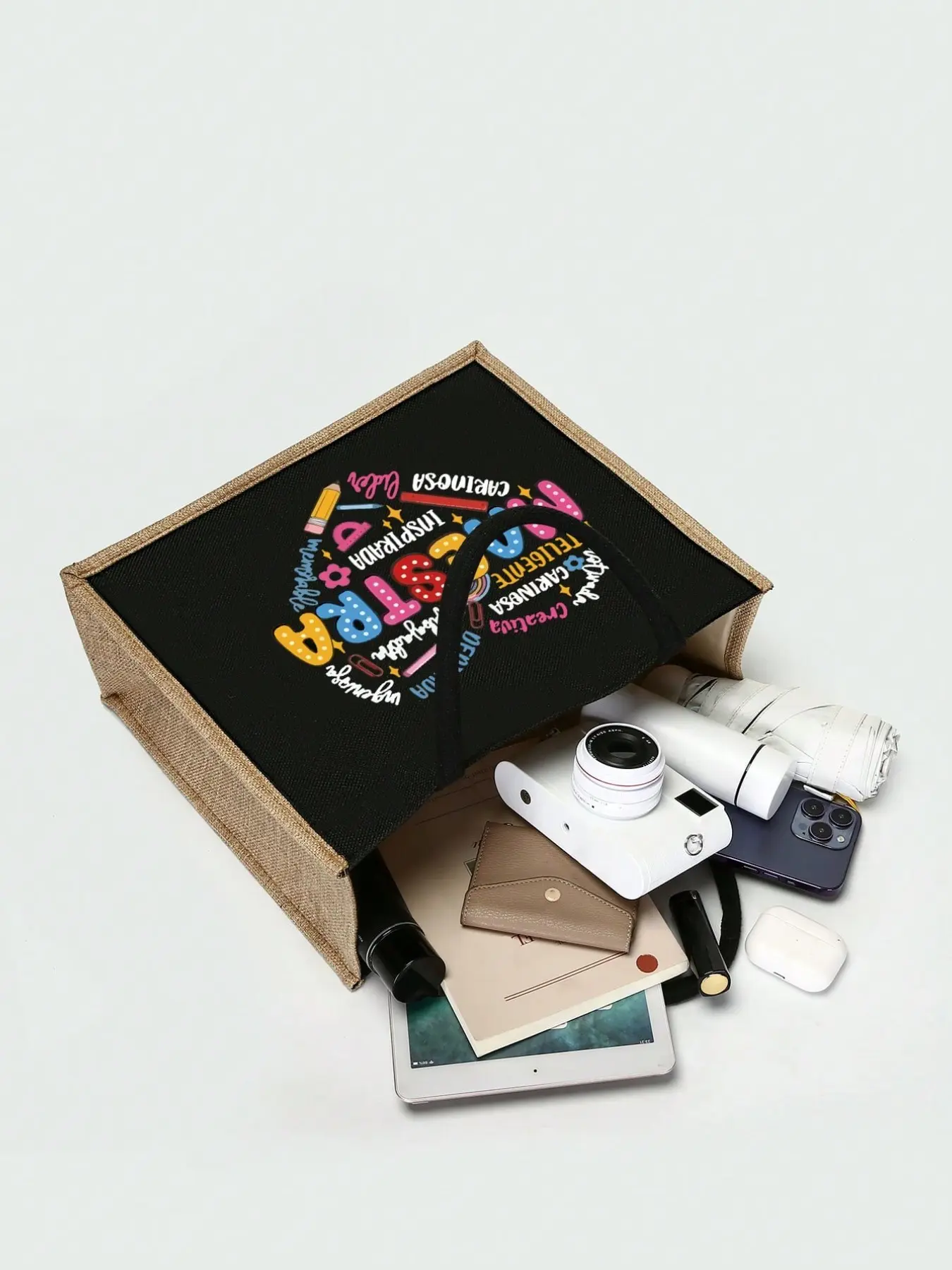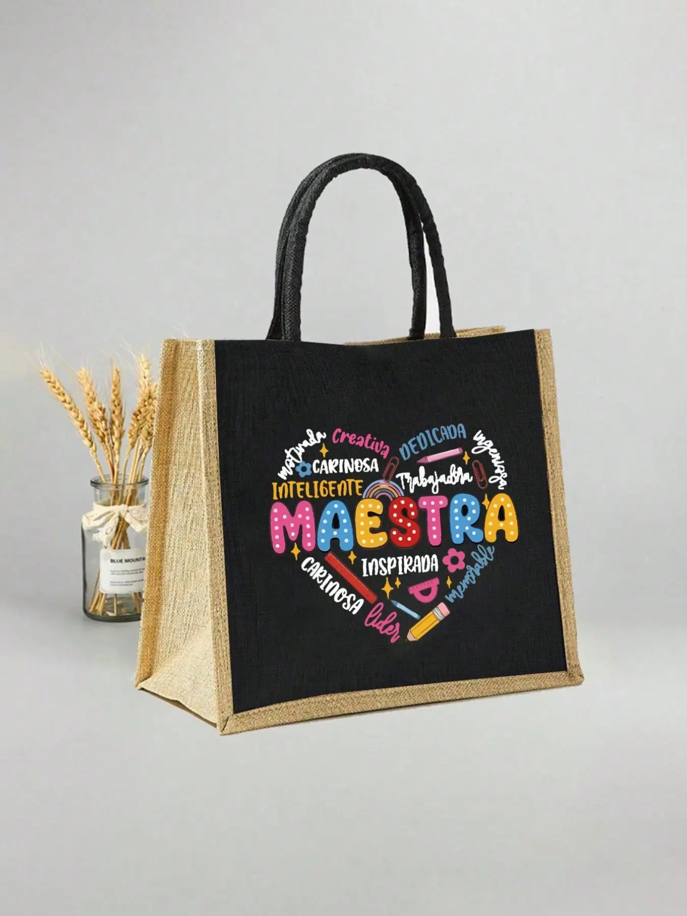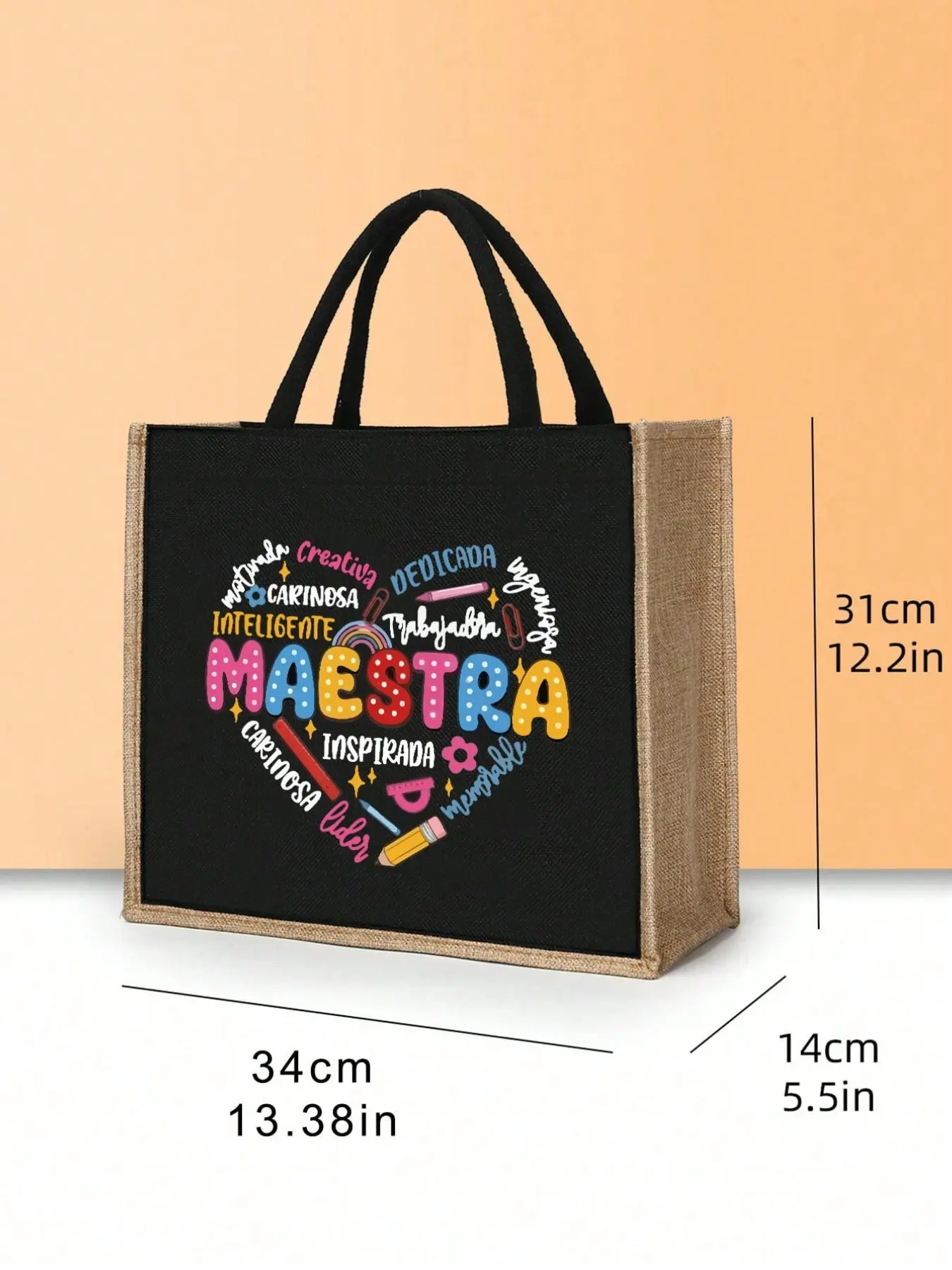 Maestra Theme Tote Bag and Makeup Pouch Set, Heart, Pencil, Ruler, Flower, Paperclip Patterns, Large Capacity Linen Shopping Bag, Skincare Organizer