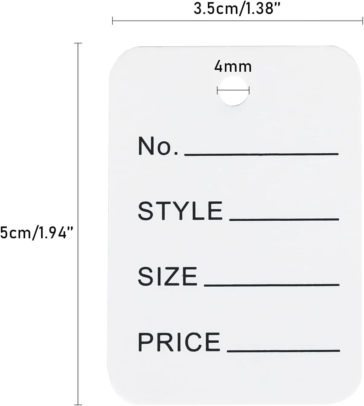 ·No DIY Paper Tags - Each Tags measures 1.97 x 1.37 inch /5 x 3.5cm (Length x Width). One side of the price tags is printed with NO. STYLE. SIZE. PRICE. The other side is blank, you can print your logo or write some blessings.