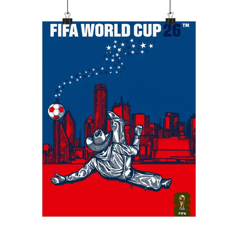 1. IDEA DESCRIPTION Capture the rugged energy and urban pride of the world's biggest stage with our "Urban Cowboy Football" commemorative poster. This design celebrates the spirit of the 2026 global tournament with a high-impact, two-tone blue and red aesthetic. Featuring a dynamic silhouette of a cowboy athlete delivering a powerful kick against a modern city skyline, it perfectly blends traditional western heritage with the high-octane excitement of professional soccer. It is a bold, artistic tribute to the host cities of the 2026 championship, designed for fans who value the cultural fusion of sport and local identity.