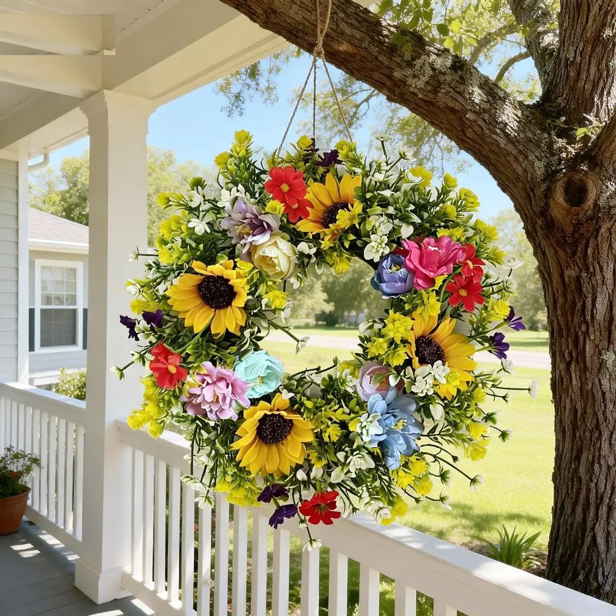 Each wreath is handcrafted with 300+ individual flowers and foliage, arranged for maximum fullness and symmetry. The hyper-realistic sunflowers, wildflowers, and roses look identical to fresh-cut blooms, with textured petals and natural color gradients that fool the eye—no cheap, plastic-looking blooms here.