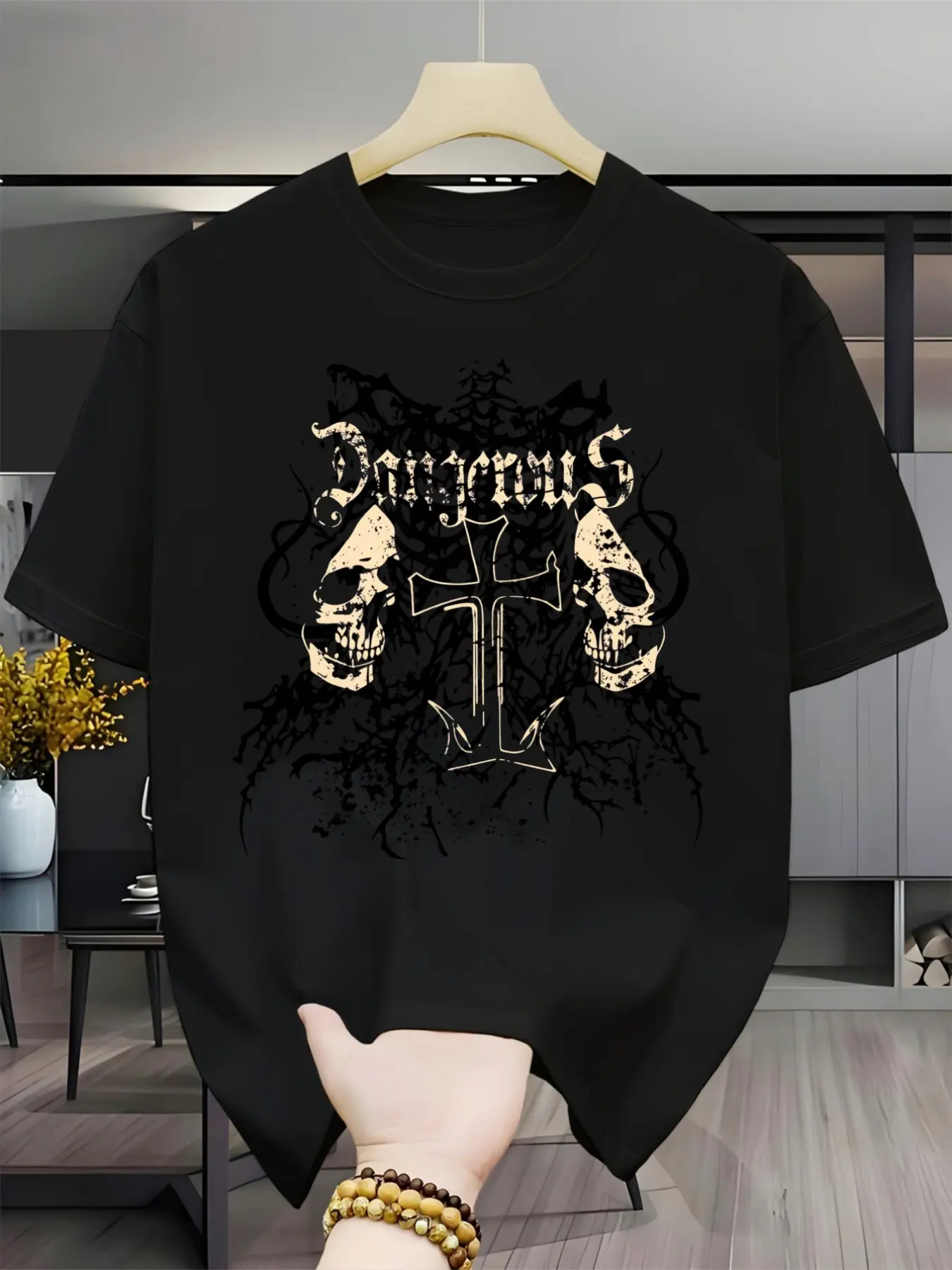 Men's Short Sleeve T-Shirt, Gothic Skull Cross Print, Casual Loose Fit, Breathable Round Neck, Streetwear Fashion, All Seasons