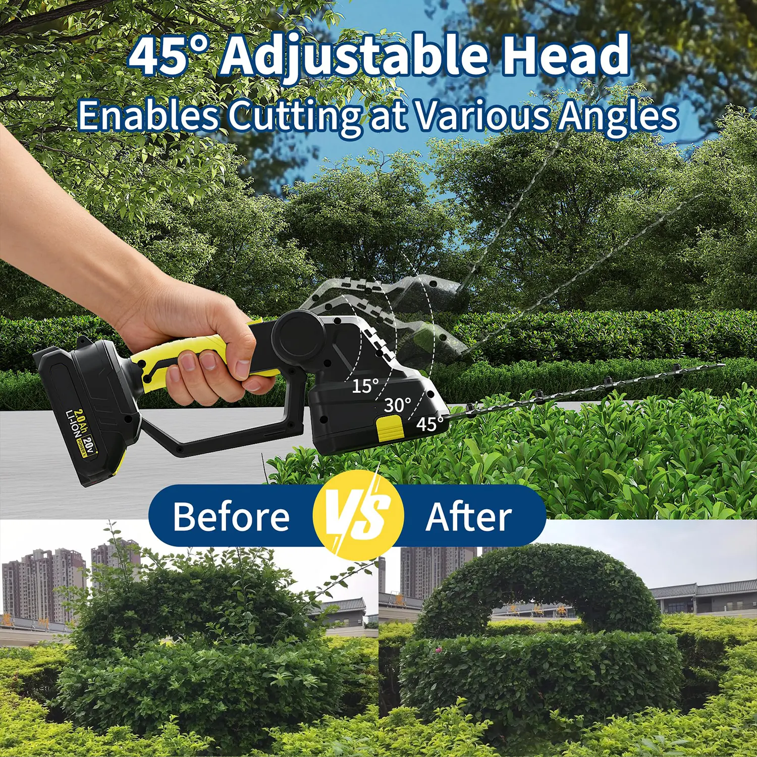 ·4.Adjustable Head For Comfortable Reach And Angles: The grass trimmer’s 45-degree adjustable head allows you to trim from various angles without bending or repositioning constantly. Easily cut sloped, vertical, or irregular hedges while maintaining a comfortable posture