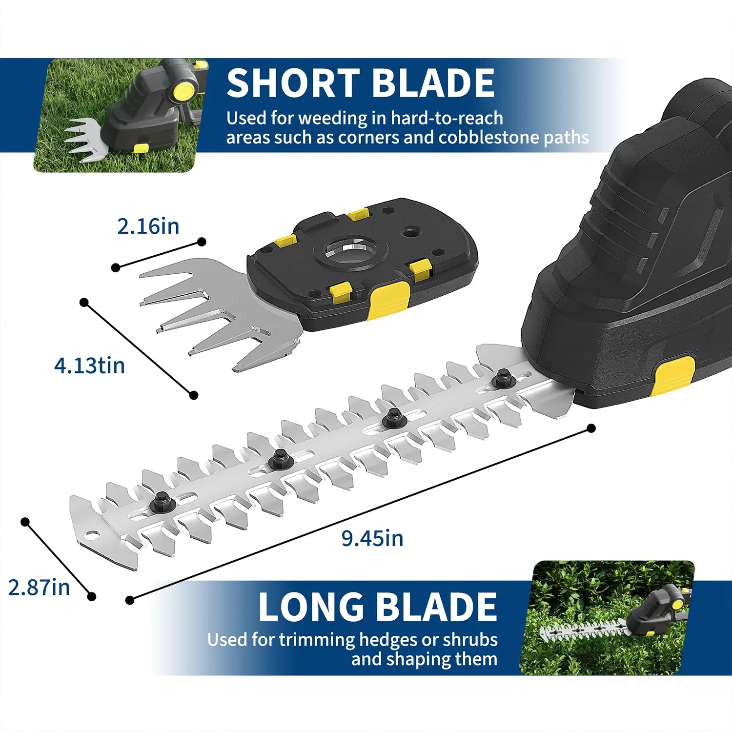 ·3.Versatile 2-in-1 Design With Tool-Free Blade Switching: Combining an 8-inch hedge trimmer blade and a 4-inch grass shear blade, this shrub trimmer adapts to multiple gardening needs. Switch blades effortlessly with side buttons—no tools required—making it ideal for precise trimming of lawn edges, bushes