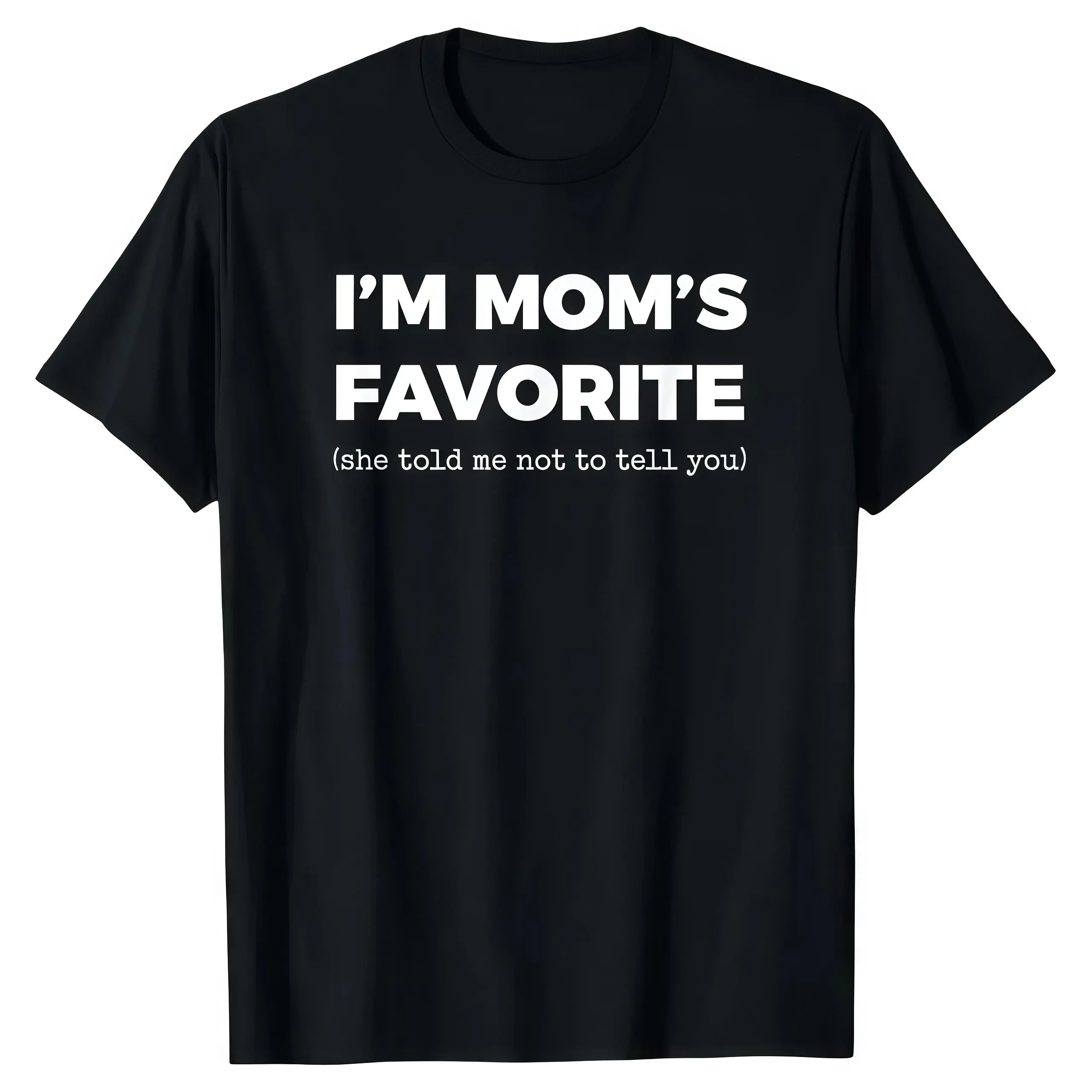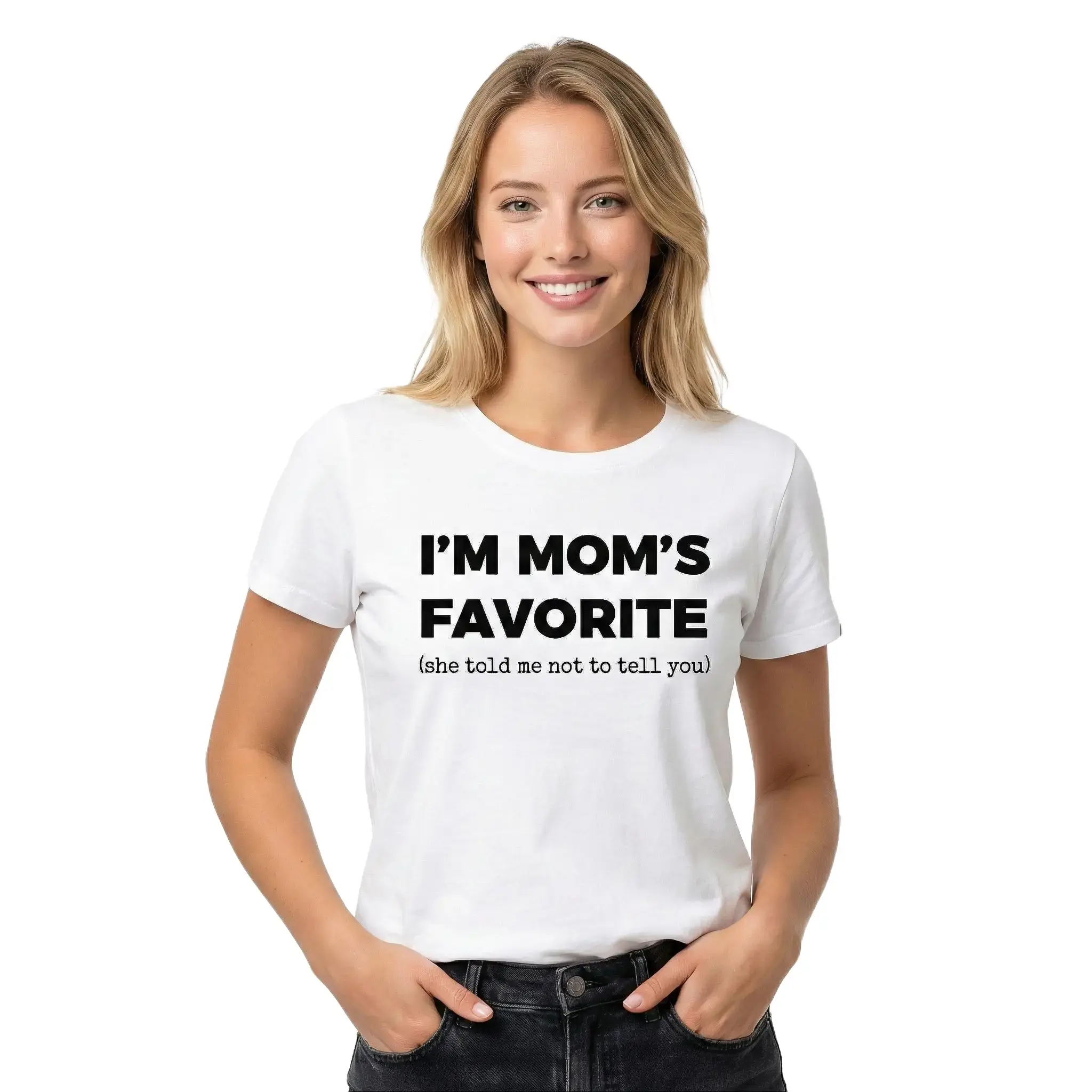The image shows a t-shirt with a playful design. It includes the text "I'm Mom's Favorite" and is perfect for those looking for a humorous gift. The shirt is depicted as suitable for summer wear.