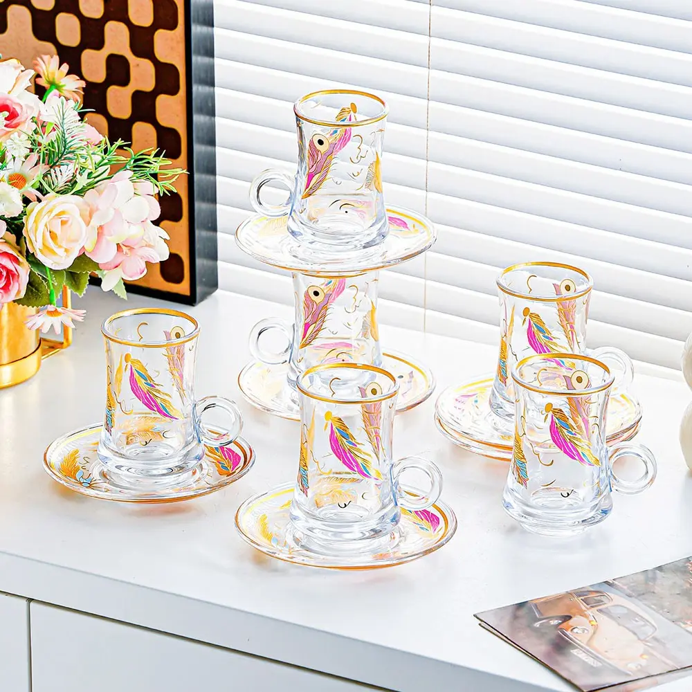 Vintage Turkish Tea Glasses Cups and Saucers Set of 6 Handle Drinkware Drink Bar Fancy Teapots Serving Glassware Drinking Kitchen Women Moroccan Persian Teacups Party Art Deco