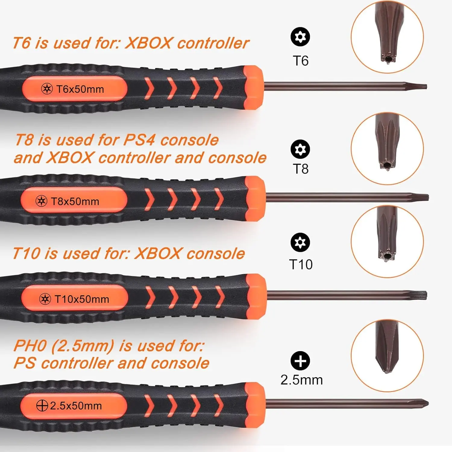 [Function of screwdrivers]- PS3, PS4, PS5 controllers use T8 and PH0 (+ 2.5mm) screwdrivers, and handles use PH0.The XBOX controller uses T6 and T8 screwdrivers, the handle and the console use T8 and T10.PH0 (+ 2.5mm) can also be used in various household appliances, furniture and toys.