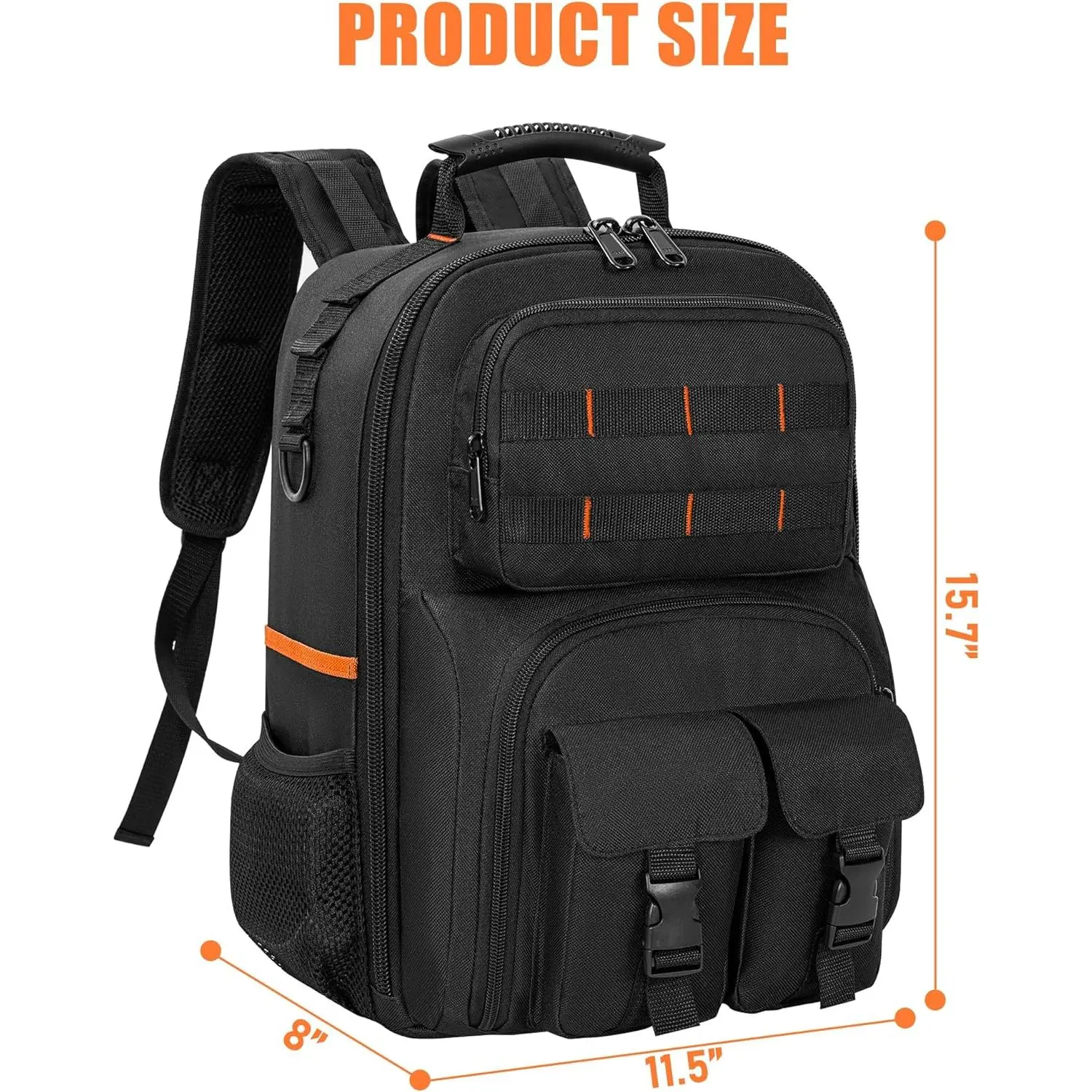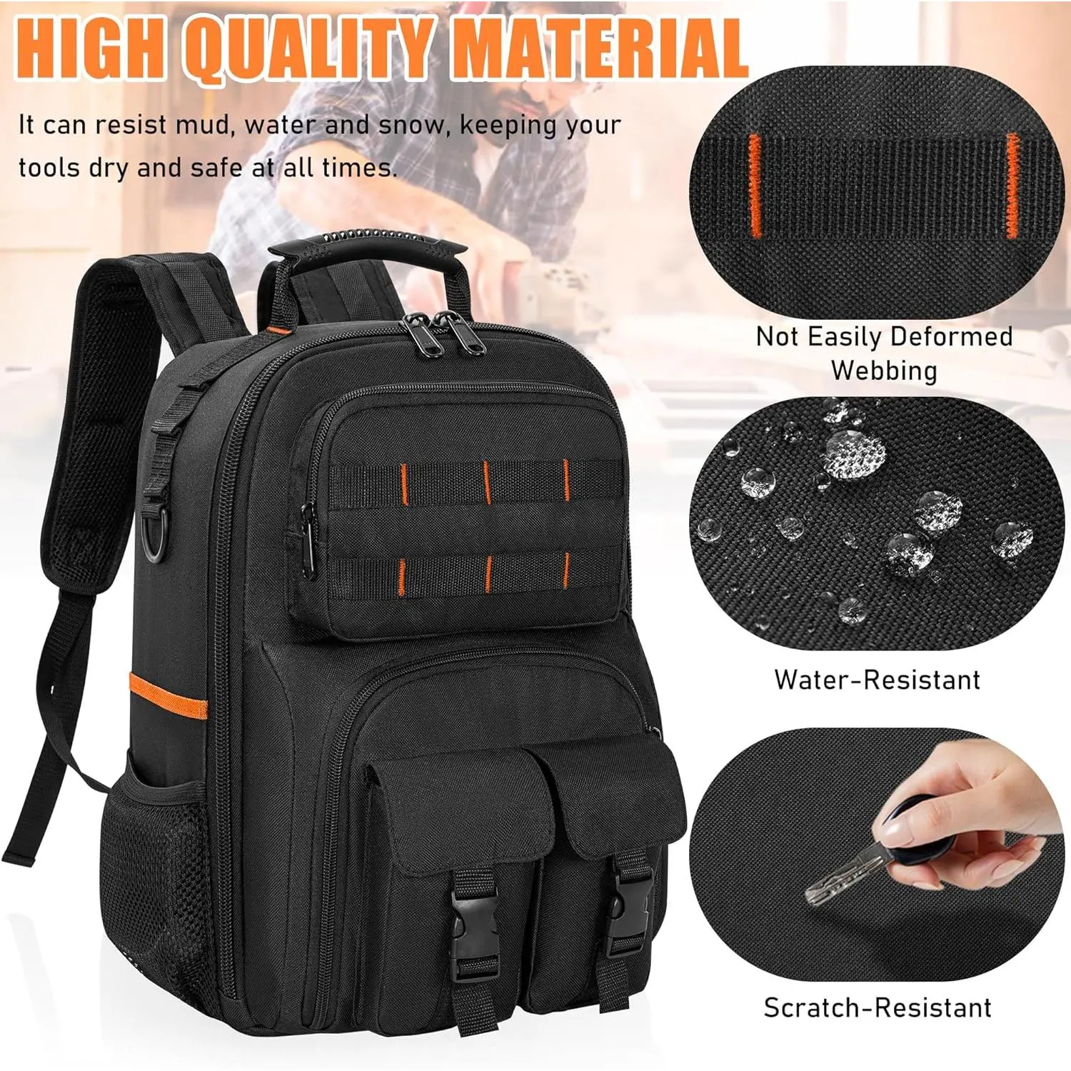 Heavy Duty Tool Backpack with Padded Shoulder Straps and Removable Tool Organizer, Water-Resistant Work Backpack for Electricians, Plumbers, HVAC Technicians, and Cable Repair Professionals, Durable Construction with Multiple Compartments and Pockets for Efficient Tool Storage and Easy Access, Ergonomic Design for Comfortable Carrying During Long Workdays, Ideal for Construction, Maintenance, and Field Service Tasks, Available in Black and Orange Color Combination