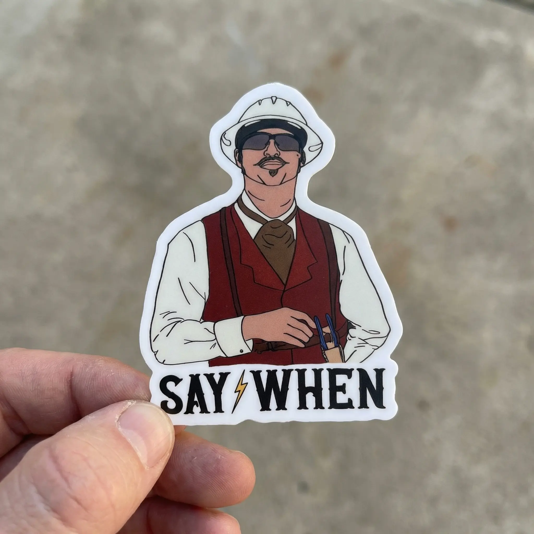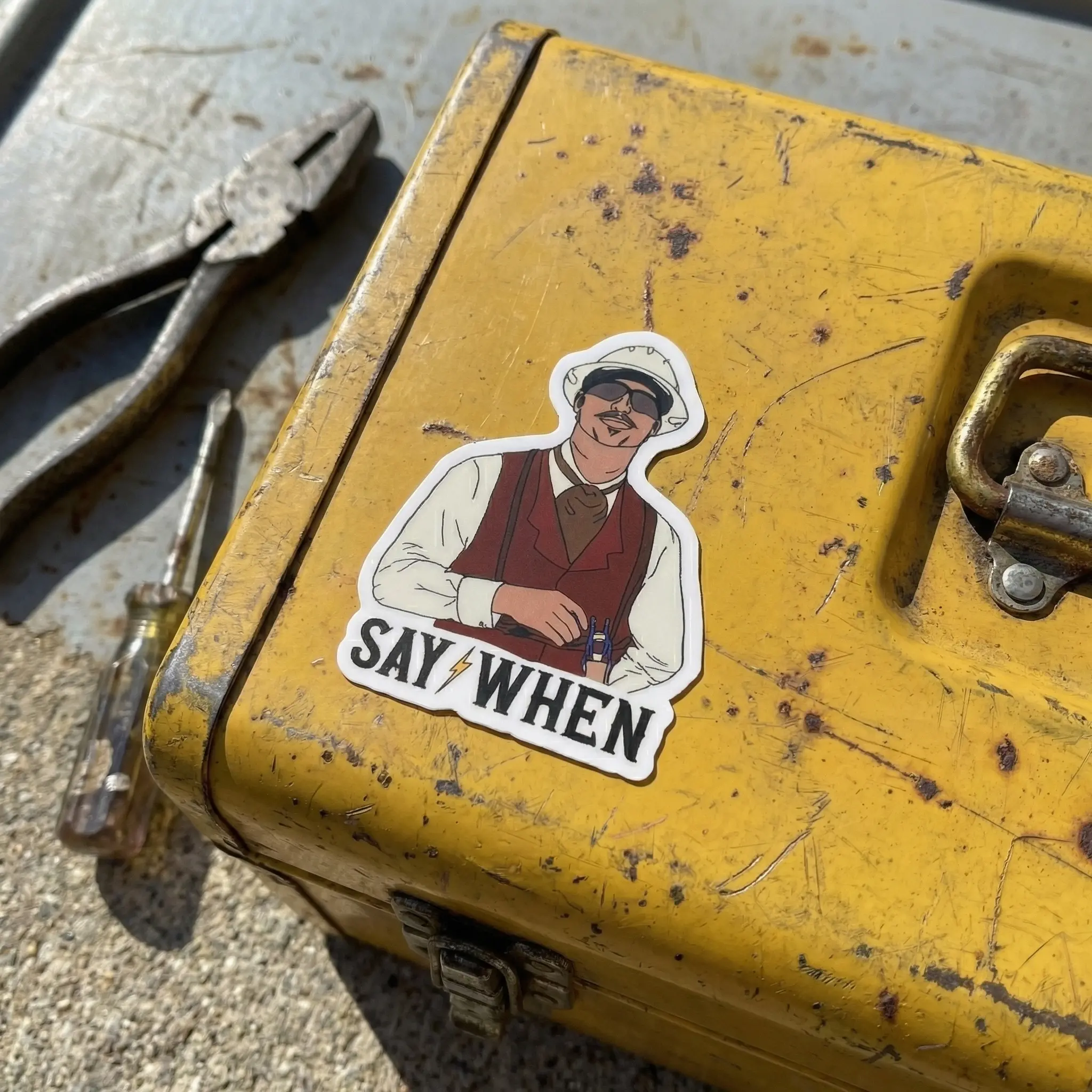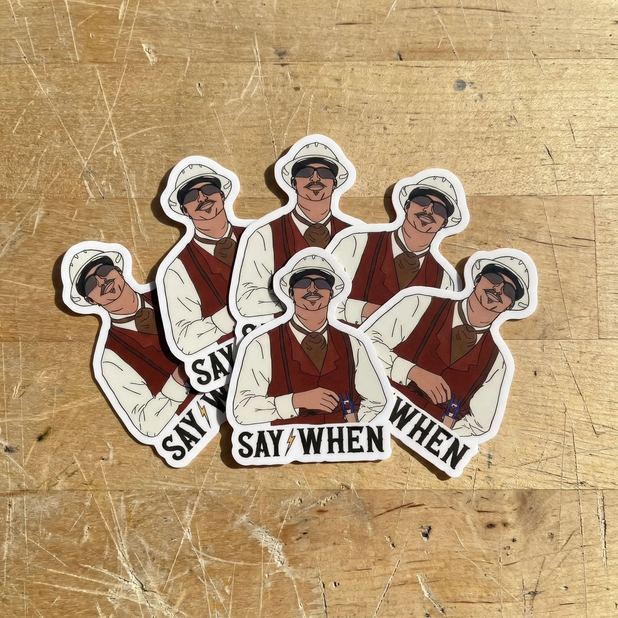 Clocking in and getting it done. The "Say When" sticker is a badass upgrade for tradespeople. Perfect for linemen, electricians, and construction workers. It features a classic Doc Holliday vibe with a hard hat, safety glasses, and a lightning bolt. Display your hard work pride with this ultimate badge of honor.