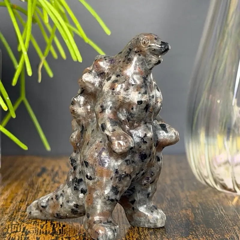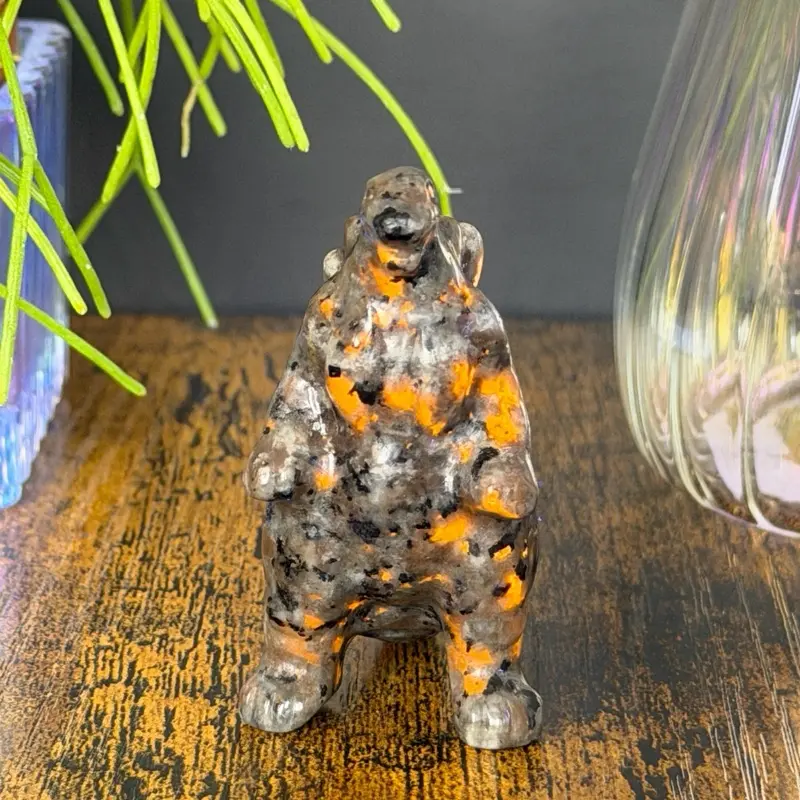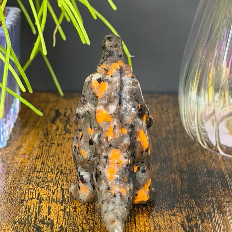 This unique carving is made from yooperlite (sodalite in syenite), a fascinating stone that appears gray with black speckling in normal lighting but reveals a vibrant orange glow under UV/black light. The natural patterning gives it a rugged, volcanic look even before activation, adding depth and character.