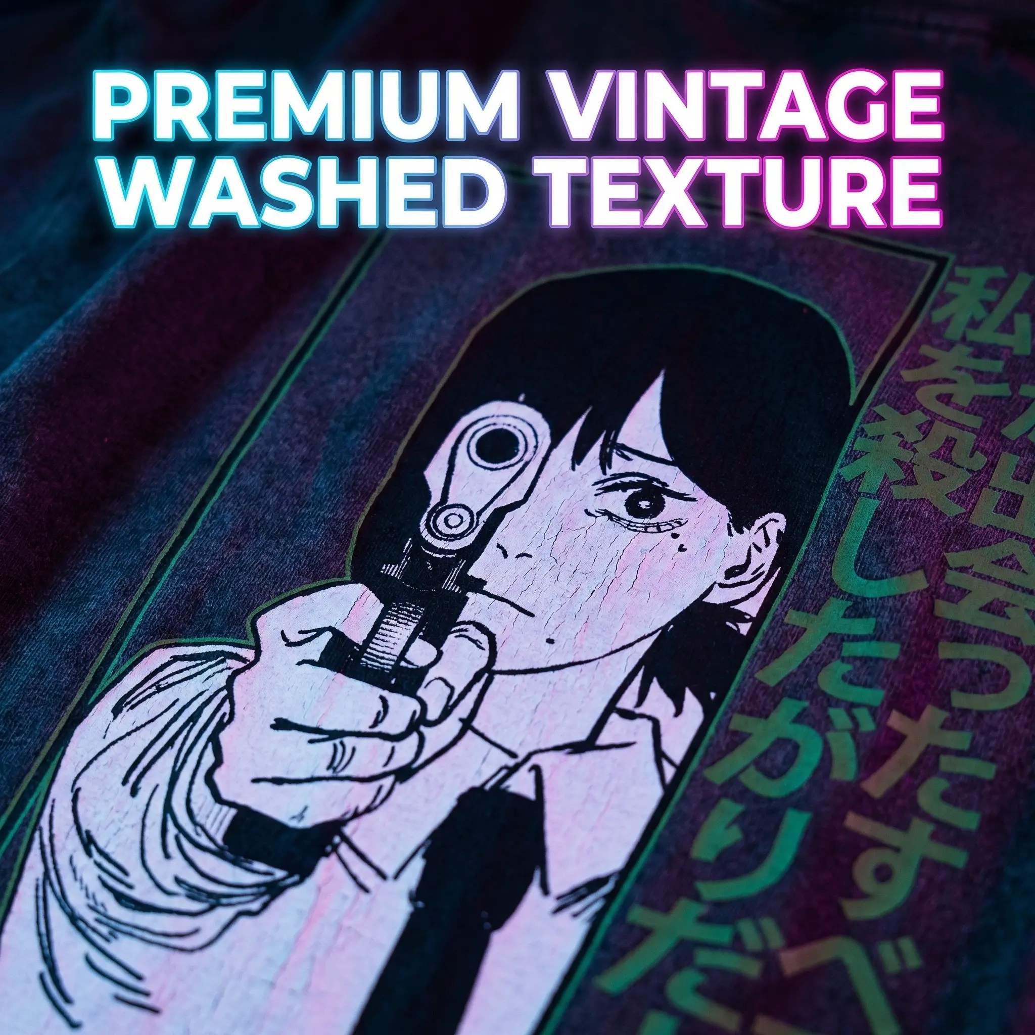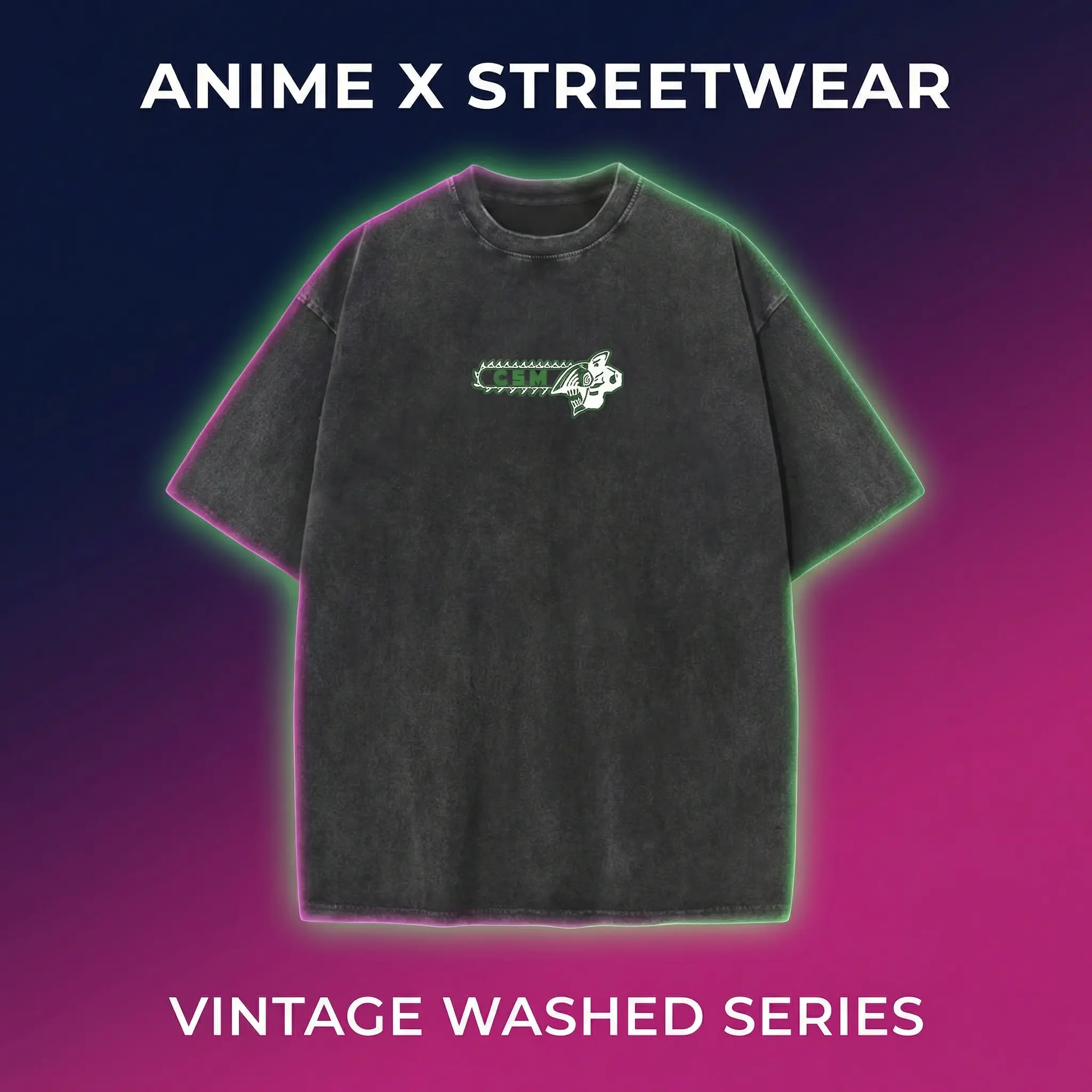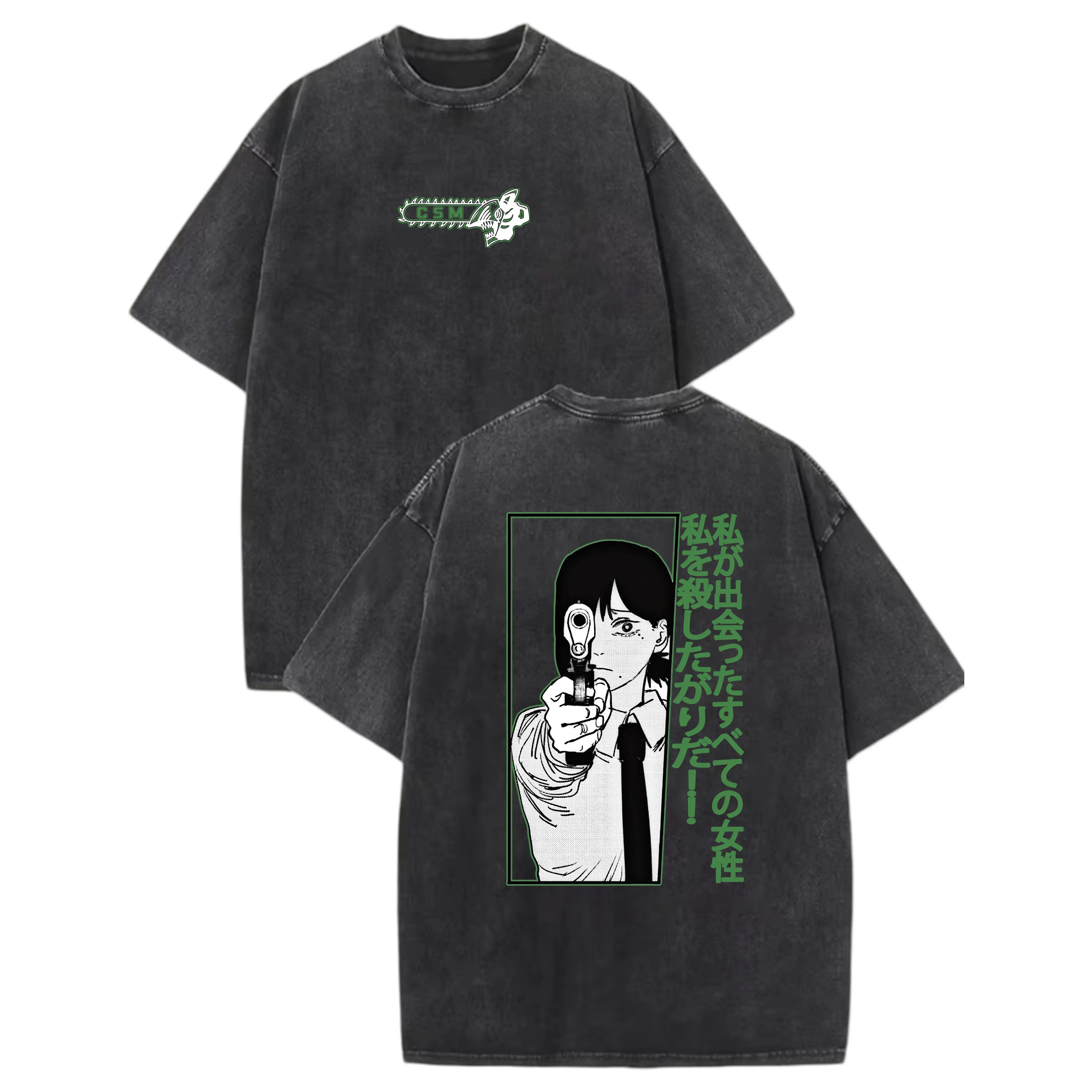 Trendy anime Chainsaw Man washed vintage short-sleeve T-shirt, official anime merchandise, soft breathable cotton, retro distressed style, casual streetwear for men and women, perfect for conventions, cosplay, summer outings, and anime fans