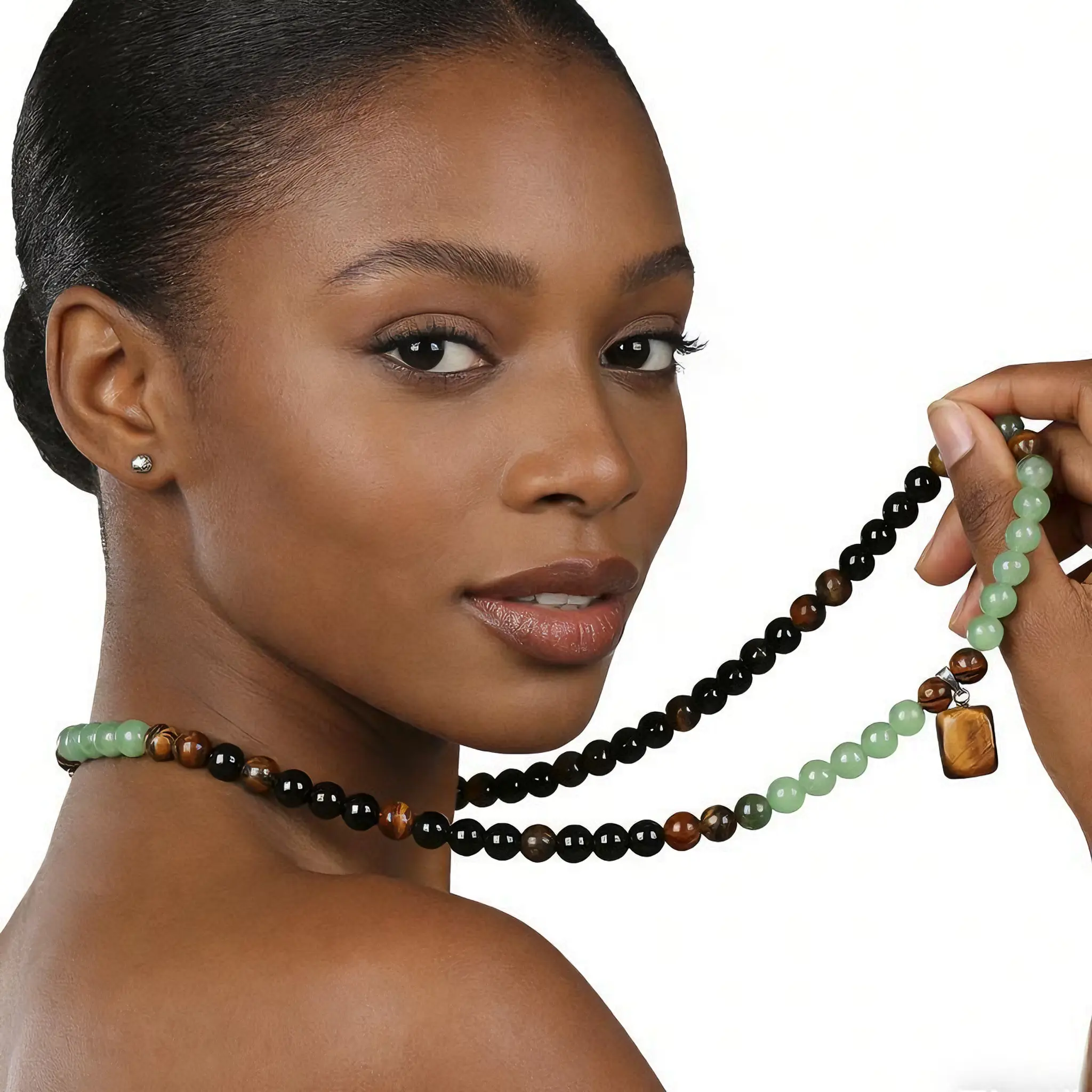 GEMRICH wealth necklace featuring a pendant set with green Dongling jade and tiger’s eye stone, infused with healing crystals; suitable for anniversary celebrations, vacations, and themed parties, and a gift that appeals to both men and women.