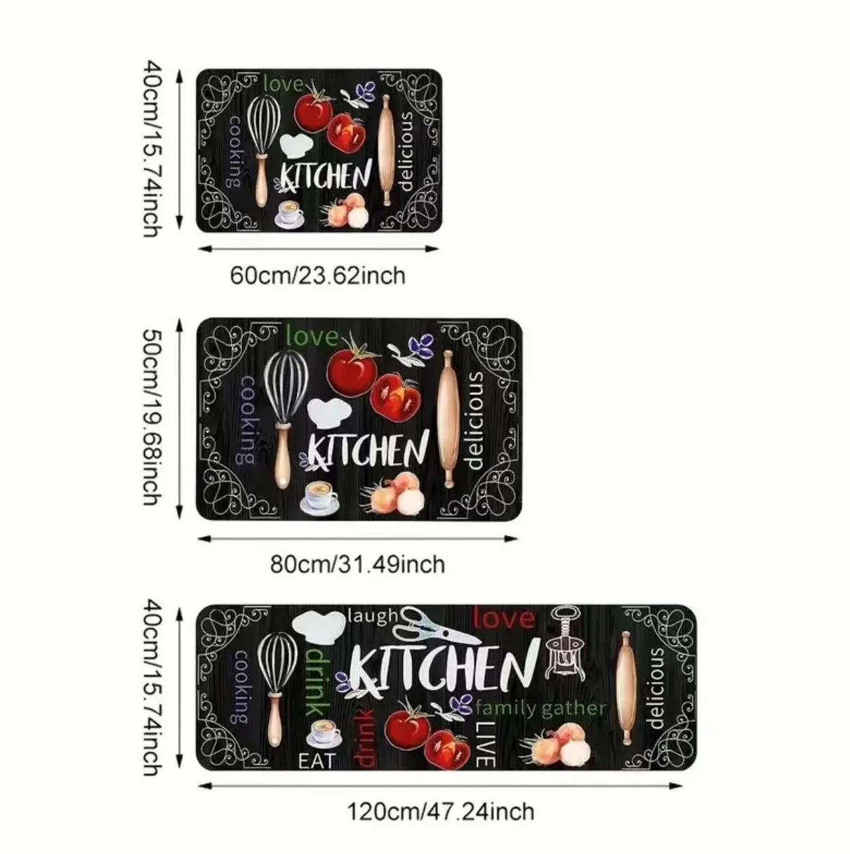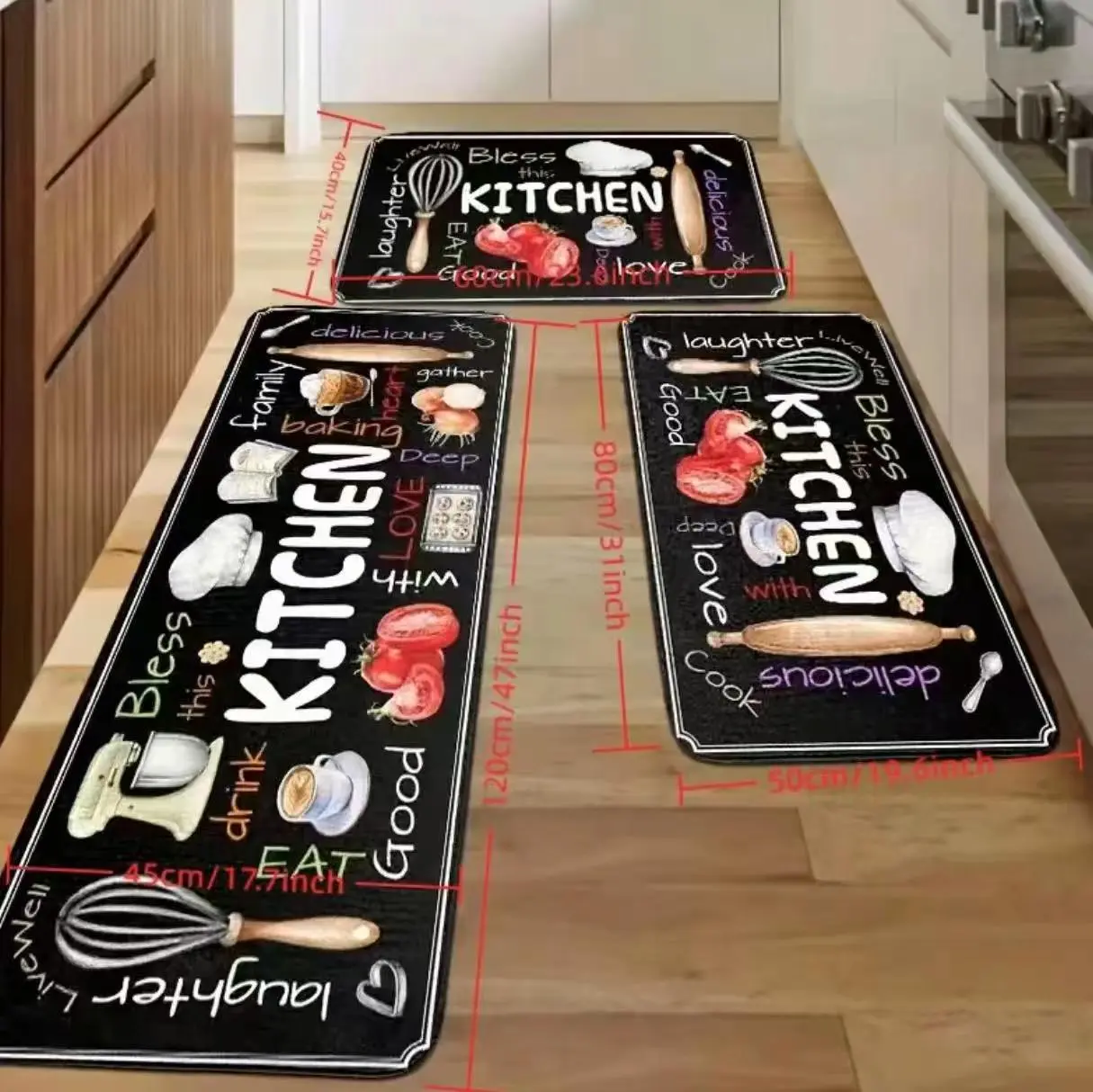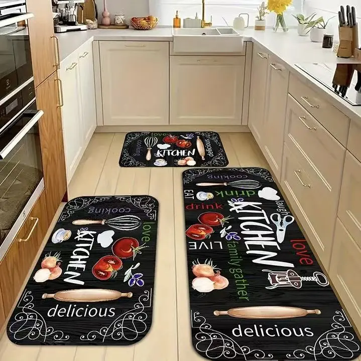 Enhance your kitchen with this charming set of 3 non-slip floor mats. Each mat features a delightful kitchen utensils pattern, perfect for a farmhouse kitchen aesthetic. These mats are not just functional but also decorative, adding a touch of elegance to your kitchen space. Ideal for home kitchen decor and accessories, they are washable for easy maintenance.