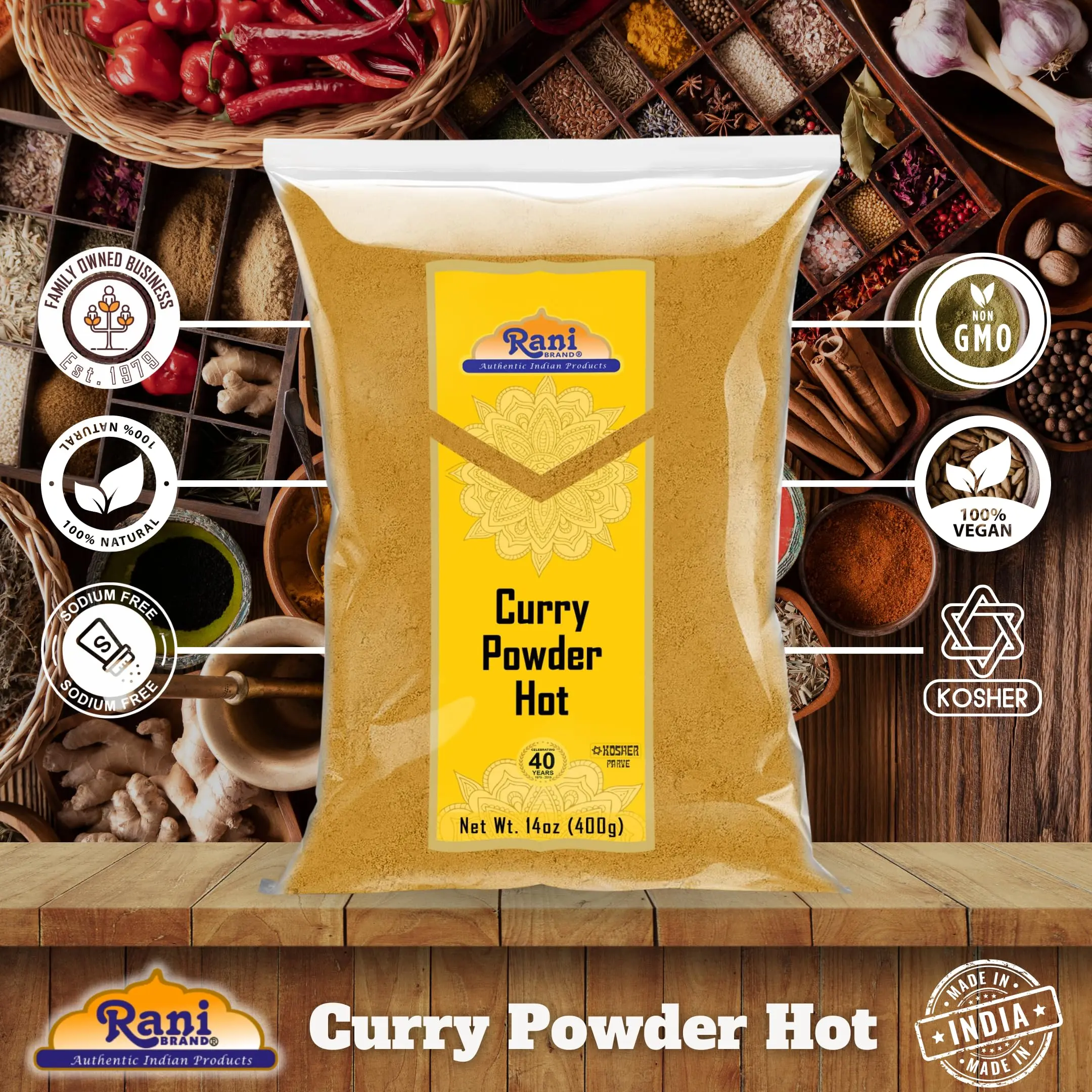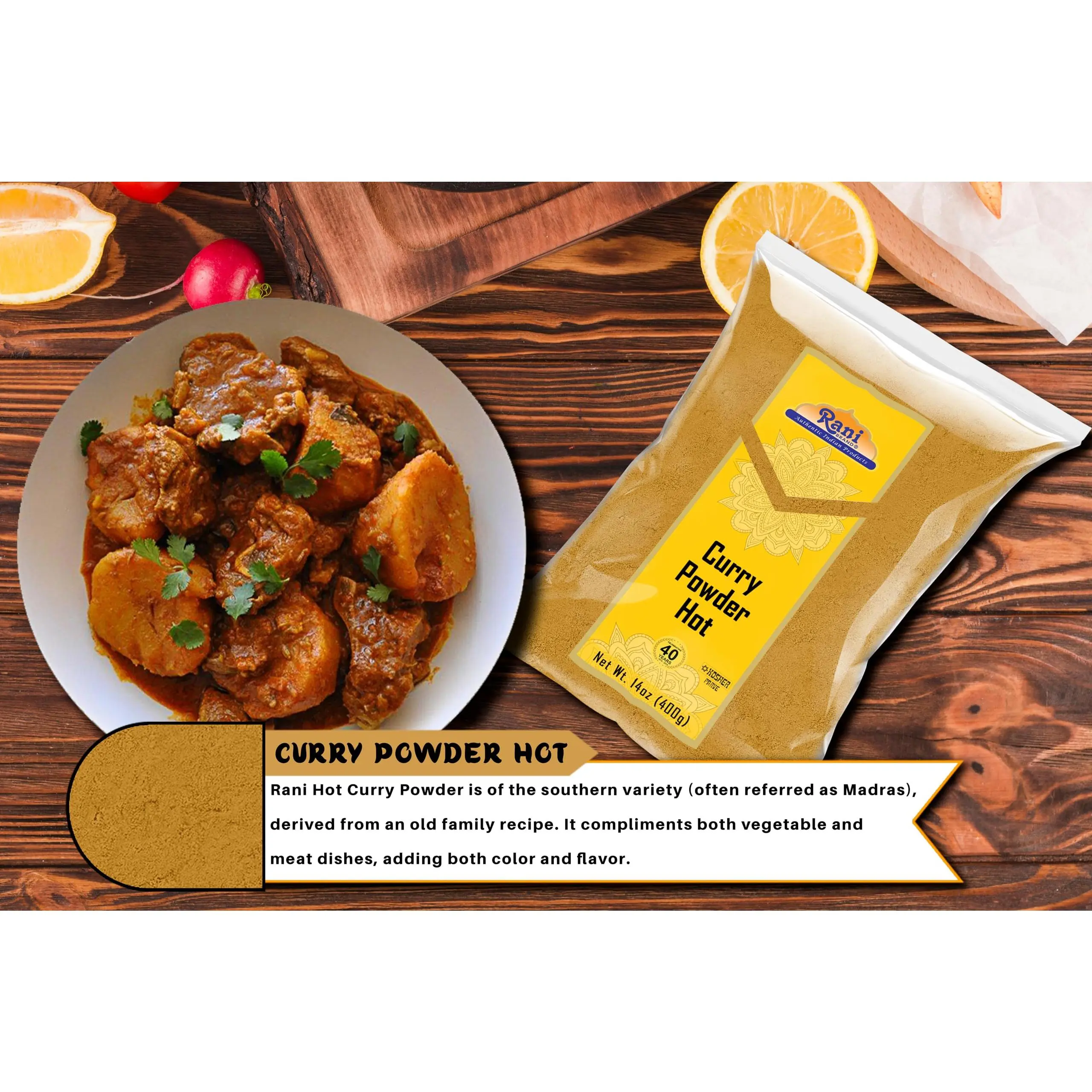 Traditionally, the spices used in curry blends reflect the availability of spices and the climate of the region to which they are credited. North Indian curry powders tend to be milder and very aromatic, while South Indian blends tend to be hotter in flavor. Rani Hot Curry Powder is of the southern variety (often referred as Madras), derived from an old family recipe. It compliments both vegetable and meat dishes, adding both color and flavor.