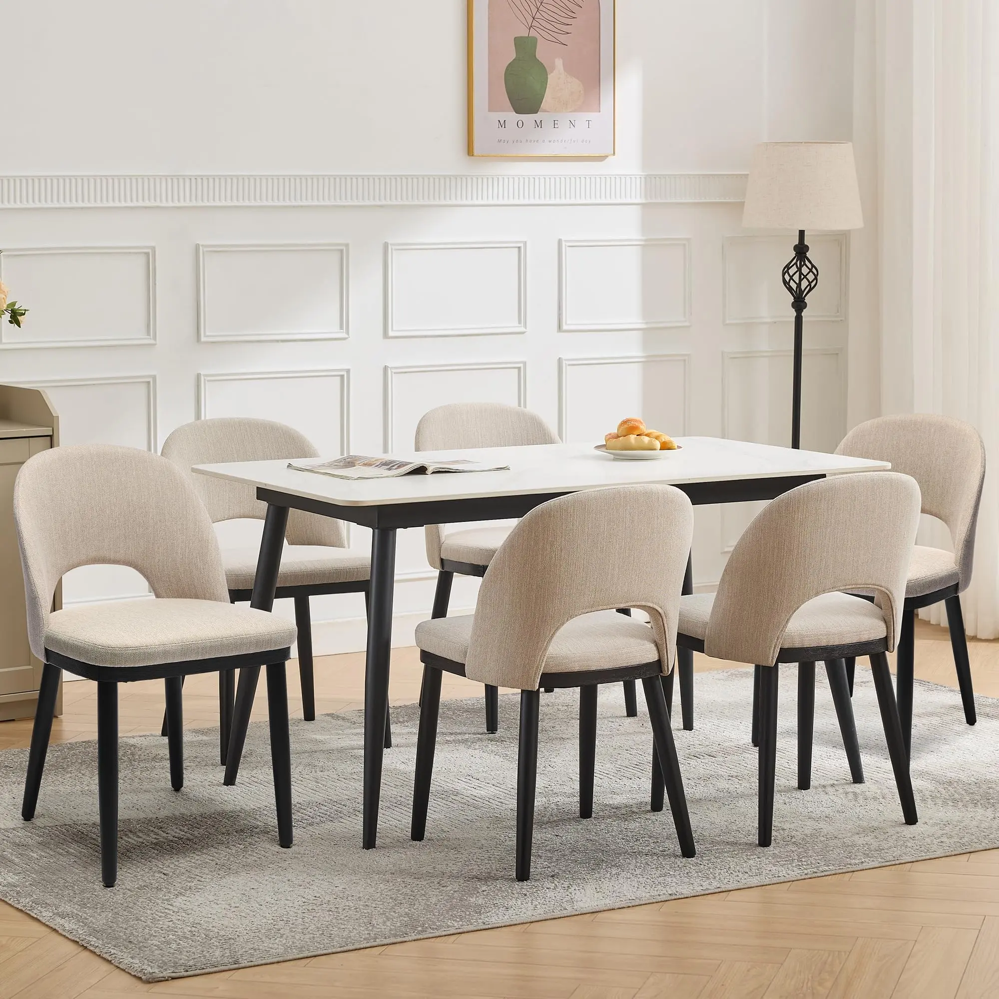 Garvee Set of 2 Modern Upholstered Dining Chairs with Thick Cushioned Seats, Curved Backrests, and Sturdy Wood Legs in Linen Fabric, Available in Beige, Grey, Camel, and Green for Dining or Living Spaces