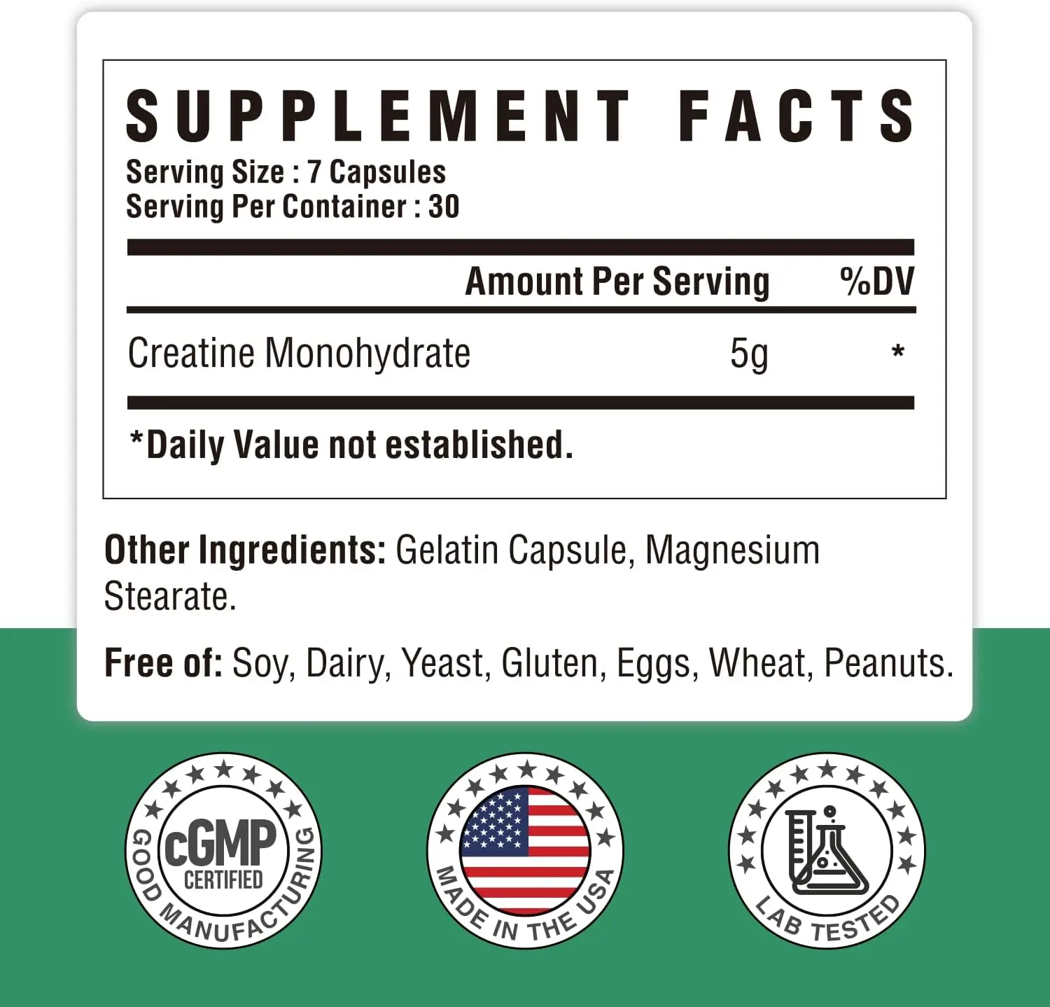 ·High Potency and Convenience: Creatine pills are designed to support your workouts. Each bottle contains 30 day's supply with 210 total capsules and 5g (7 capsules) per serving, providing a convenient and easy way to incorporate creatine into your fitness routine.