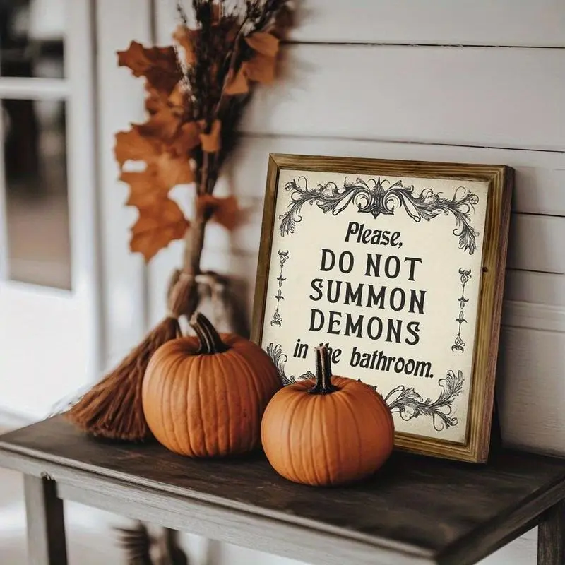 Funny Dark Humor Rustic Vintage Style Gothic Wooden Framed Sign, Please Do Not Summon Demons in the Bathroom, Halloween Year-Round Spooky Decor