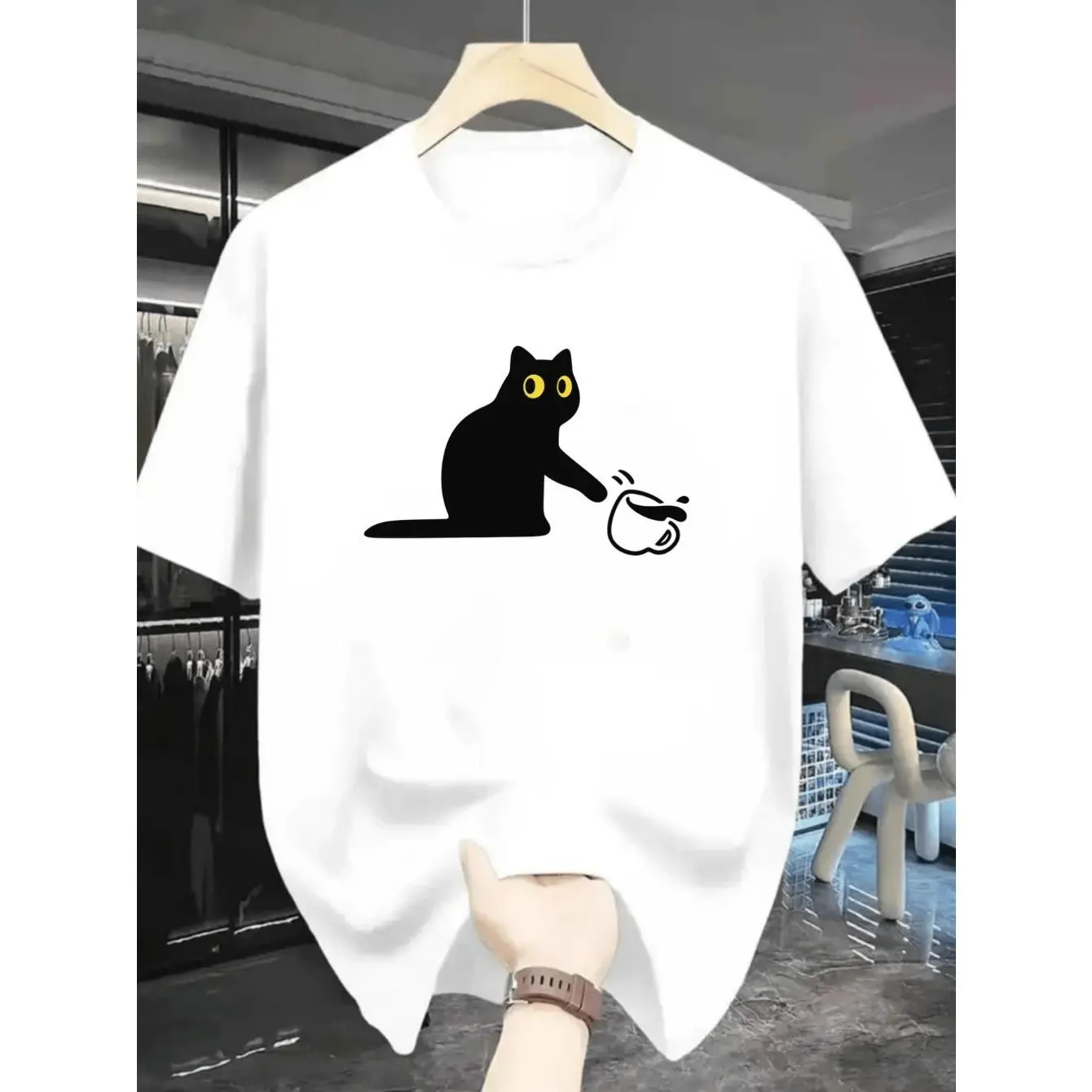 Men's funny black cat with yellow eyes holding a coffee cup Graphic T-Shirt - Short Sleeve Crew Neck Regular Fit Casual Wear | Soft & Breathable Fabric, Durable Print, Everyday Comfort, Machine Washable, casual and playful daily wear, home relaxation, or