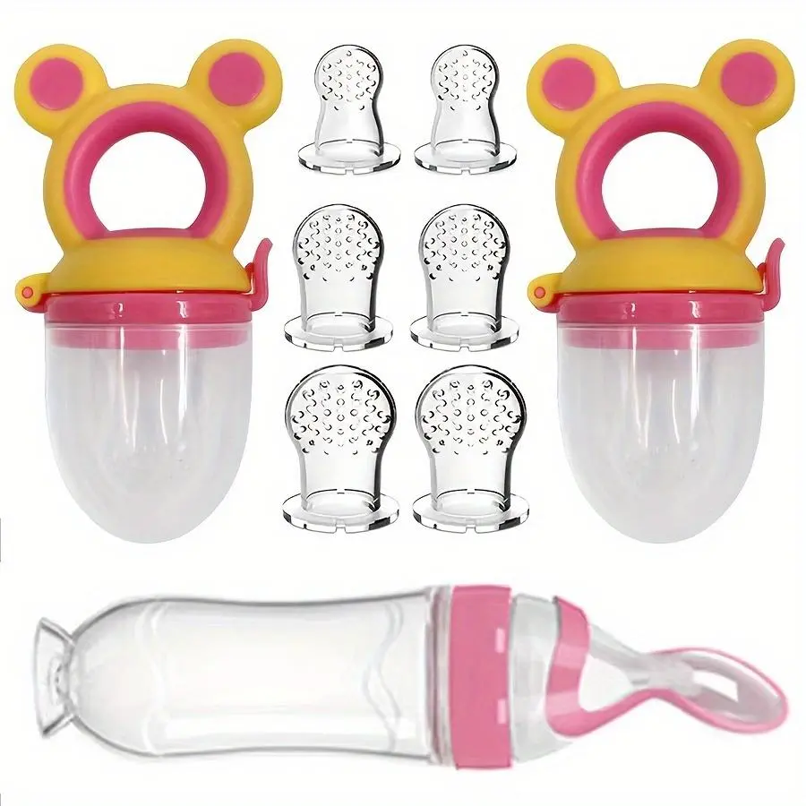 【Comprehensive Set】: This 9-piece feeding set includes all essentials, such as a squeeze bottle, fruit feeders, and various nipples.