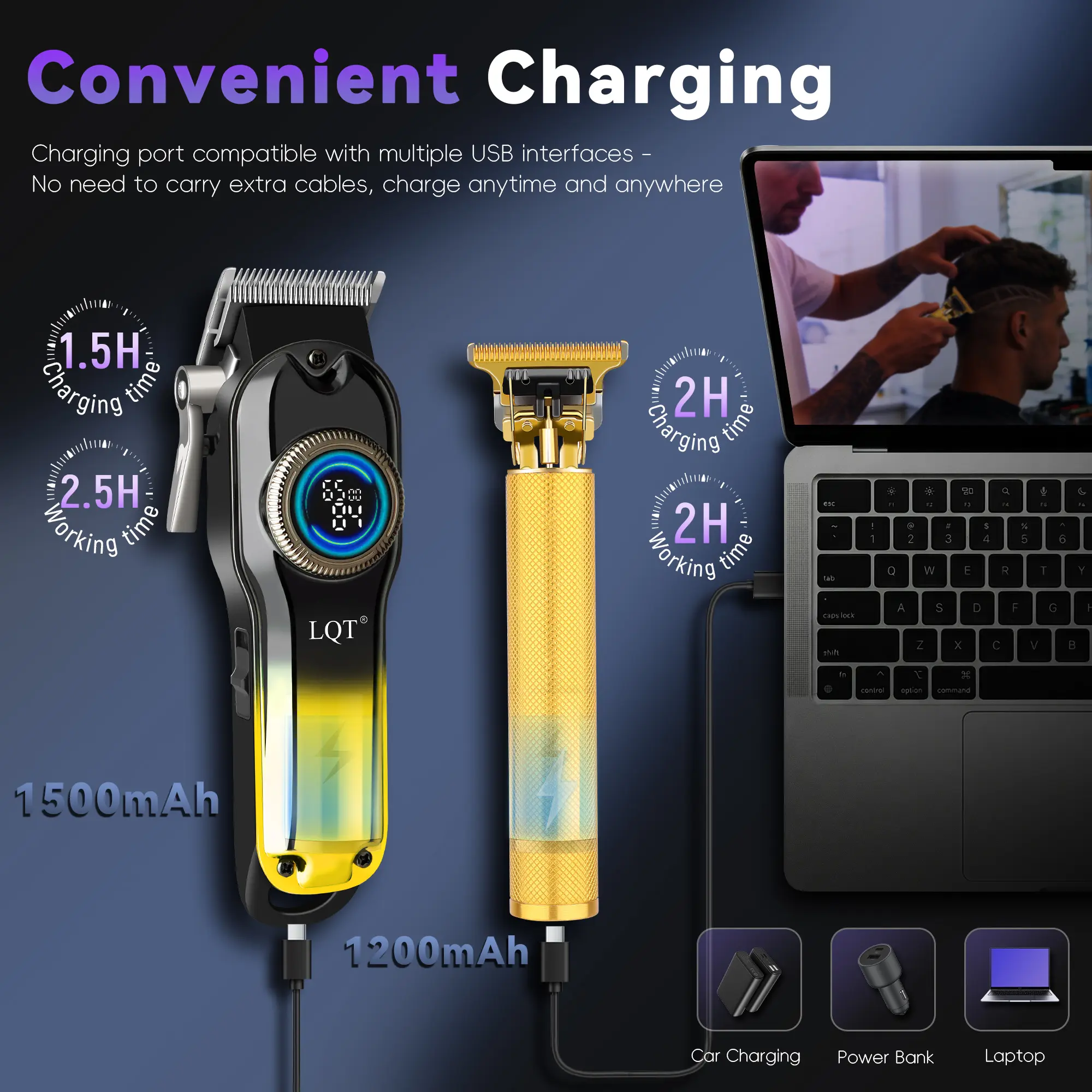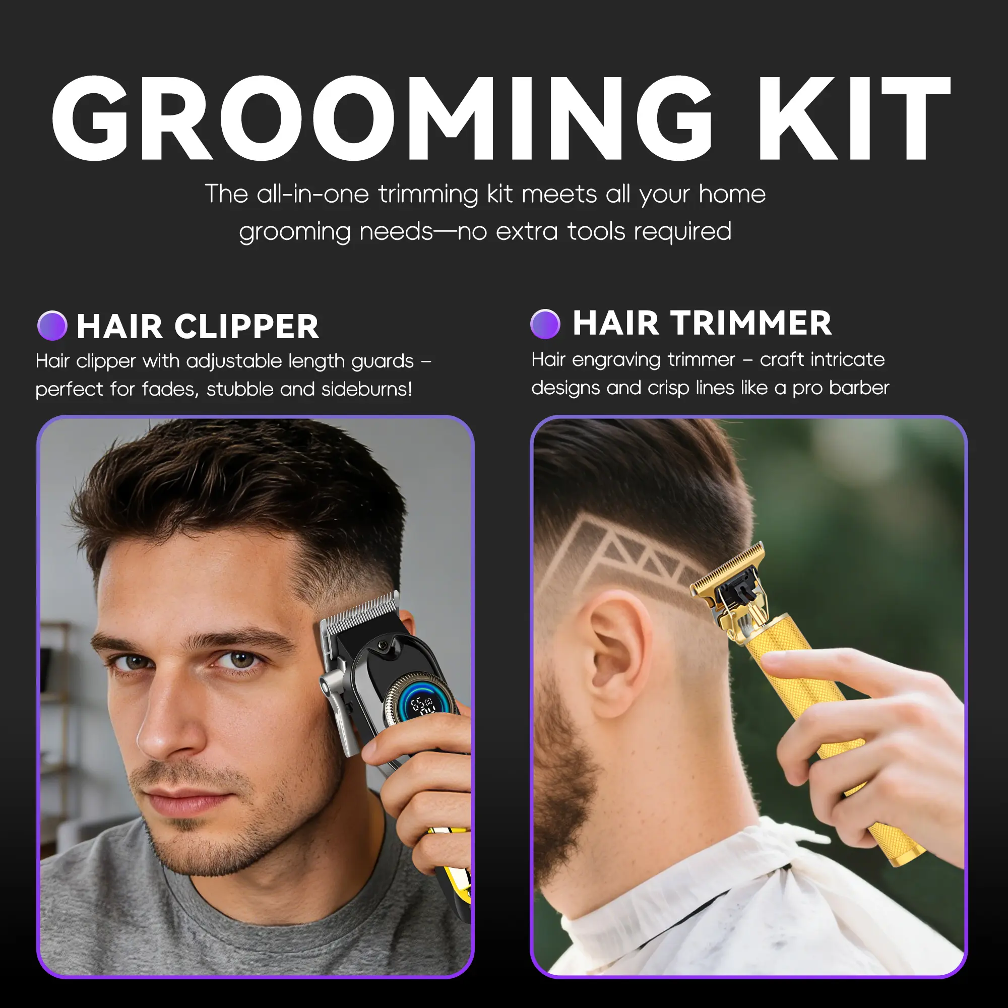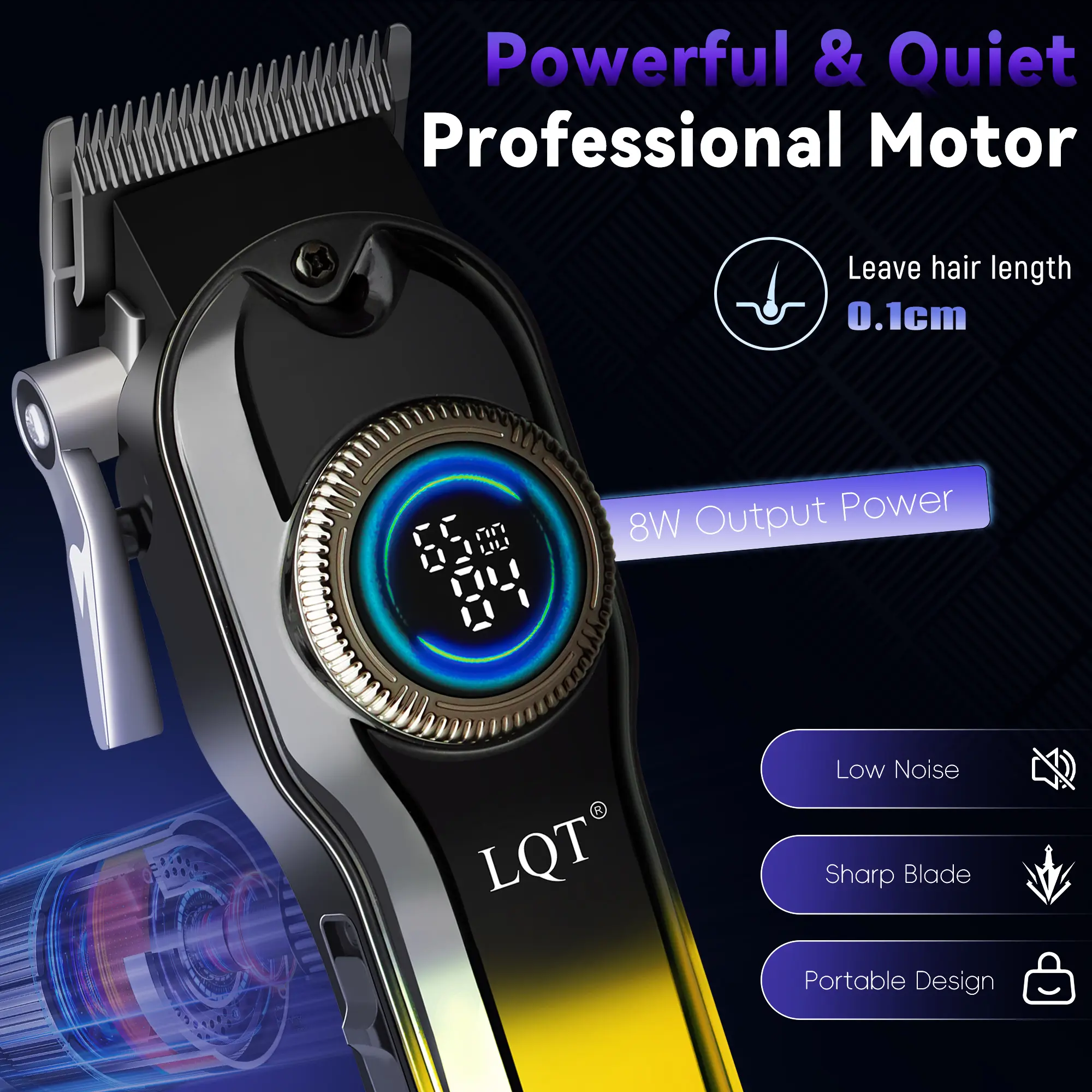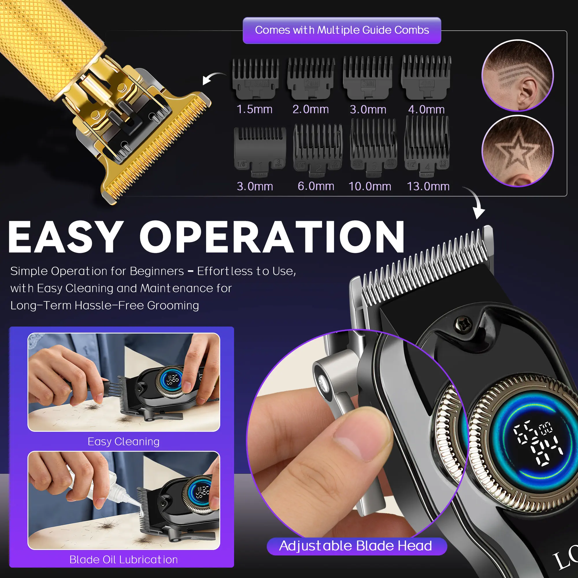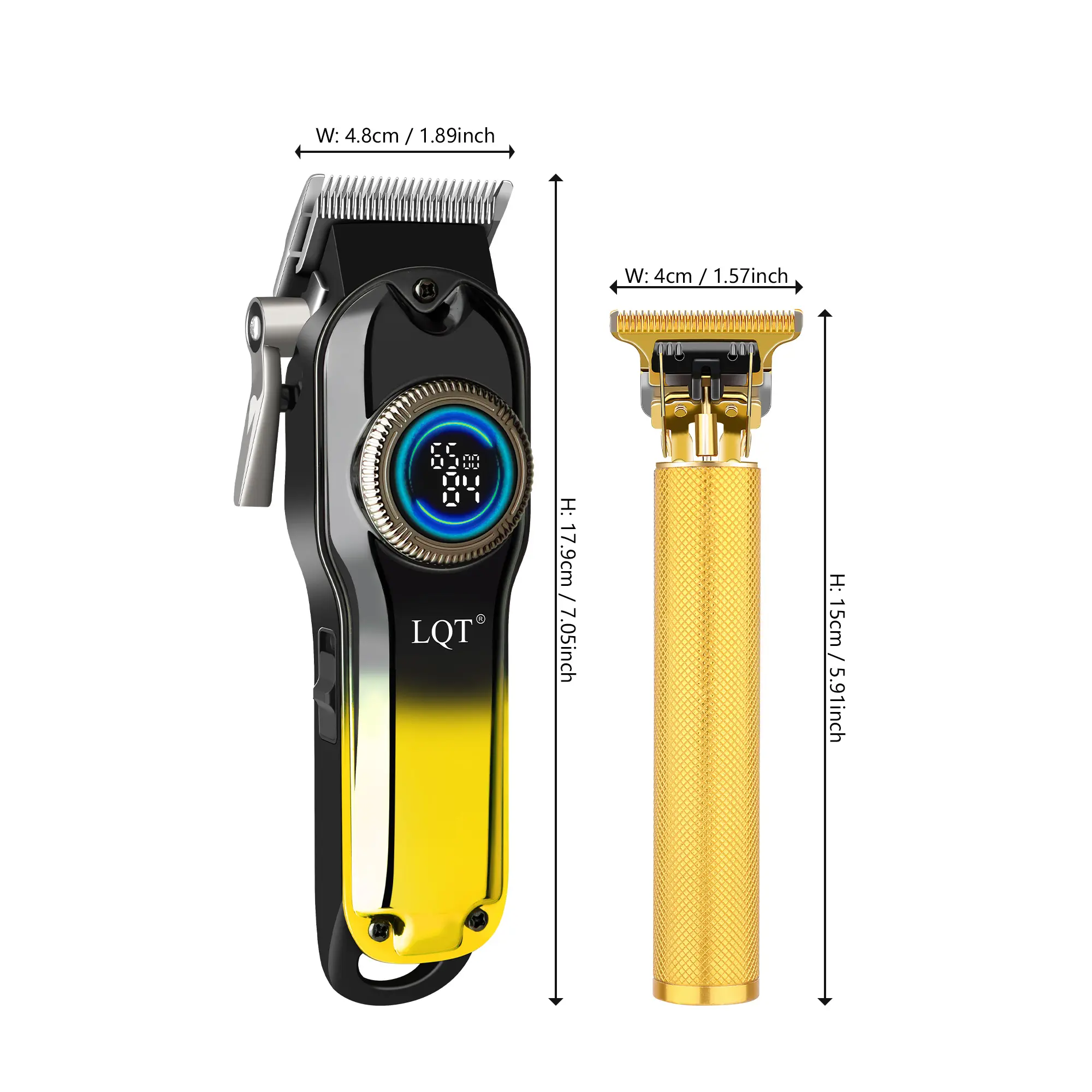 This premium gradient gold 2-in-1 grooming set blends eye-catching style with professional-grade performance. The cordless hair clipper features a circular LCD display for real-time battery and speed monitoring, delivering smooth, precise haircuts and fades with zero tugging. The gold T-blade trimmer creates sharp, clean edges and detailed beard shaping, perfect for both professional barbers and at-home DIY users.