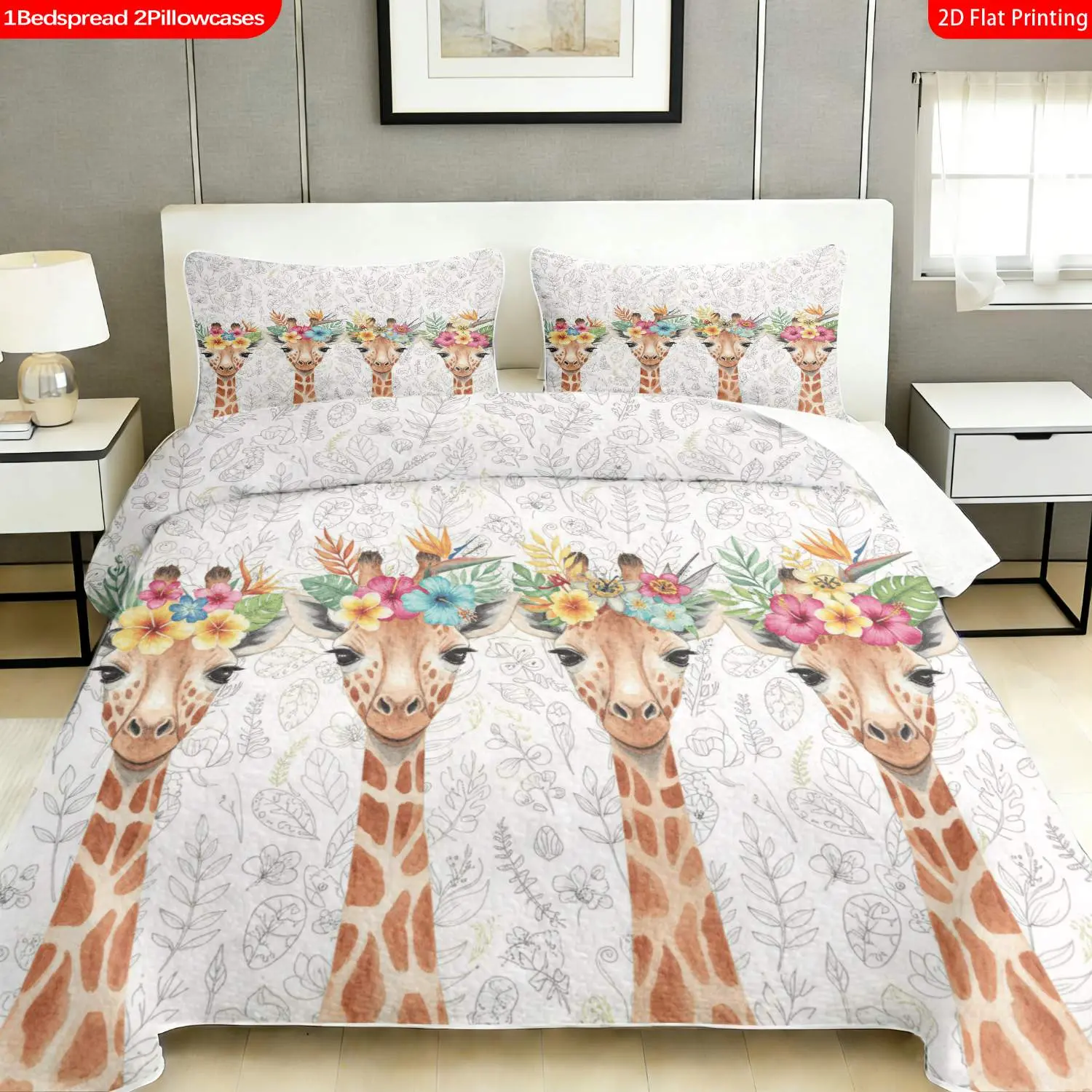 3 pcs, 2D flat print Watercolor Giraffe Floral Crown Bed Cover Set, Multiple Sizes Available, Bedding Set, All Seasons, Gift for Loved Ones(1 bedspread , 2 pillowcases)