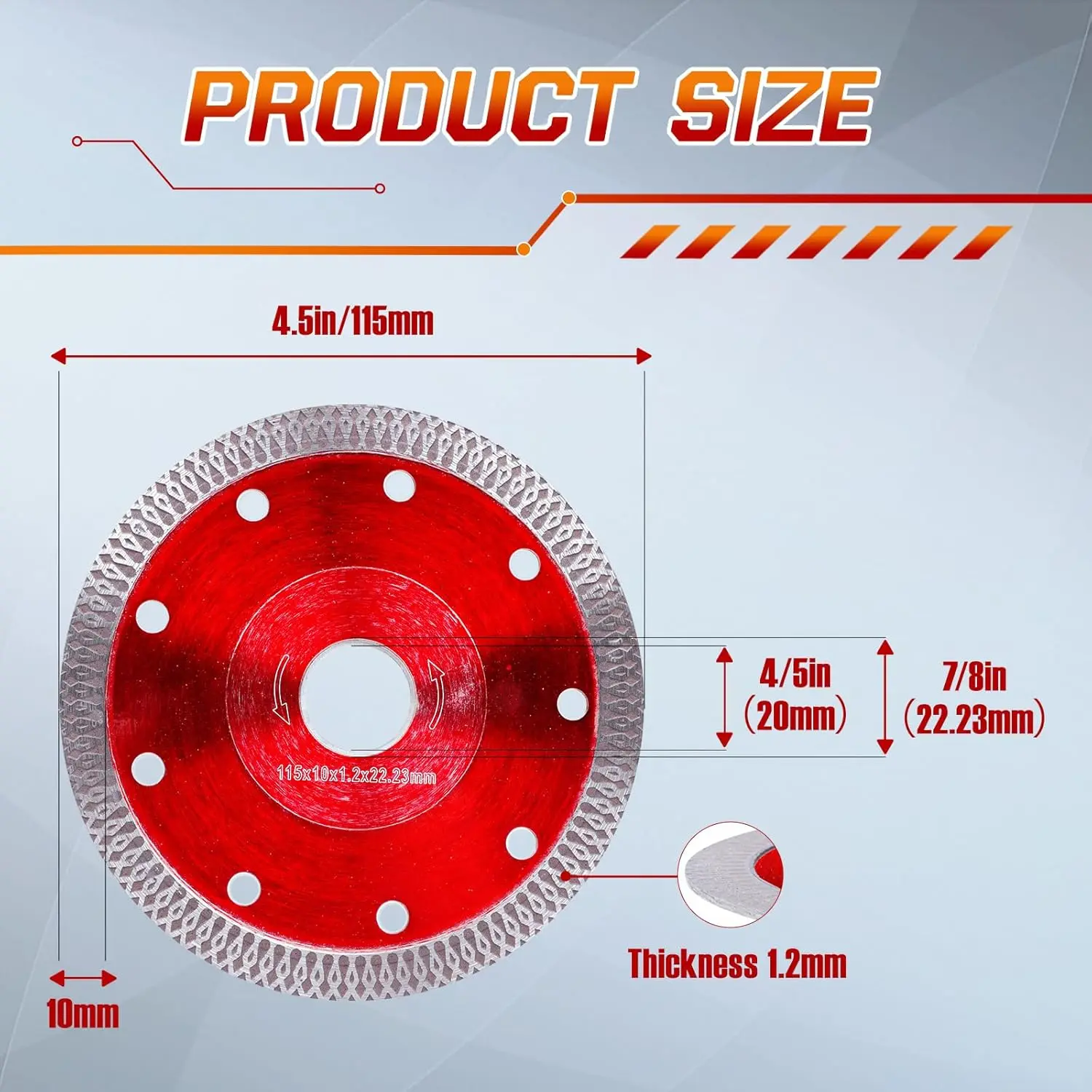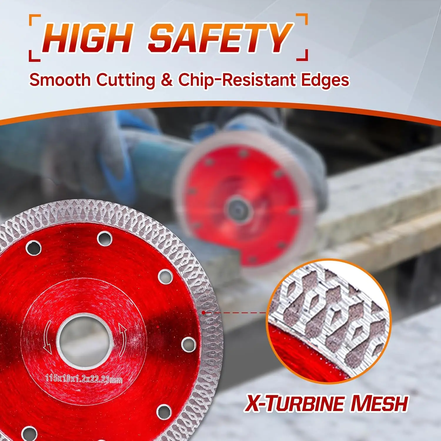 Achieve Clean, Precision Cuts This super thin 4-1/2 inch diamond blade features an innovative X-teeth turbo mesh rim, engineered for fast and smooth cutting through porcelain, ceramic, and granite.Its ultra-thin design minimizes chipping and material waste, ensuring clean edges for professional-looking results on every project .