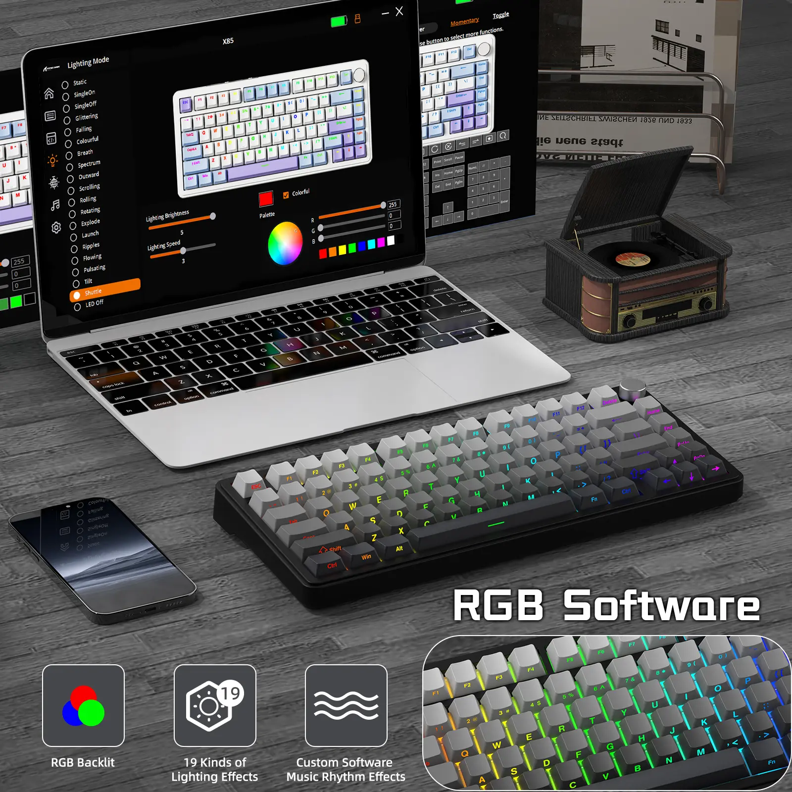 ·【75% ANSI Layout & Knob Design】X85 wireless keyboard is a premium mechanical keyboard for both work and game. Adopts the most popular 75% AINSI layout, features a layout of 81 keys + 1 control knob, making it a practical choice for work/gaming. It retains essential arrow and function keys while freeing up desk space.Easy control with the built-in volume knob maded from high-grade CNC aluminum.Press the knob to switch the light and rotate left/right to adjust the volume.