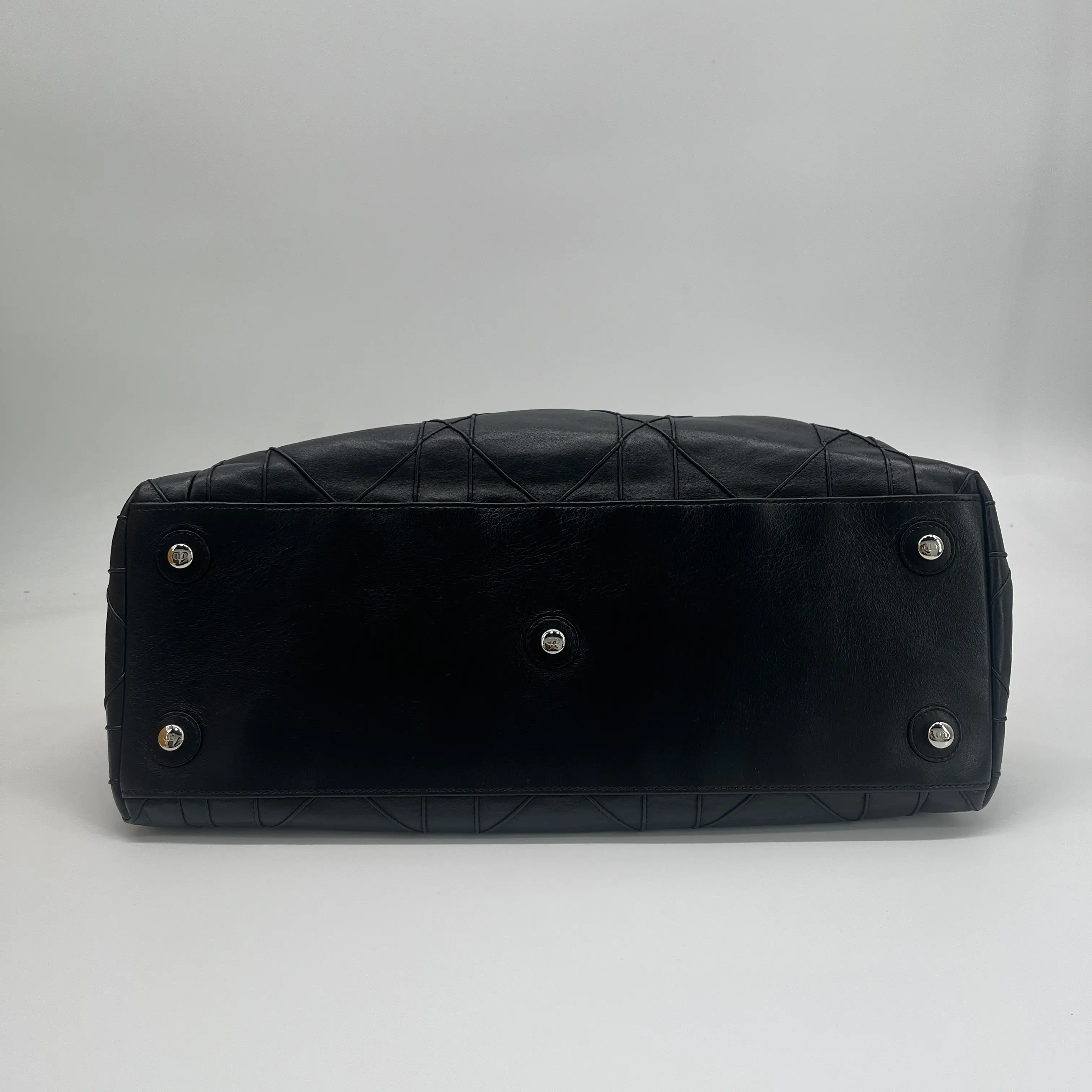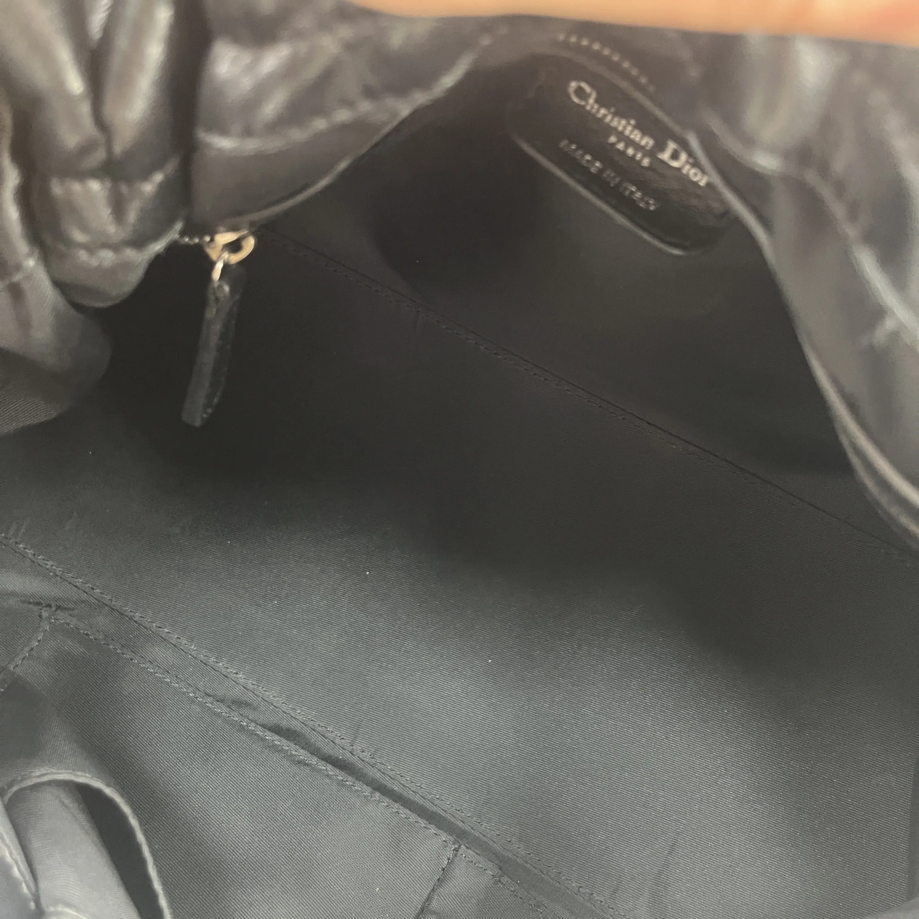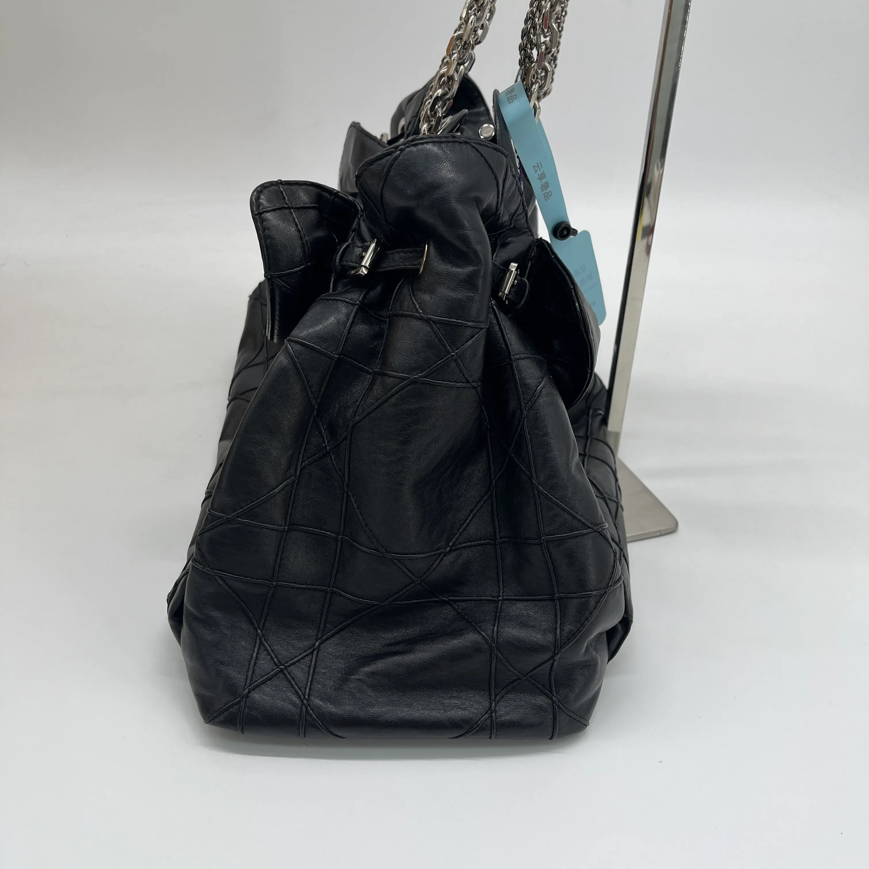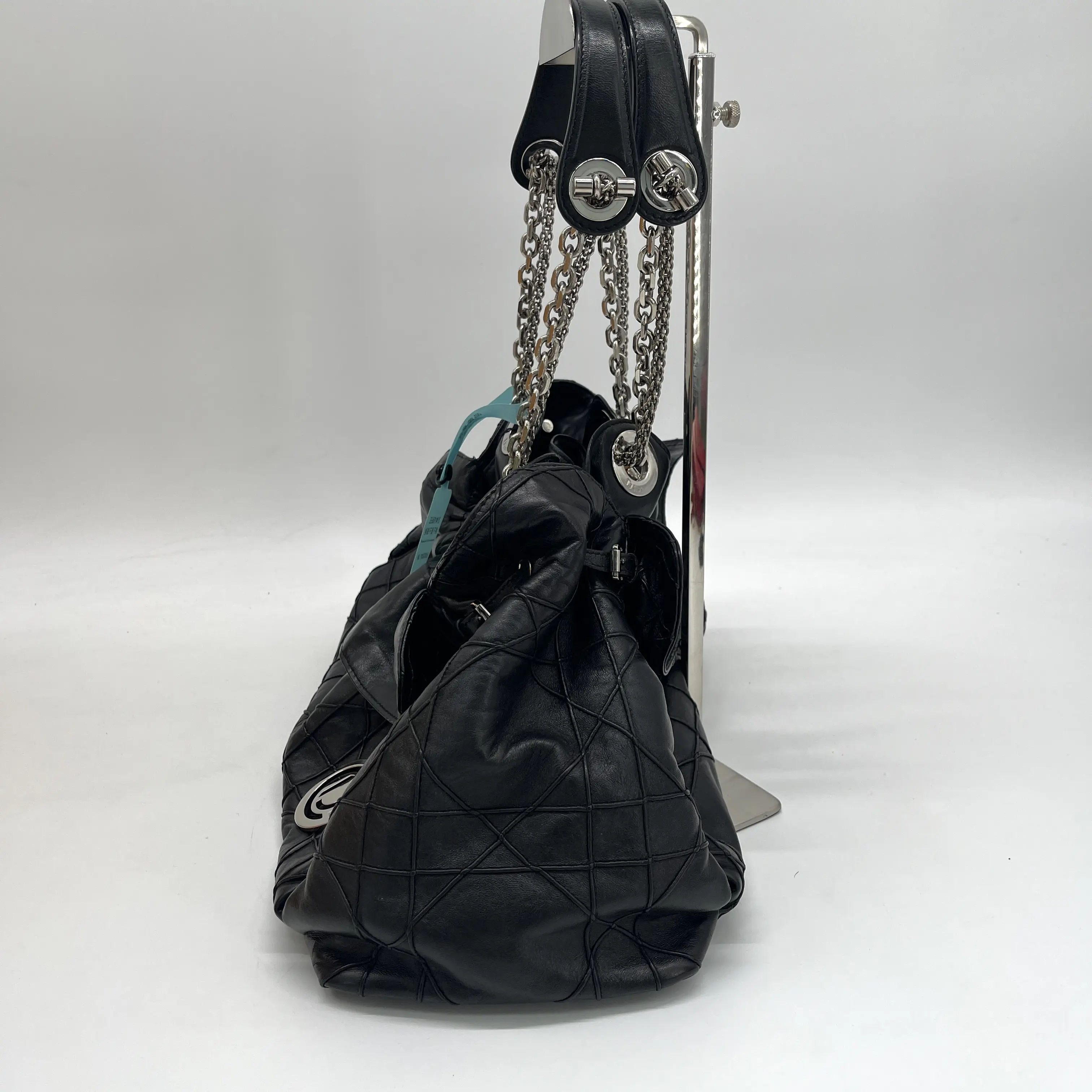 The Christian Dior Le Trente Black Leather Quilted Shoulder Bag with a Silver Chain Drawstring strap is a luxurious and stylish accessory for women.The bag features a classic black leather exterior with a quilted pattern and silver hardware accents. It comes with a shoulder strap handle in a combination of black and silver, a leather lining, and bottom studs for added durability.