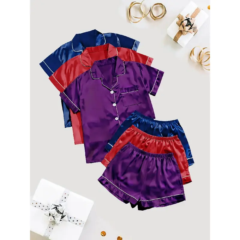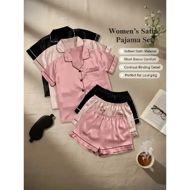 Women's Solid Satin Pyjama Set, Short Sleeve Button Front Lapel Shirt & Contrast Binding Shorts PJ Set, Summer Sleepwear Set, Pajamas, Silky Satin Pajama
