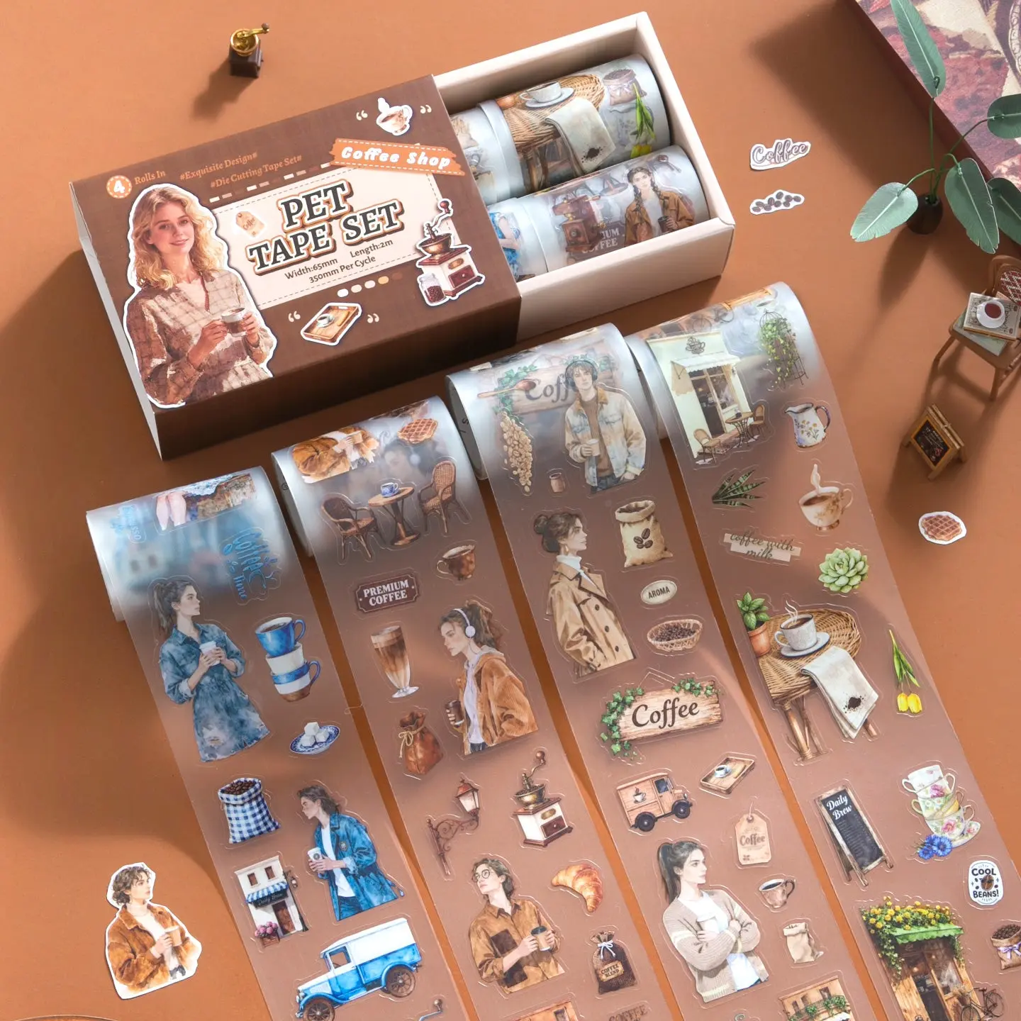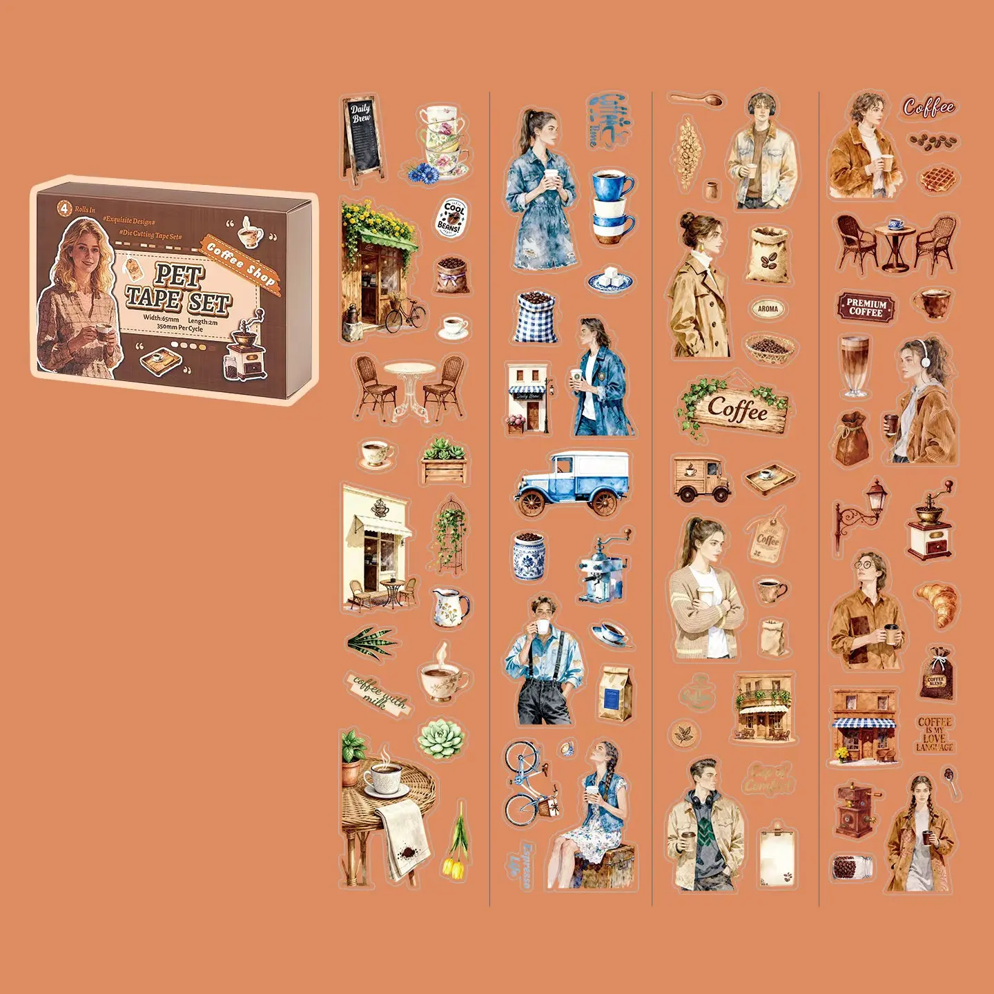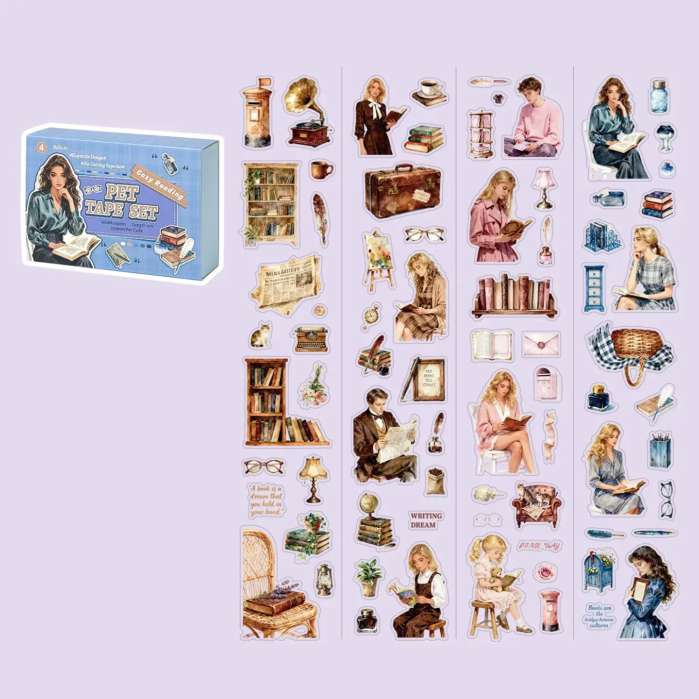 Add an elegant vintage touch to journals, planners, scrapbooks, and creative paper projects with this beautifully designed die-cut PET tape set. Each themed box includes 4 wide transparent PET tape rolls with detailed illustrated motifs that create a layered, collage-style effect. Choose Coffee Shop for warm cafe-inspired scenes, coffee cups, pastries, and cozy lifestyle details, or Cozy Reading for bookish artwork, reading moments, writing accessories, and soft literary decor.