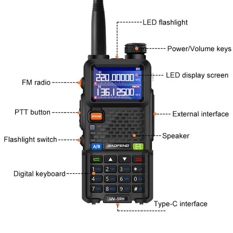 2. Display content: Dual frequency independent display (can display two operating frequencies simultaneously), frequency numbers, operating modes, signal status, etc