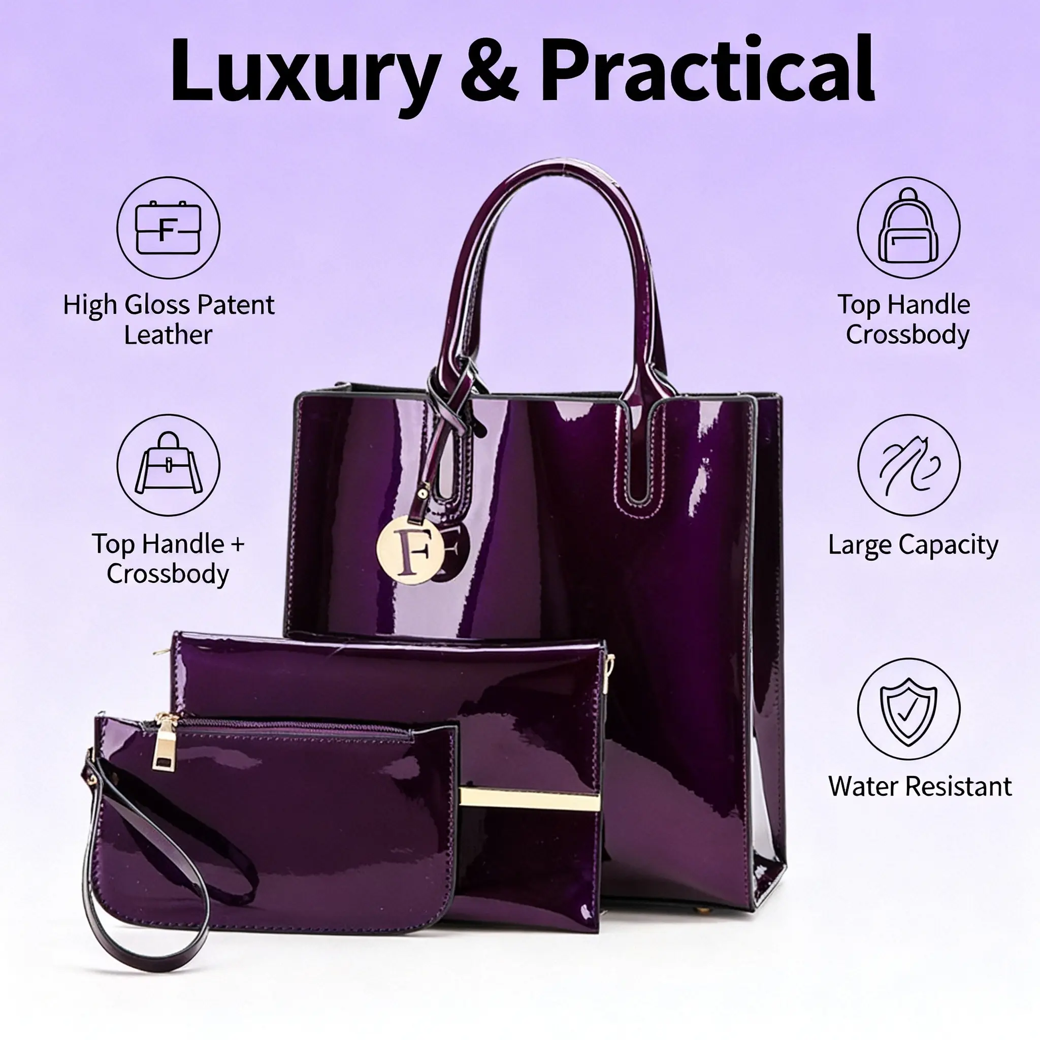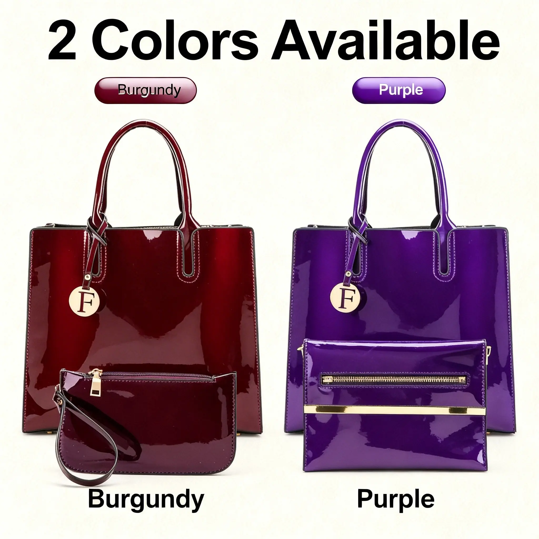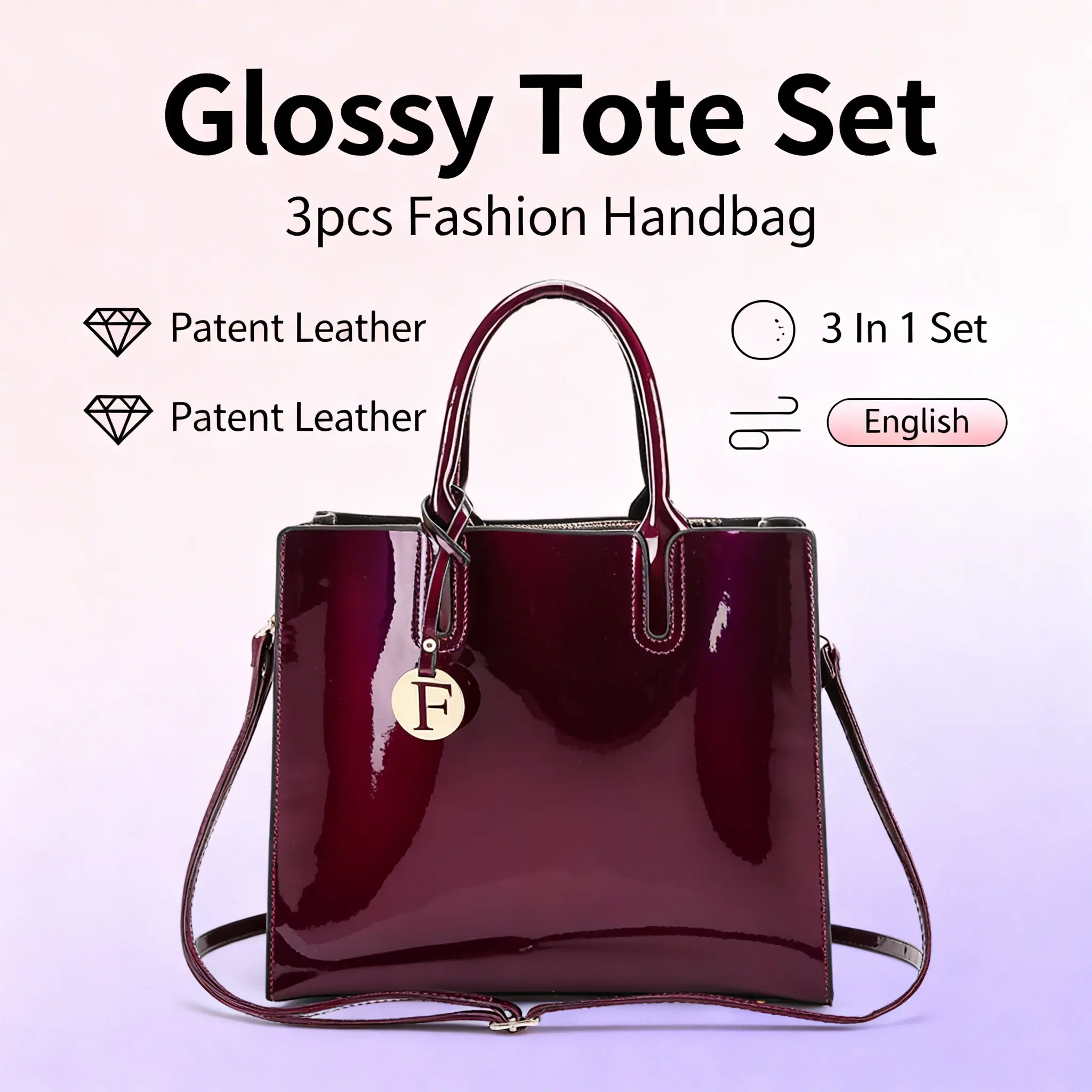 Women's Glossy Patent Leather Tote Bag 3 In 1 Set, Luxury Large Capacity Shoulder Crossbody Handbag with Zipper Closure, Elegant Shiny Purse for Office Work Daily Use Shopping Travel, Ideal Gift for Her Women Girls Birthday Christmas Mother's Day