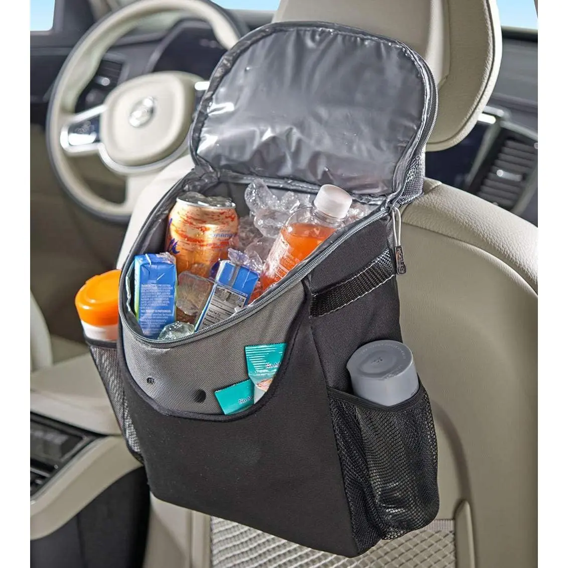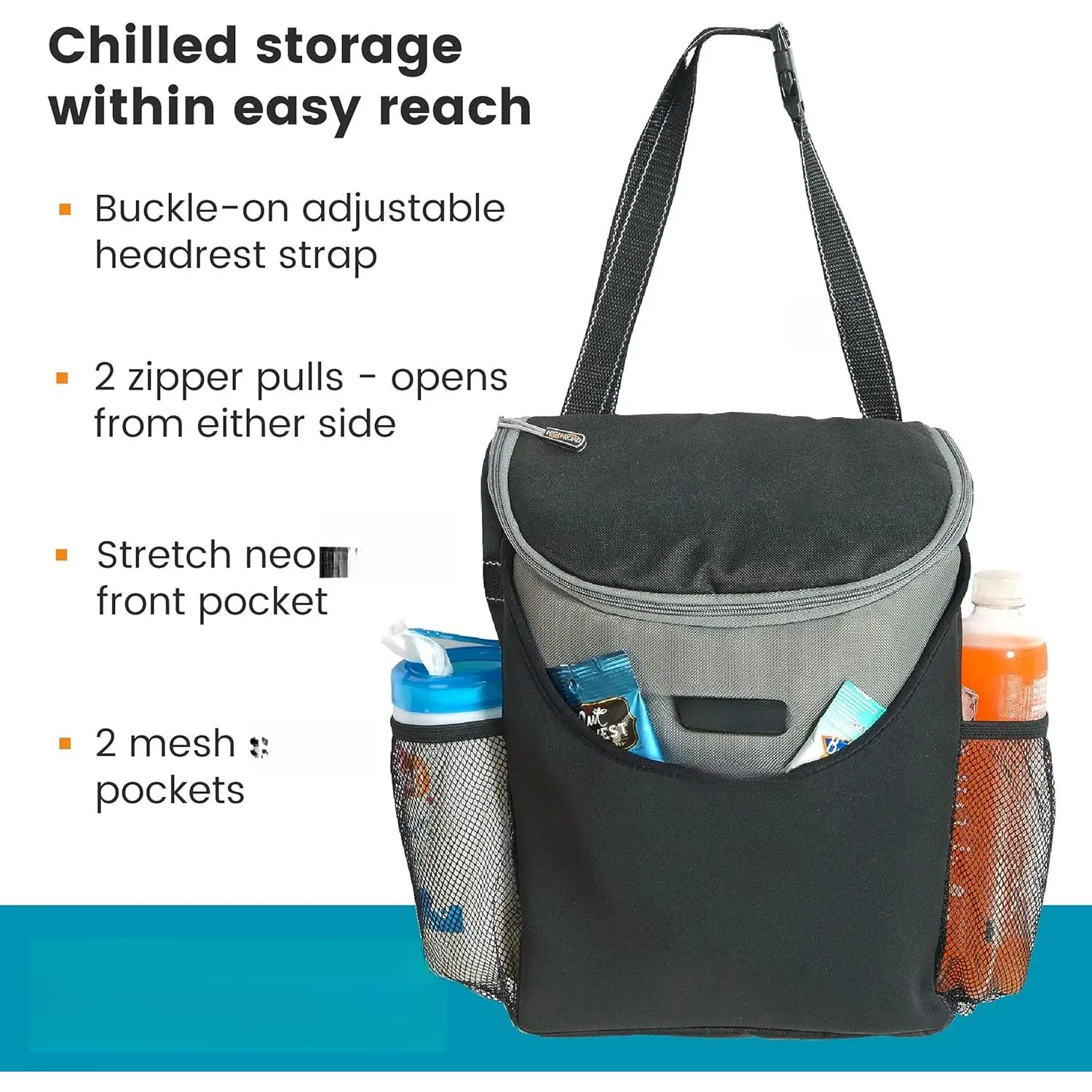 Multipurpose Seat Back Cooler Organizer - versatile car cooler and back seat organizer can be used as a soft cooler for road trips, food delivery and rideshare drivers, as a kayak cooler for the seatback or for general car storage and organization - use on the back seat for passengers or front seat for driver storage - measures 12. 5" high, 10" wide and 4" deep, holds up to eight 16 oz. bottles or a mix of cans, bottles and snacks for road trips Portable Travel Cooler for Cars, SUVs, Trucks and Boats - waterproof neoprene body and insulated PEVA lined interior keep drinks and snacks cool for up to 30 hours and hot foods warm up to 8 hours - chill time will be lower in temperatures over 70 farenheit and warm time lower in temperatures under 50 farenheit Drink Cooler and Snack Organizer for the Front or Back Seat - perfect for long drives and road workers, the SnackStash holds up to eight 16 oz. bottles or 15 cans, PEVA liner is waterproof but cooler packs are recommended over ice as the liner can be punctured by sharp utensils, can and wine openers and food storage containers Extra Storage for Road Trip Essentials - 2 mesh side pockets and wide stretch neoprene front pocket hold wipes, bottles, utensils, snacks and napkins, strap is adjustable for best reach from the front or back seat, and can be used as a shoulder strap at picnics and sports events and at the beach Durable Construction and Universal Fit – woven polyester strap buckles around any headrest post, neoprene and 500D polyester, easy wipe-clean interior, PATENTED by in Portland Maine, developing clever car organizers since 1990