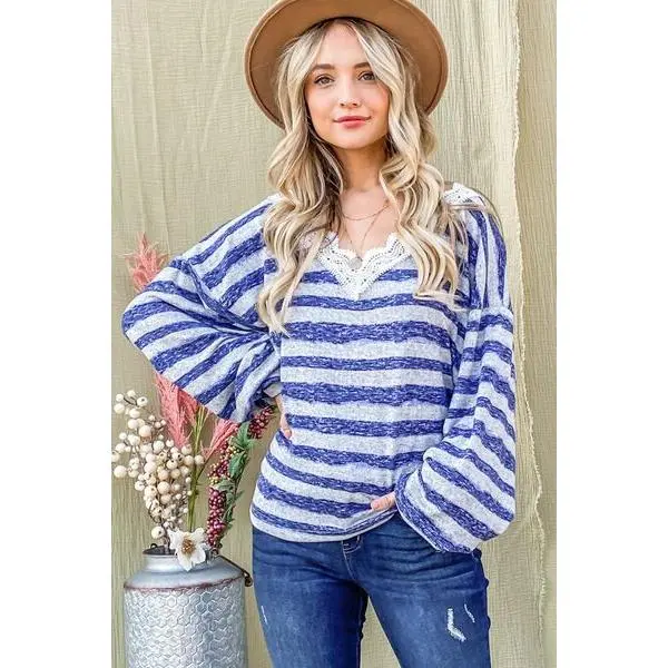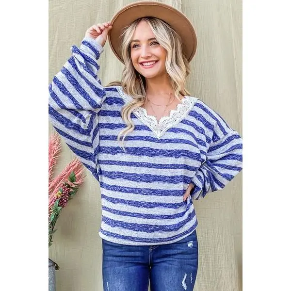 This Striped Lace Detail V Neck Top is a chic piece that adds a touch of sophistication to your wardrobe. The striped pattern gives it a timeless and classic look, while the lace detailing adds a delicate and feminine touch. The V-neckline is flattering and versatile, making it easy to pair with different bottoms. Made with high-quality fabric, this top is comfortable to wear all day long. Dress it up with a skirt or dress it down with jeans for a versatile outfit option. Elevate your style with this elegant top that is perfect for any occasion.