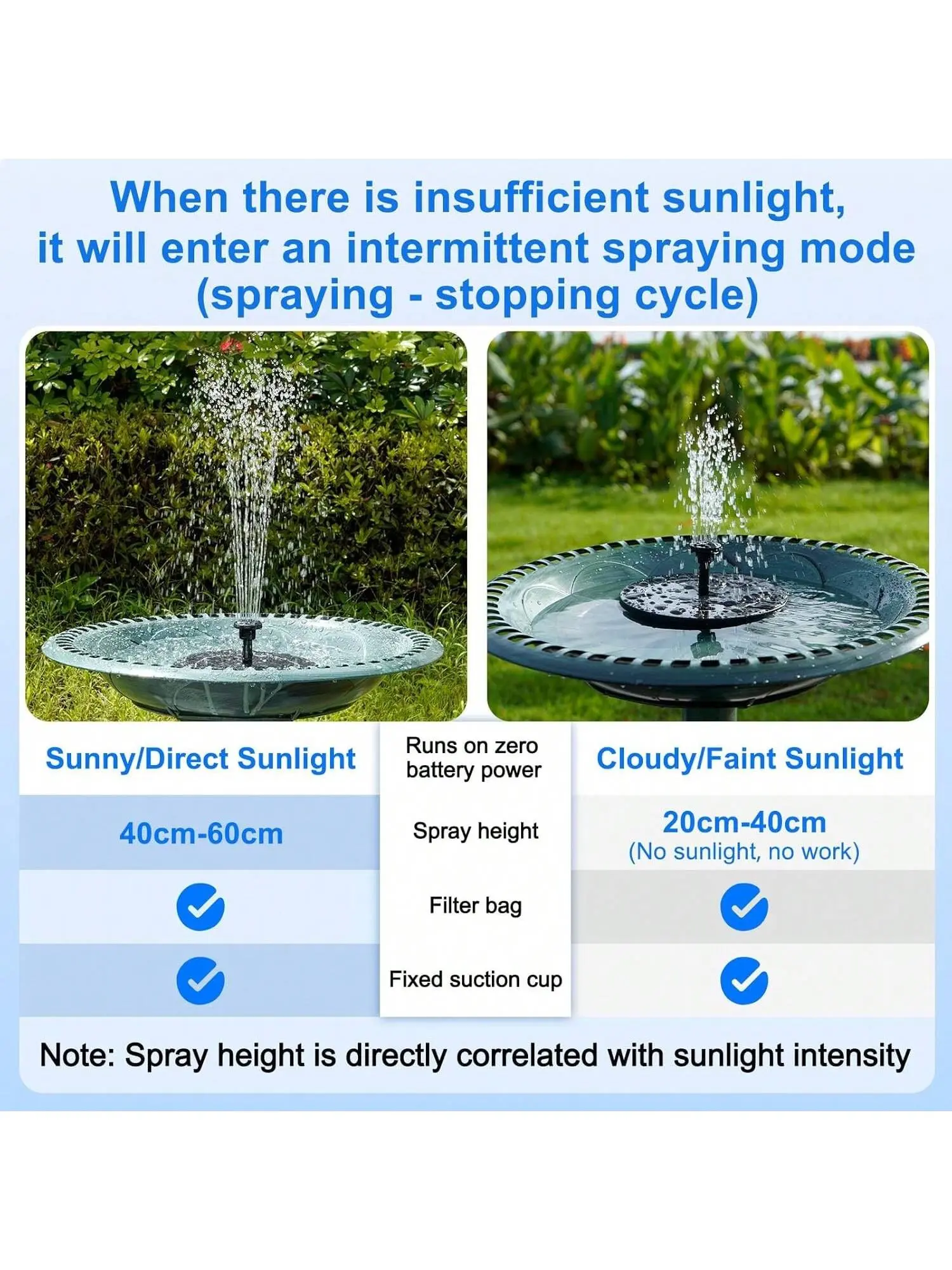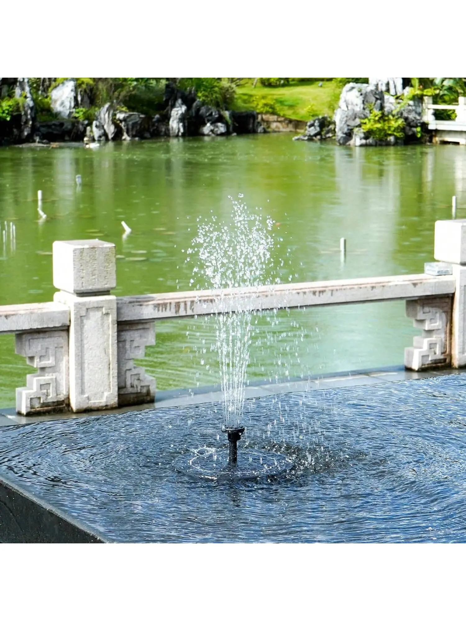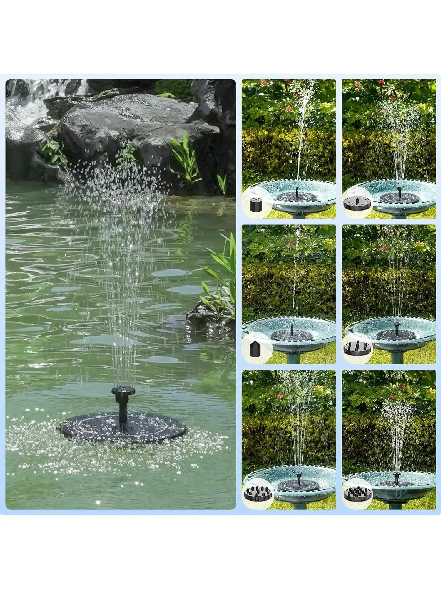 Comes with 6 nozzles. You can easily adjust the water height by changing the nozzle. The spray height is 40-60 cm. The exclusive fastener is designed to prevent the solar fountain from moving freely. Just enjoy the tranquility of the sound of water in a gentle breeze.