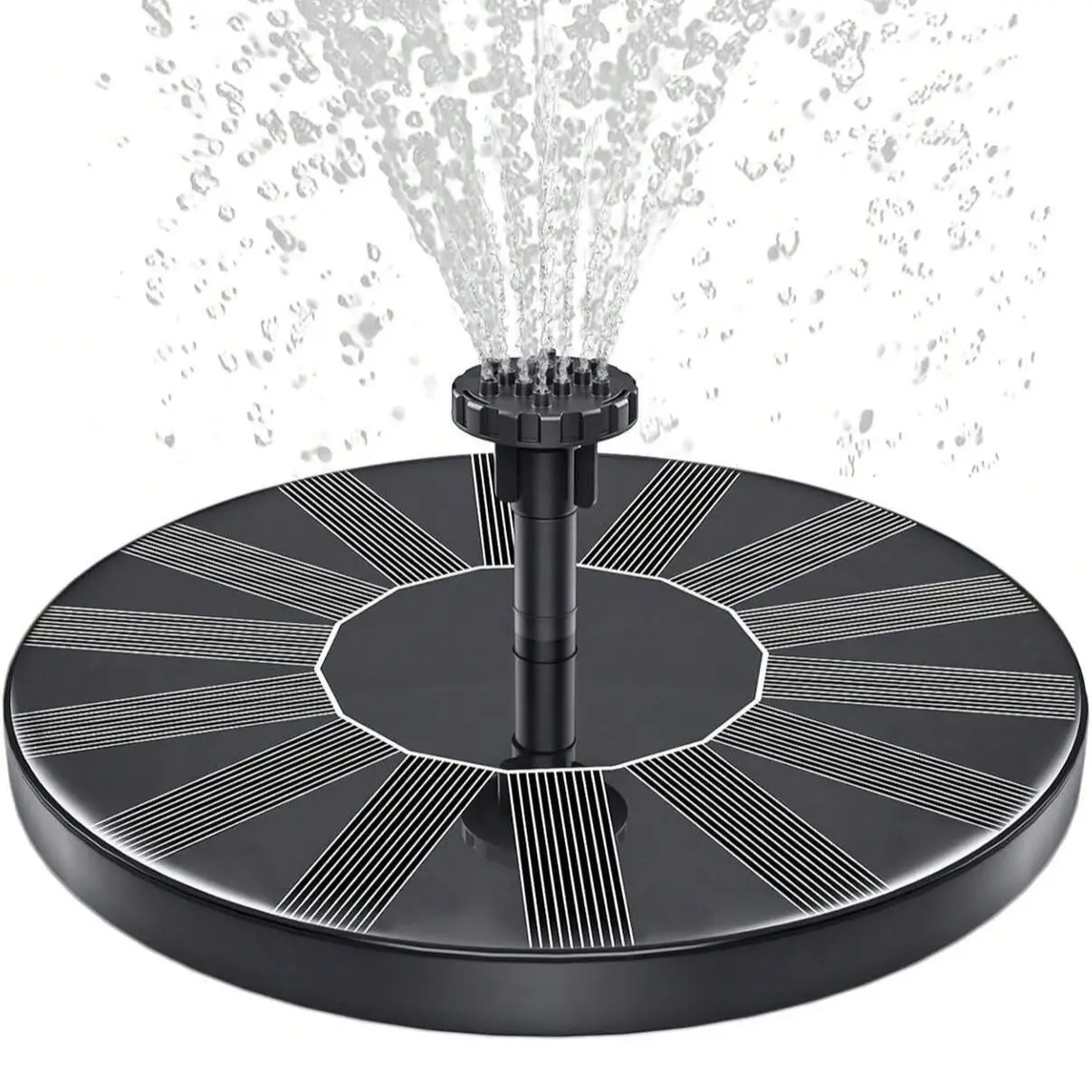 Solar fountain,1.5W solar bird bath fountain pump floating solar fountain, with 6 nozzles and fixators. Solar fountain is suitable for bird baths, outdoors, gardens, ponds and swimming pools
