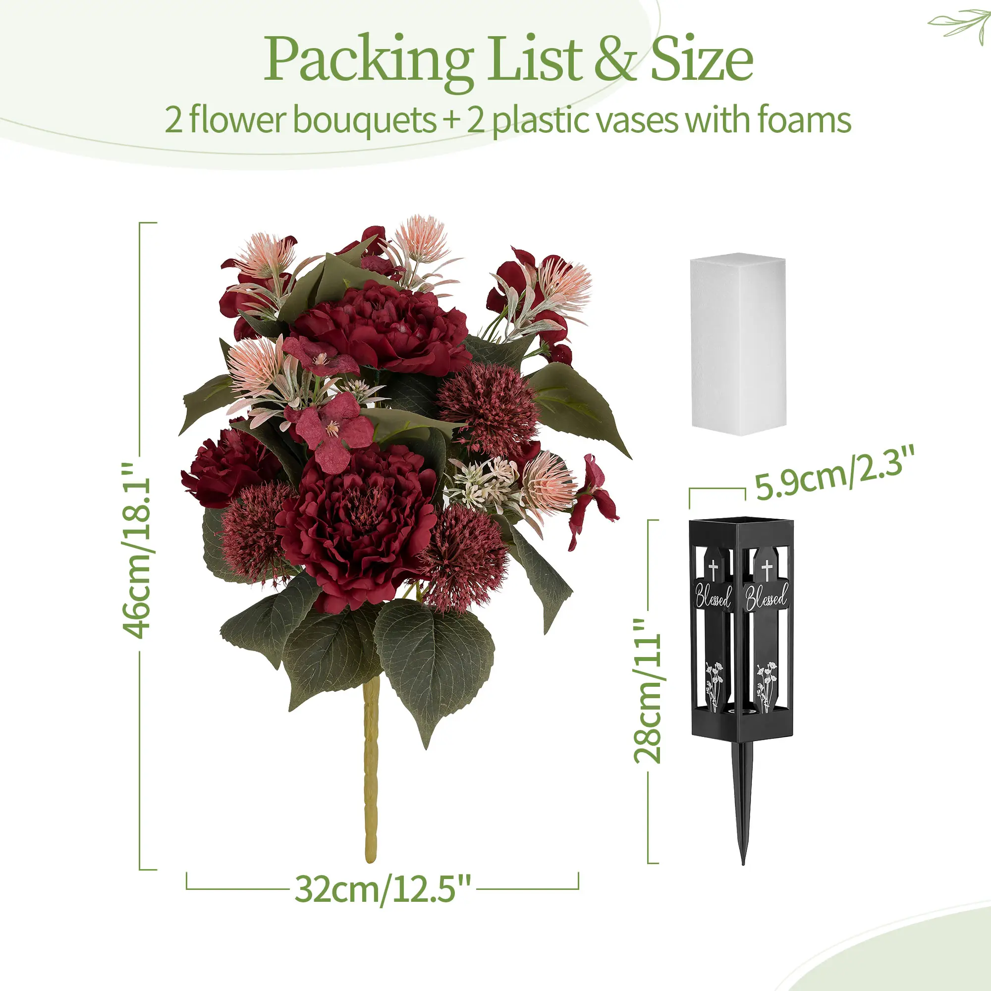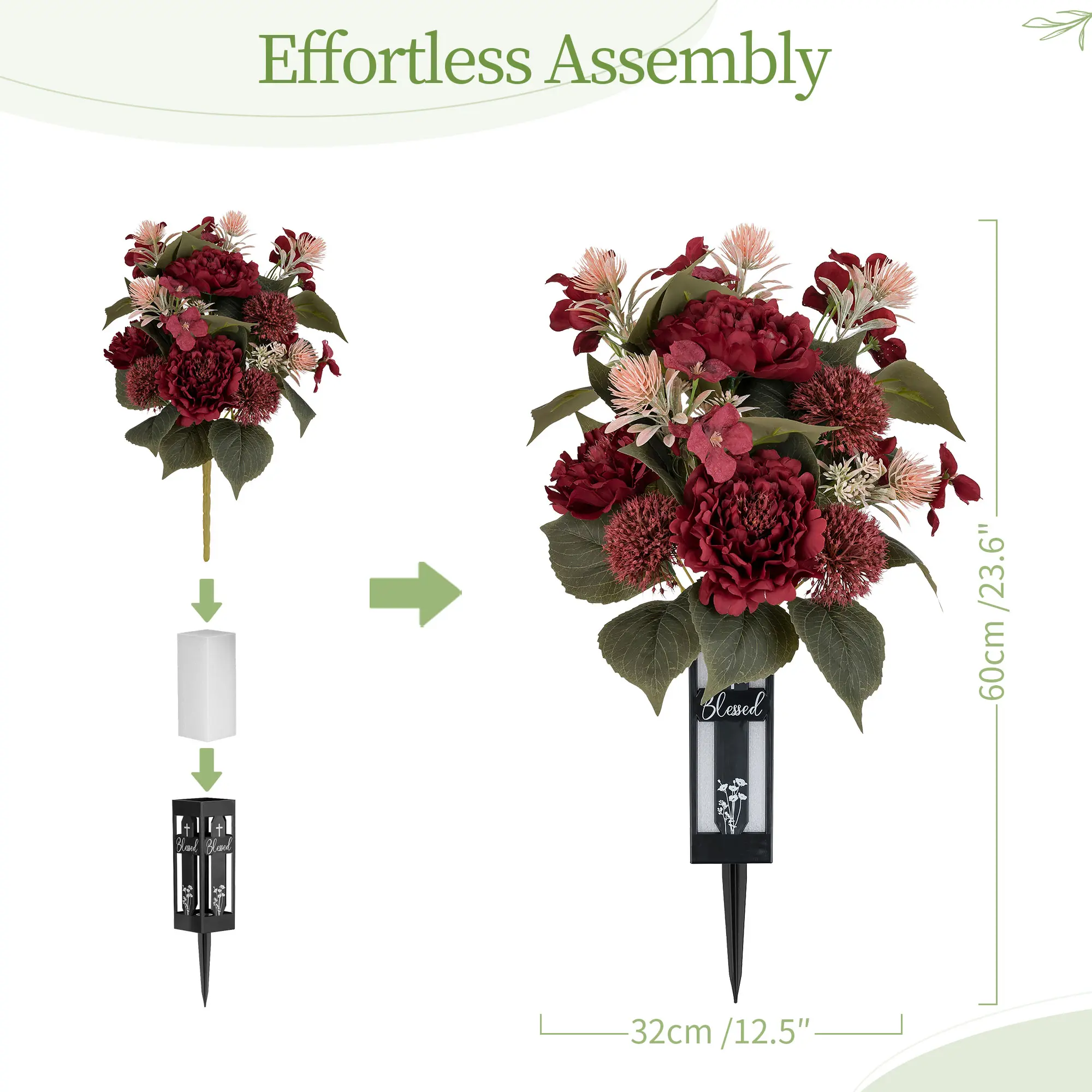 Mother's Day & Memorial Day Cemetery Flowers for Grave - Peony Grave Decorations with Vase, Lifelike Outdoor Artificial Flowers, UV Resistant & Maintenance-Free