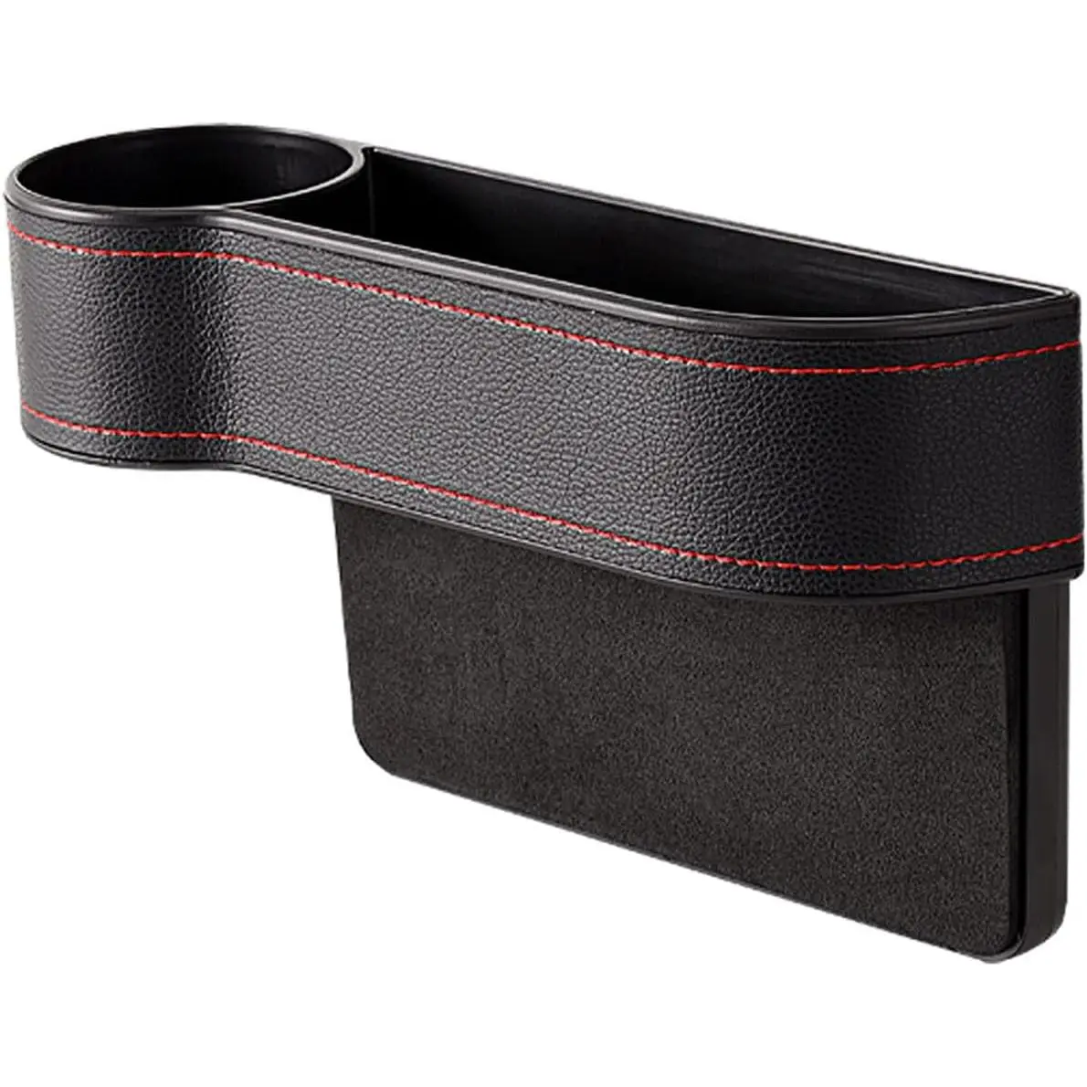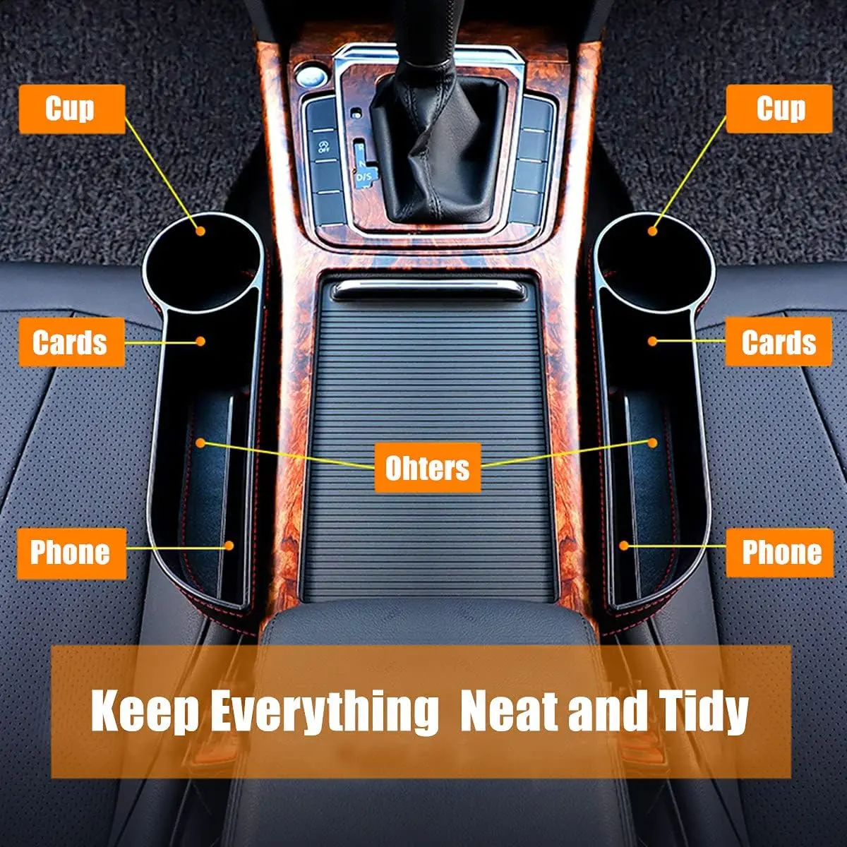 Fits perfectly between front car seats and console without affecting seat adjustment or buckle Features 2 compartments for storing small items like phone, wallet, tickets Made of durable ABS plastic and PU leather material Includes convenient cup holder and charging port Easy to install and remove by sliding it into the gap