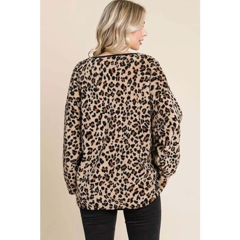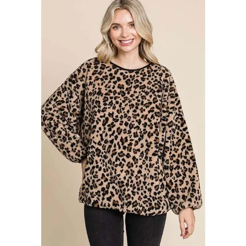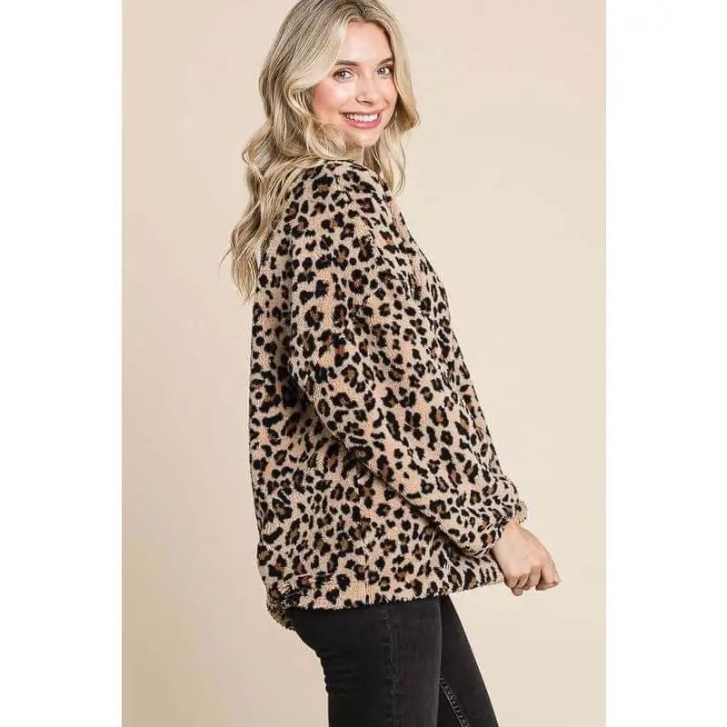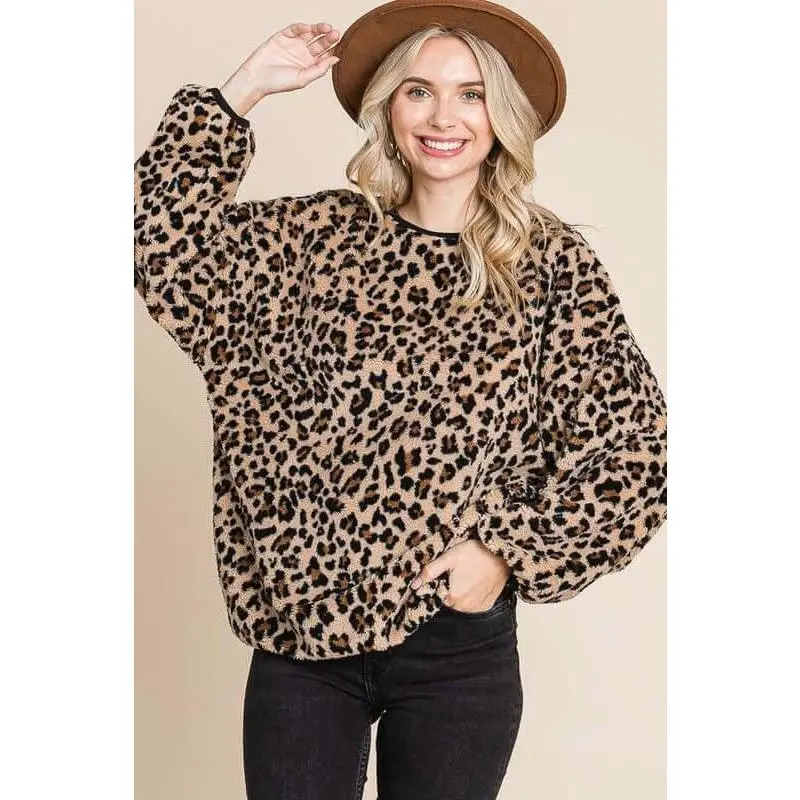 The Leopard Faux Fur Round Neck Top is a stylish and trendy piece featuring a leopard print design made from faux fur material. The round neck adds a classic touch to the top, while the faux fur fabric provides a luxurious and cozy feel. This top is perfect for adding a touch of chic and edgy style to your outfit, making it a fashionable choice for any occasion.