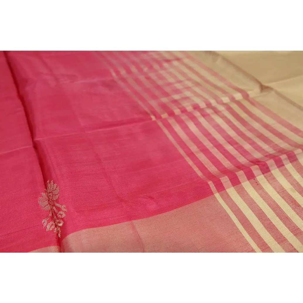 Lightweight banana-pith (vaazhai naar) saree in a soft biscuit beige shade with small all-over butta motifs and a contrast pink pallu. Traditional look suitable for festive and formal wear.