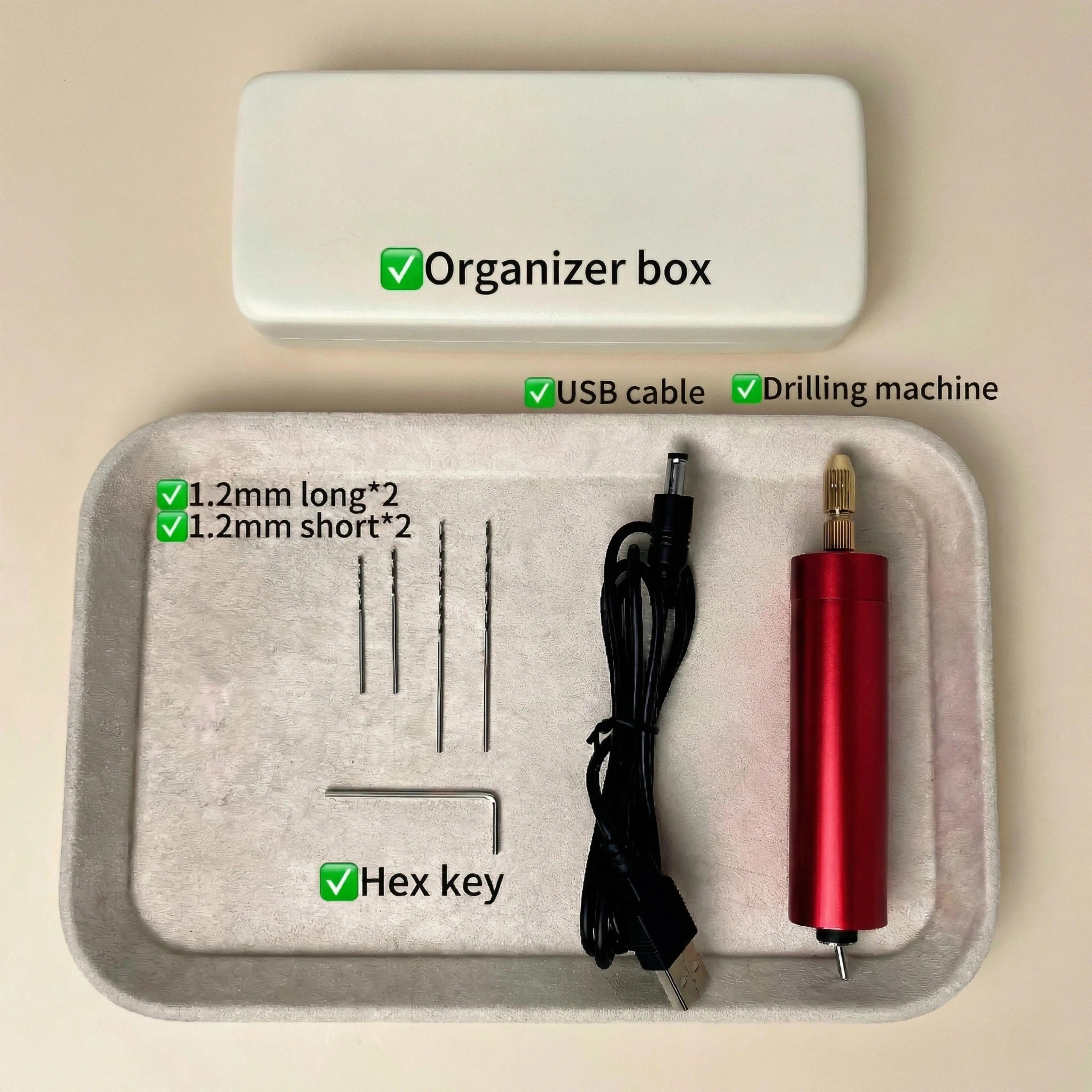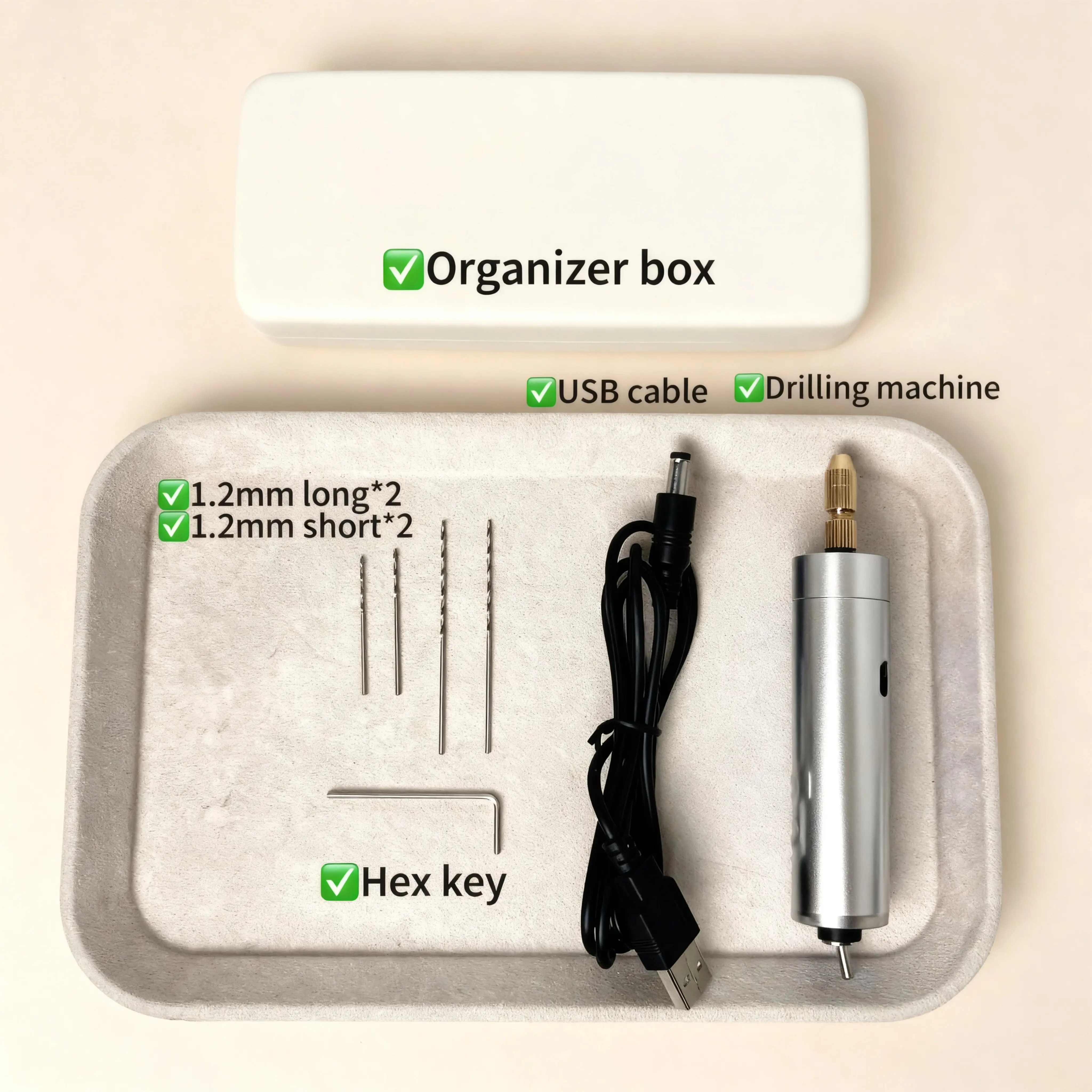 ·[Upgraded Kit for DIY Projects]This set includes 1 Electric Hand Drill , 1 USB cable,4 pcs steel drill bits(1.2mm), 1 Hex key,1 Organizer box.