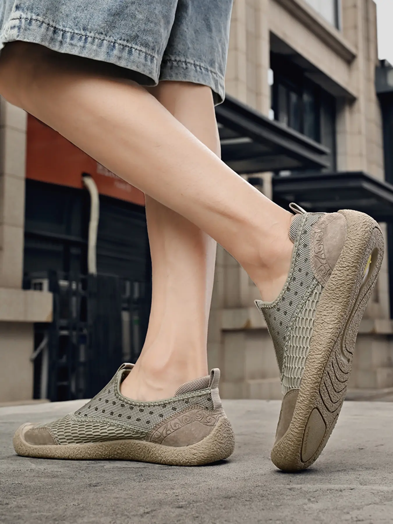 Men's Solid Color Mesh Breathable Slip-On Loafers, Soft Sole Anti-Slip Hand-Stitched Walking Shoes, Lightweight Casual Dad Shoes