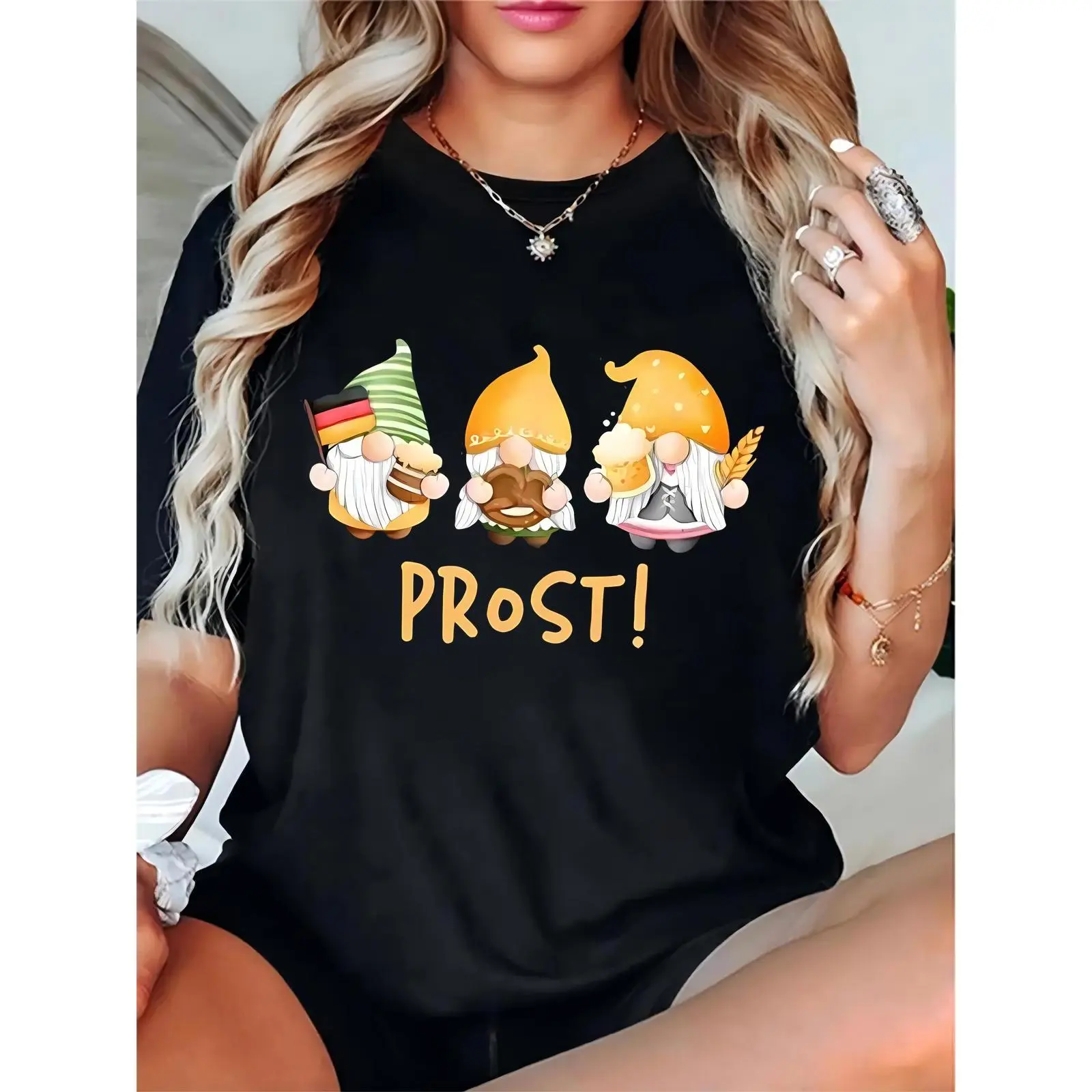 Women's Oktoberfest Gnome T-Shirt with German Flag, Beer, Pretzel & 'PROST!' Print - Casual Festival Party Daily Wear 100% Cotton T-shirt
