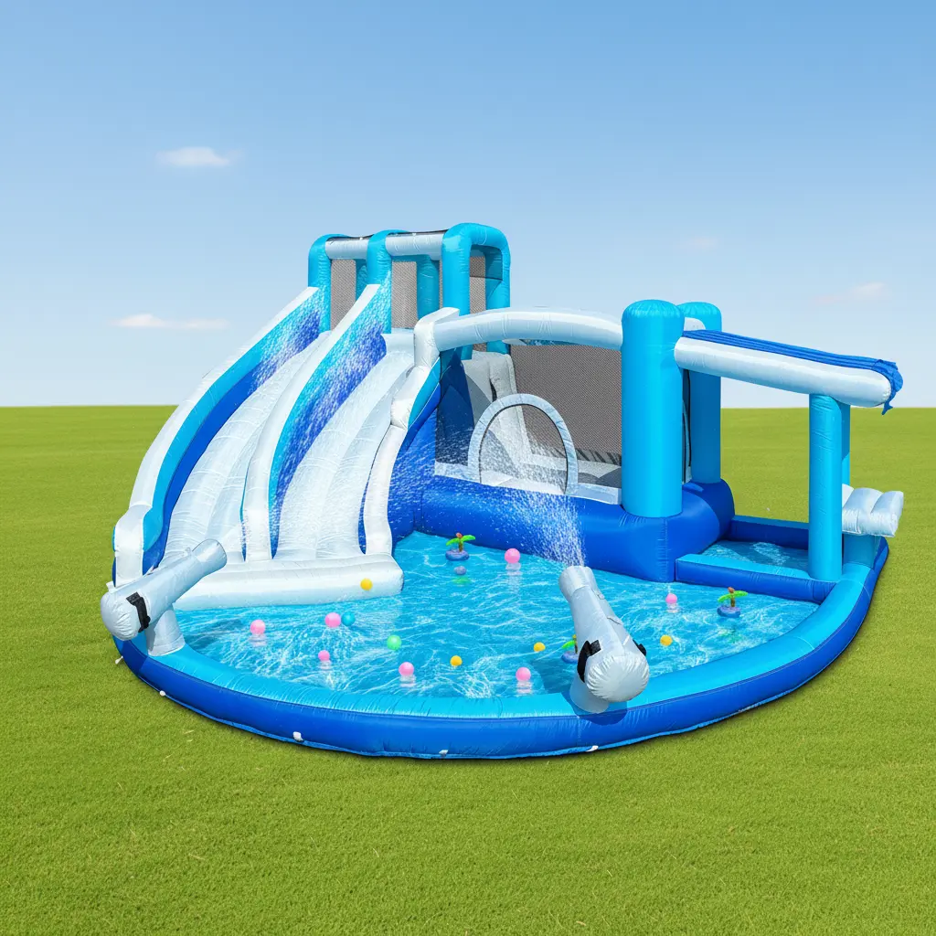 ·7-in-1 Grocery Store House: This outdoor bouncy house, designed specifically for older children, features multiple interactive play zones including a climbing area, jumping area, ball pit, and water spray zone. Featuring two age-specific slides, this inflatable bounce house measures It accommodates up to three children weighing under 99 pounds (approx. 45 kg) each to jump, slide, climb, and engage in friendly competitions simultaneously, ensuring hours of non-stop fun and physical activity.