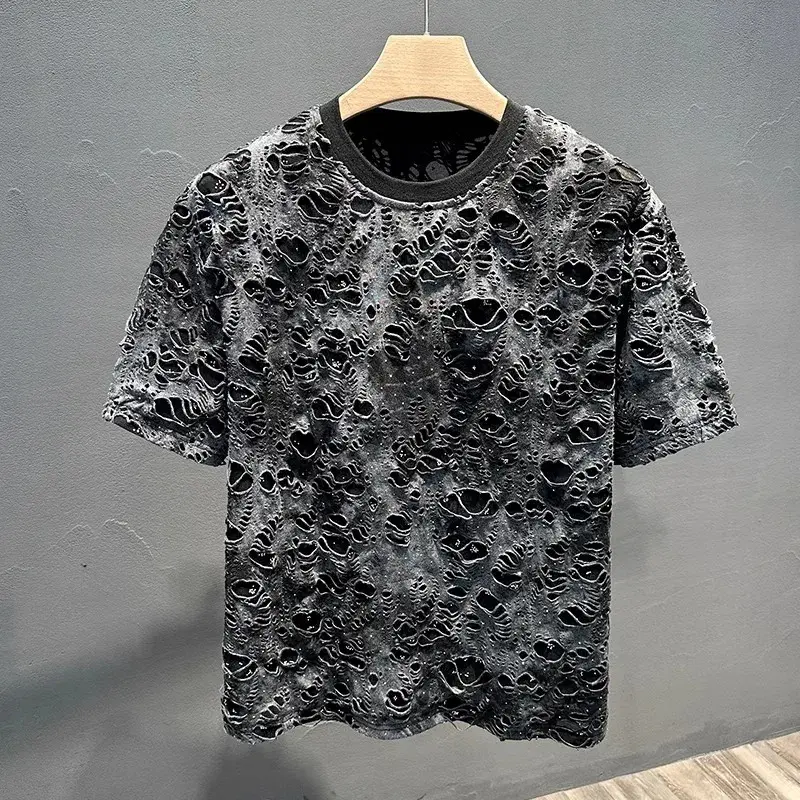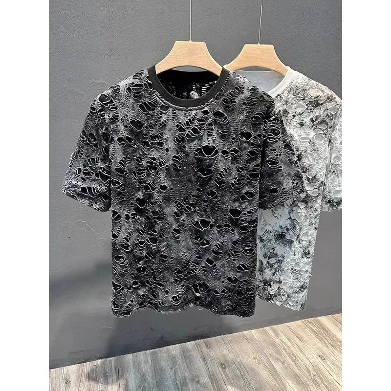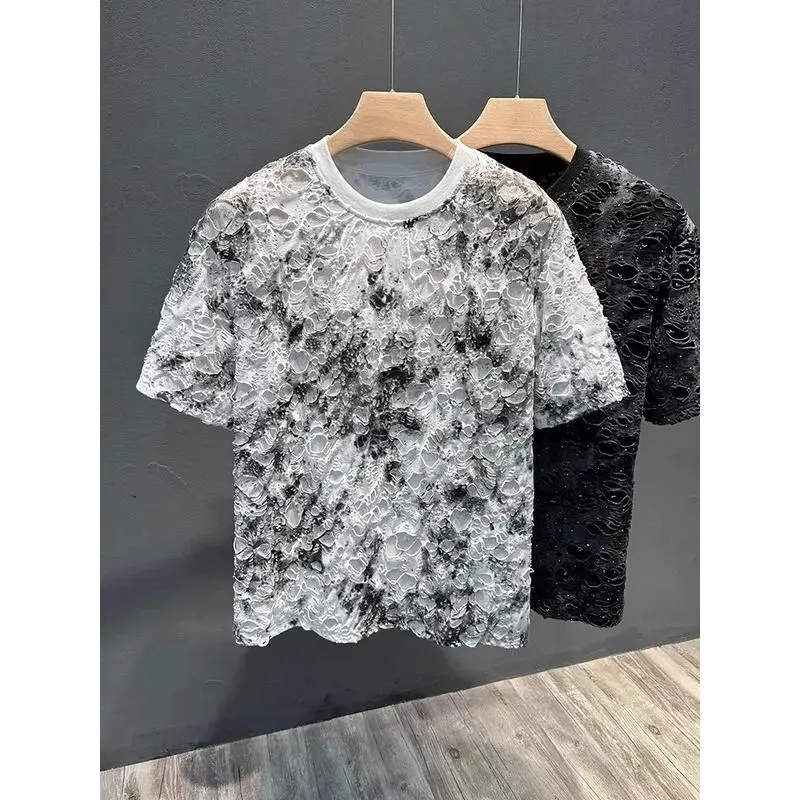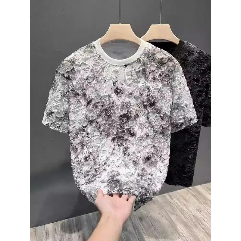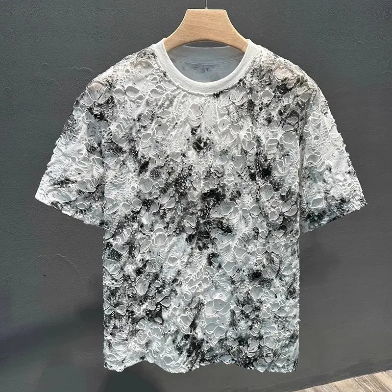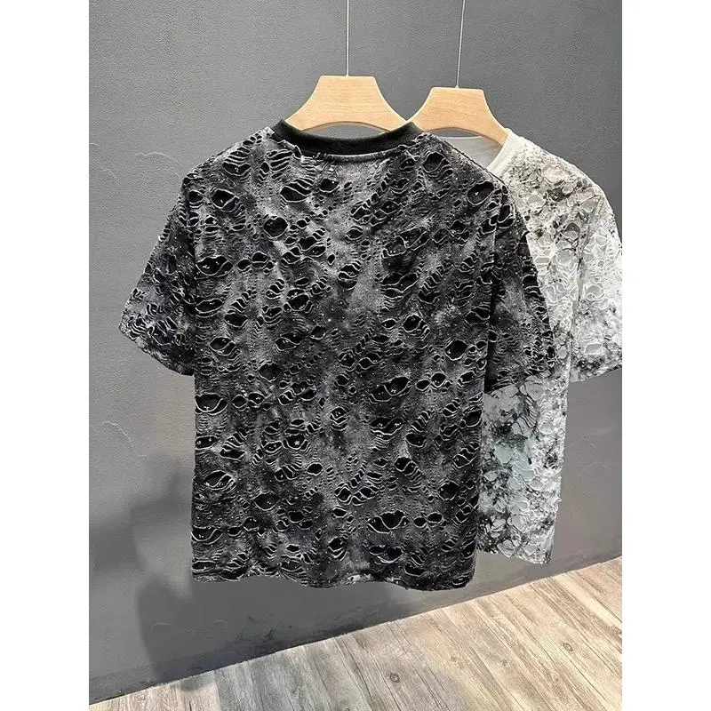 5. Summer 2026 Trendy Brand Men's T-shirt Loose Casual All-Match Tie-Dye Hole Design round Neck Short Sleeve Breathable